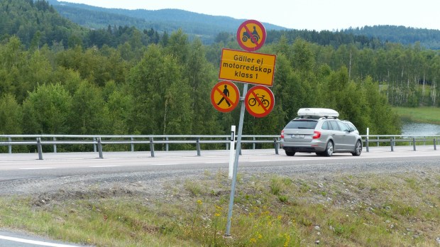 In den Städten sind Rad- und Fußwege miteinander kombiniert, das ist einerseits sehr tolerant, andererseits macht es die Verkehrsführung besonders an Kreisverkehren etwas unübersichtlich. Ach, jetzt geht es da drüben auf der linken Seite weiter, kann man das nicht vorher ankündigen??? Radfahrer dürfen auch die Fußgängerüberwege (Zebrastreifen) benutzen und brav bremsen alle Autos. Man fährt auch links gegen die Fahrtrichtung, Hauptsache die Radfahrer sind runter von der Straße … Von Süd nach Nord bis hoch oben nach Haparanda an der finnischen Grenze wird das Land von der E 4 durchpflügt, die meist auobahnmäßig ausgebaut ist und oft ist dann natürlich Radfahren dort verboten. Es wäre auch nicht sehr attaktiv angesichts der  Verkehrsflut. Dies führt nun aber  dazu, dass man mehr oder weniger große Umwege fahren muss. Über nette Sträßchen, die alte Reichsstraße oder aber auch ungepflasterte Waldwege (also fester Lehm mit etwas Schotter und zum Glück  wenigen Schlaglöchern). Dafür aber munter hoch und runter über die Berge. Die ragen zwar topografisch nicht sehr hoch, aber es fühlt sch für mich an wie in Ontario. Und es zerrt an meiner Kondition, wenn ich mal wieder schieben muss, weil ich unterhalb von 5,5 km/h den Lenker  nicht mehr gerade halten kann.