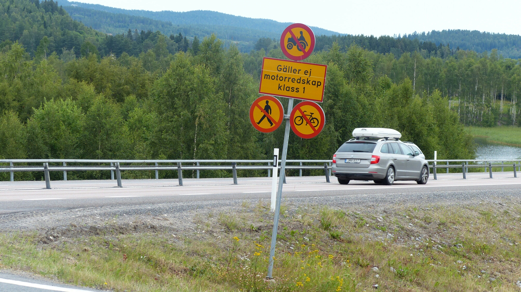 Heute kam ich an den Punkt, and dem ich definitiv auf die Autobahn MUSSTE. Sonst wäre der Umweg riesig geworden. Und siehe da, wenn man muss, darf man auch. Zumindest fehlt dann das Radverbotsschild. Aber eben auch ein passabler Seitenstreifen. Also immer schön auf den 20 cm rechts der weißen Linie lang balancieren, was bergauf ein richtiger Drahtseilakt ist. Zum Glück wurden die schwedischen Autofahrer zur höflichen Rücksichtnahme erzogen, sie lassen auf „normalen“ Straßen schon mal 2 m Platz beim Überholen. Aber auf der E4 kollidieren Enge und Tempo. Nach etwa 12 km ein Schild: Campingplatz! Mir reichte es erst mal. Nichts wie runter!