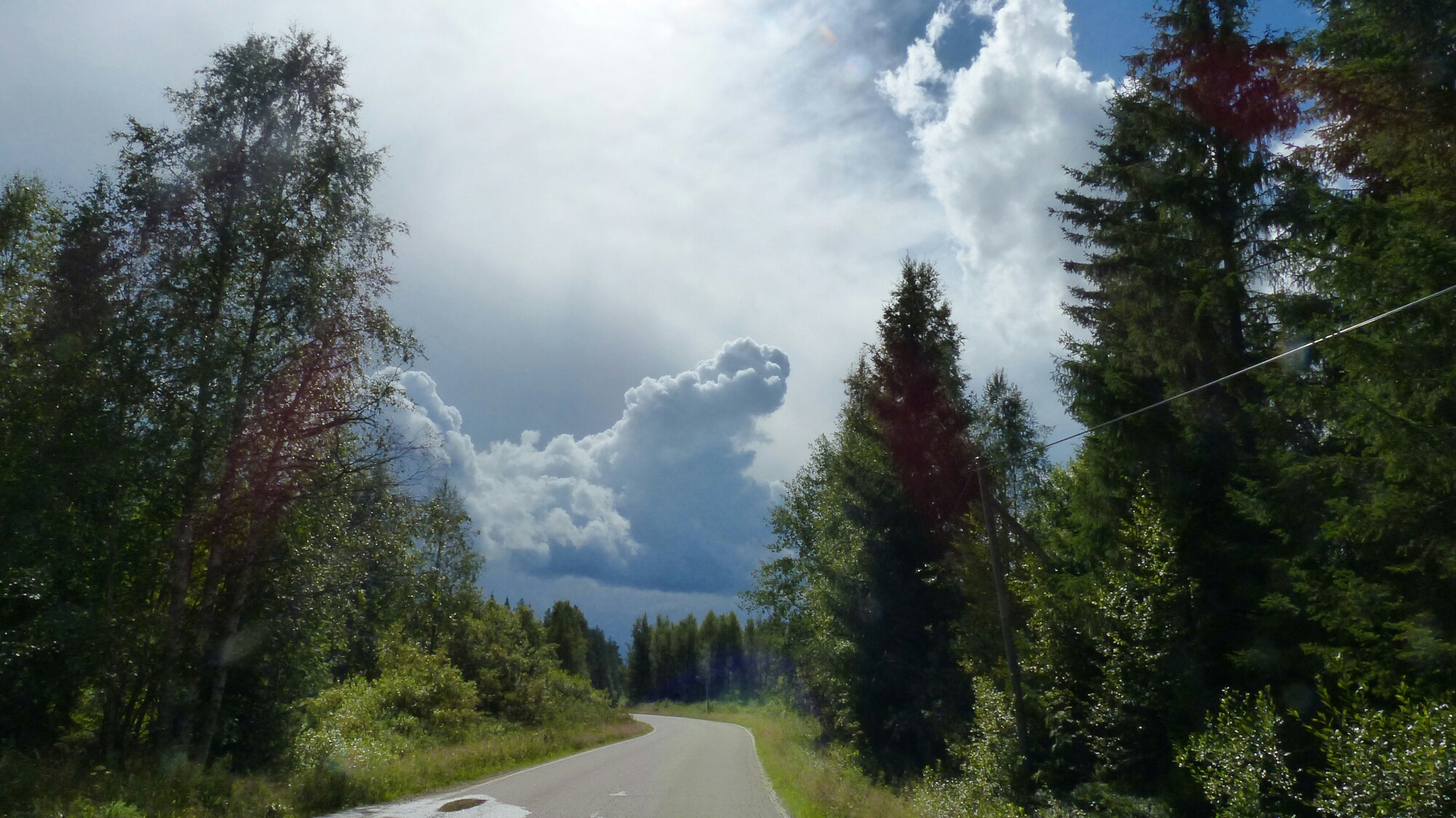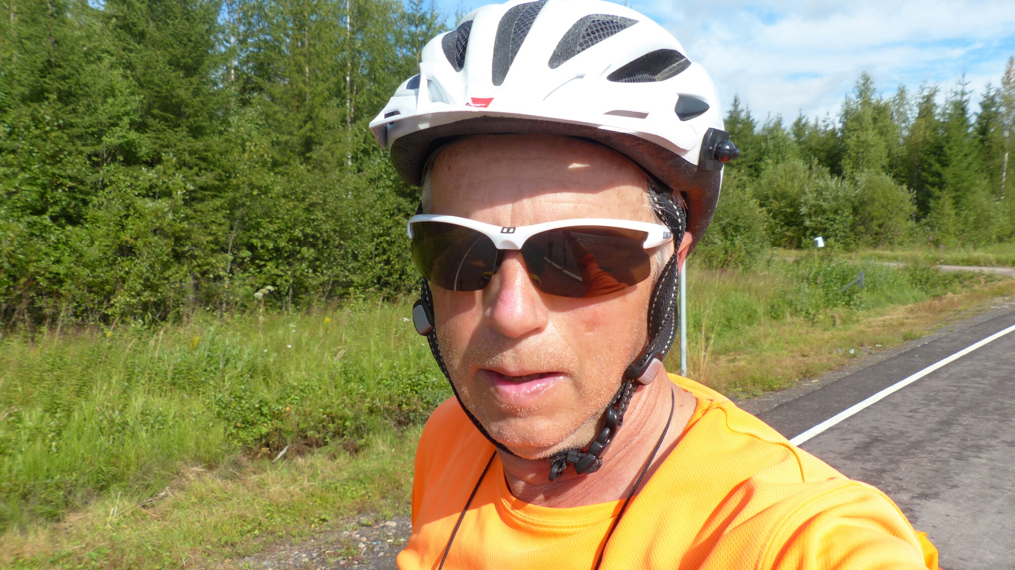 Die andere Herausforderung … ich war nach 1520 km mit nur einem Tag Pause erschöpft. Das zeigte sich darin, dass ich meine eben erst in Oulo bei Intersport erstandene 30 € teure Superluxussonnenbrille (die erste hatte ich bereits am Samstag im Wald beim Sch … liegen gelassen) verdödelt hatte (und ich merke sowas immer erst x km später), und darin, dass ich immer wieder aufziehende gewittrig drohende schwarze Wolken, mit böigem Gegenwind begleitet, nicht als sportliche Herausforderung empfinden konnte, sondern immer wieder schreckhaft nach Unterschlüpfen in Form offener Scheunen Ausschau hielt. Somit habe ich dann wenig Toleranz der Tatsache gegenüber, dass sich google maps bei Entfernungen meistens um 10% nach unten verrechnet, und es dann statt 88 nun 96 km wurden. Ich konnte nicht mehr, und dass das zur Hälfte eine reine Mind-Sache ist, war mir auch klar. Ich habe ja Zeit. Nur noch 520 km bis Helsinki, plus 10% – müsste selbst bei Gegenwind in einer Woche zu schaffen sein. Selbst wenn bei ländlichen Landstrassen 3.Ordnung der Teerbelag abrupt aufhört und in eine schottrige Lehmoberfläche mündet, die zwar gut zu befahren ist, aber den Reifenwiederstand erhöht …