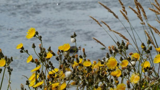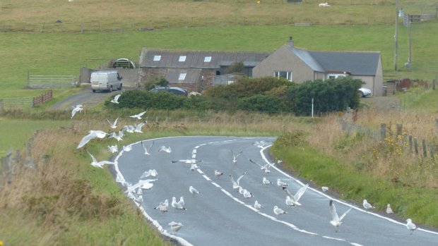 Am nächsten Morgen bin ich dann mit der Fähre nach South Ronaldsay gefahren, der südlichsten der Orkney Inseln. Die Besatzung half mir freundlich mit meinem voll beladenen Rad über die Stufen des Steges auf die ansonsten „nur Personenfähre“. Diese Insel und zwei weitere wurden während des 2.Weltkrieges auf Churchills Befehl mit Barrieren und durch zwangsverpflichtete italienische Kriegsgefangene miteinander verbunden, um die britische Flotte, die sich in den riesigen Naturhafen Scapa Flow versteckte, zu schützen. Hat aber nicht ganz geklappt. Ein deutsches U-Boot schlüpfte durch und versenkte stolz ein veraltetes britisches Kriegsschiff. (Einzelheiten siehe wikipedia). Dadurch kann man erstens einem historischen Lehrpfad folgen und zweitens ohne weitere Fähren bis nach Kirkwall auf die Hauptinsel gelangen. Die Inseln sind ein Paradies, aber mehr für Hartgesottene. Es wehte ein steifer Wind bei 12°C. Wie der Sommer hier gewesen sei, fragte ich den Inhaber eines Post- und Sonstiges-Ladens, bei dem ich einen Kaffee trank. „Wir hatten tatsächlich ein paar Wochen kaum Wind! Und 18 – 19°C!“ Nun, ich hatte mir vorsorglich unterwegs noch einen Pullover gekauft (der würde bei uns kapp die Hälfte kosten) und machte heute dann eine Rundfahrt ohne Gepäck, erst gegen, dann mit dem Wind bis zum ‚Ring of Brodgar‘. In einigen Stunden fährt die Fähre nach Aberdeen und dann folgen noch die letzten 2-3 Etappen nach Edinburgh. Jetzt aber Bilder vom kalten Paradies.
