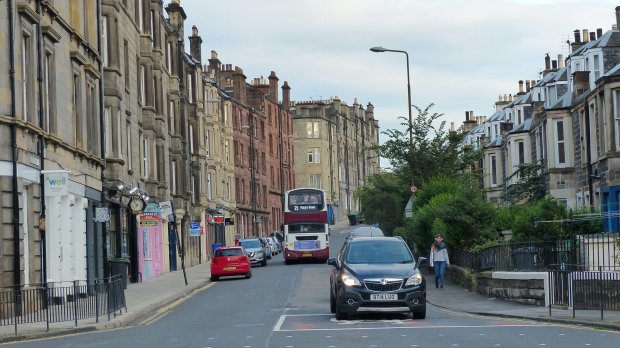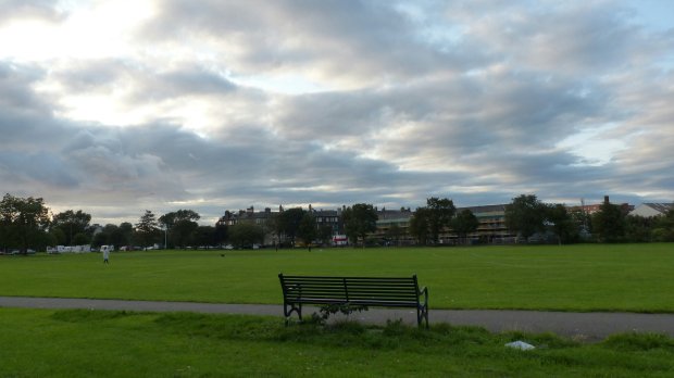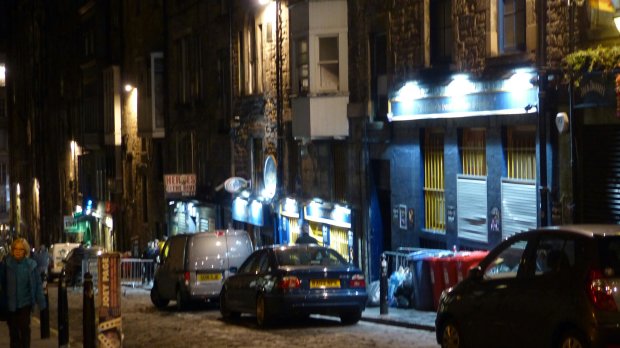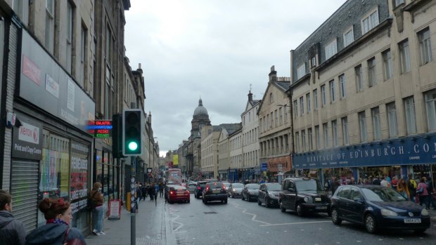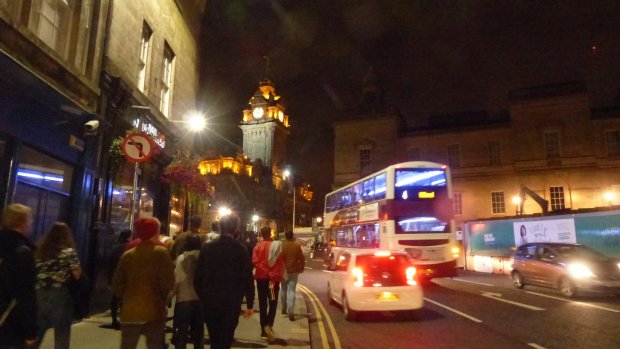 Dazu kam dann noch die Wettervorhersage, die für den nächsten Tag nicht nur starken Gegenwind, sondern auch noch heftigen Regen ankündigte. Also machte ich nach 70 km in Montrose Schluss und entschied, den Rest bis Edinburgh mit der Bahn zu fahren, also noch etwa 160 km. Erst mal nahm ich mir das billigste Hotel -ein interessanter Laden mit Pub und Restaurant, im Pub schwofte das Volk bei einer Fußballübertragung und später Tanz, getrennt davon das Restaurant, gediegen aber … naja, über die englische Küche lass ich mich jetzt hier lieber nicht aus. Ich recherchierte online nach einem Zug, fand dabei heraus, dass es in Montrose einen Bahnhof mit Personal (!) gab, und tatsächlich saß dort ein lebendiger Mensch an einem Schalter, der mir nicht nur eine Fahrkarte, sondern auch eine Fahrradkarte einschließlich Platzreservierung verkaufen konnte! Nur meinen warmshowers-Gastgeber Aaron konnte ich nicht erreichen, er rief mich auch nicht zurück, so dass ich mir für die erste Nacht in Edinburgh eine Jugendherberge suchte, „Safestay“ heißt sie.