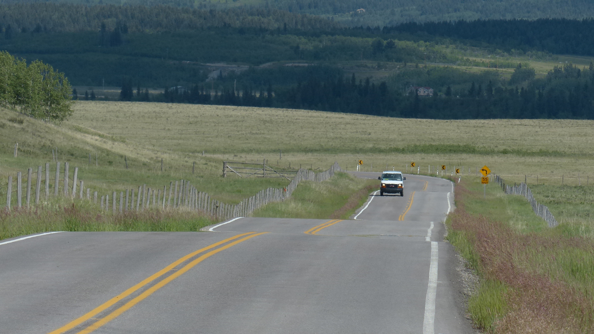 Schließlich erreichte ich Cochrane, — zum Campingplatz musste ich tiieeef runter zu Bow River und am nächsten Morgen gleich wieder 200 m hoch über eine Hügelschwelle.