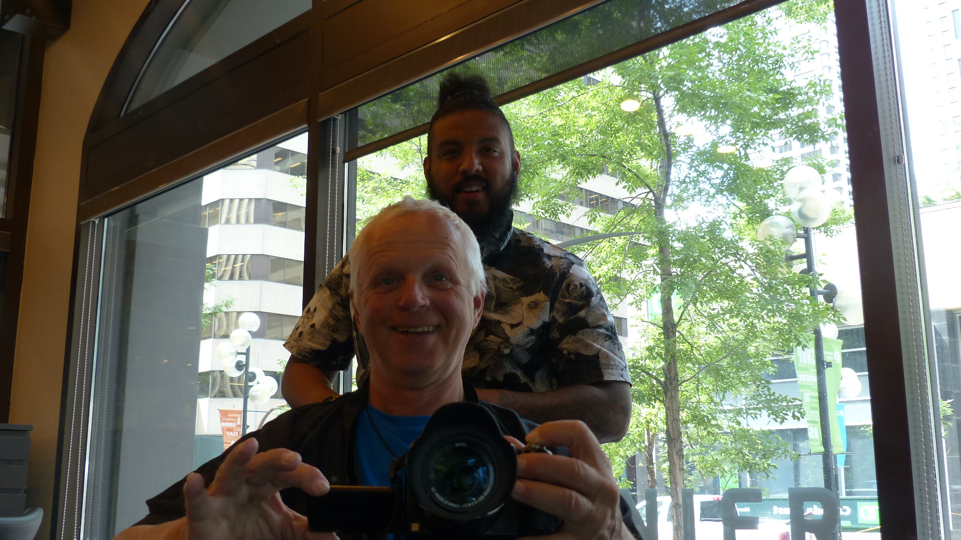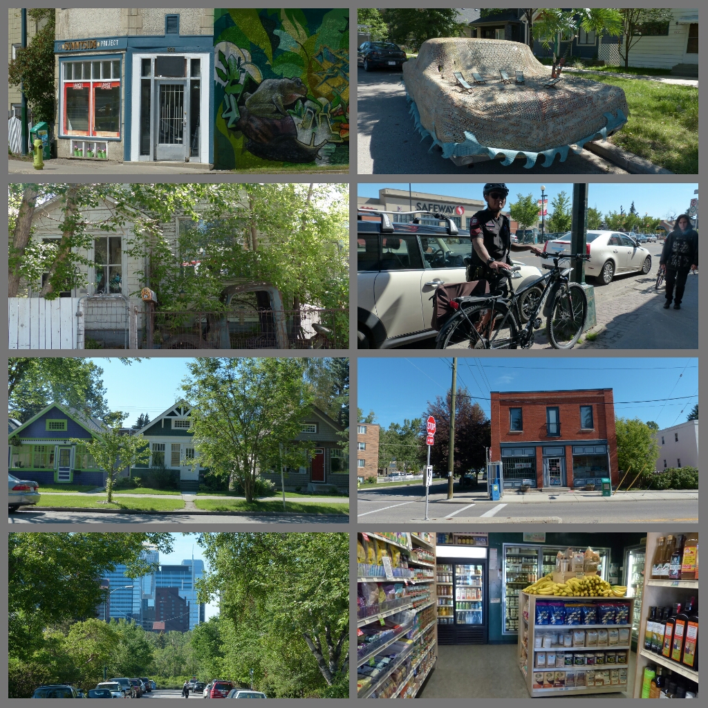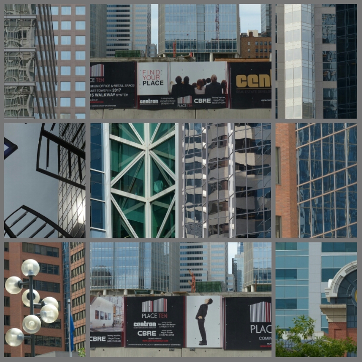 Mein Gastgeber war ein 70-jähriger Publizist, der über die Regenerierung von Erdöllagerstätten nach dem Fracking arbeitet. Etwas kauzig und sehr auf seine Arbeit, konzentriert, macht aber selbst auch noch Radreisen. An seiner Wand hing ein altes schwarz-weiß Foto, mit John Lennon im Bett, den er damals dort einmal interviewt hatte. Ich schlief auf der Veranda. Am nächsten Tag versuchte ich, Calgary fotografisch festzuhalten. Die Kathedralen des Monopolkapitals zerhacke ich am liebsten zu Collagen, da man sie sowieso nicht auf ein Bild bekommt.