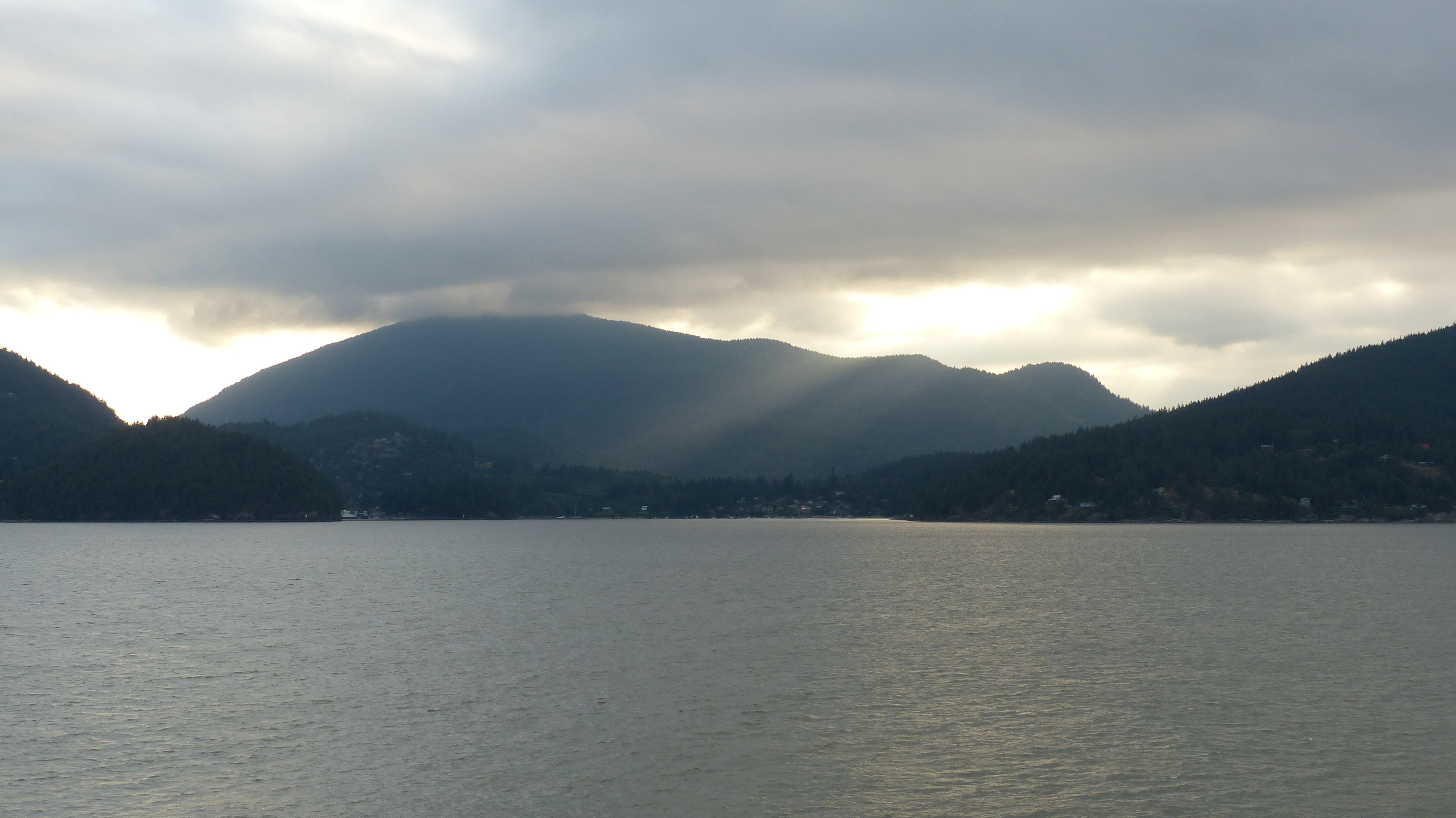 Seit genau einer Woche bin ich nun in Kanada und seit meinem Start von Vancouver am 23. „on the road“. Zuerst die sehr mühseligen 31 km zur Fähre und zu meinen Gastgebern in Namaimo. Mühselig, weil es auf dem Marine Drive ständig so steil auf und ab ging, so dass ich mehrfach schieben musste, um die Fähre um 19.30 Uhr noch zu erreichen. Ich schaffte es und enterte das Schiff … als Letzter, nachdem ich mich auf dem Terminalgelände auch noch verlaufen hatte. Die knapp 2- stündige Fahrt über die Strait of Georgia entschädigte mit mystisch-wolkigem Himmel zwischen bergigen Inseln und einer Ankunft mit Sonnenuntergang. Kiersten und Danny erwarteten mich schon.