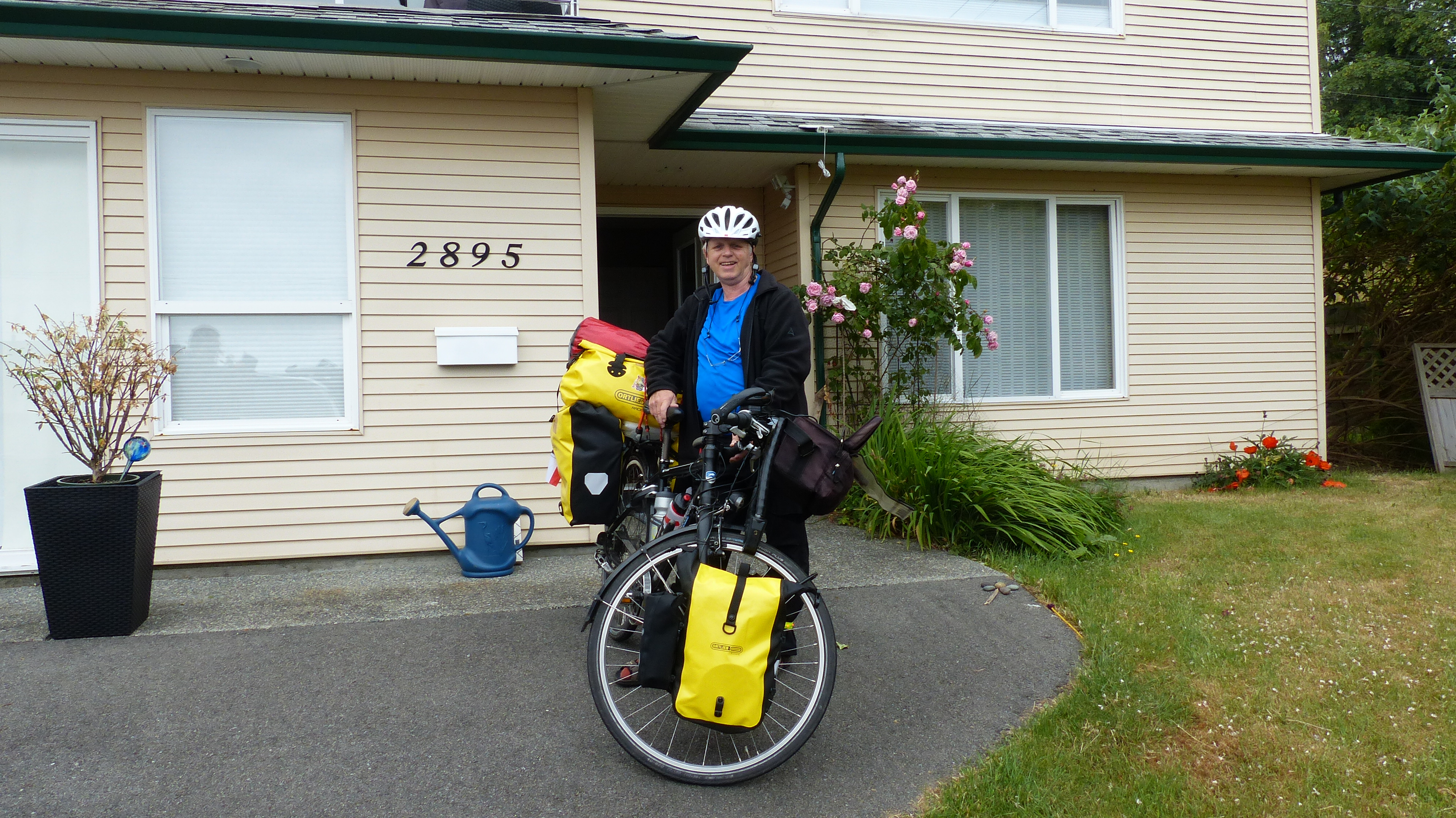 Ich kann nicht mehr schlafen und sitze am Wohnzimmertisch meiner Gastgeberin Sharon. Vorgestern kam ich hier auf die Minute pünktlich auf dem Flughafen Vancouver an. Mein Gepäck und das Rad war unbeschädigt (4 Fahrradtaschen in einem Polyestersack fest verstaut und eine am Rad festgezurrt).