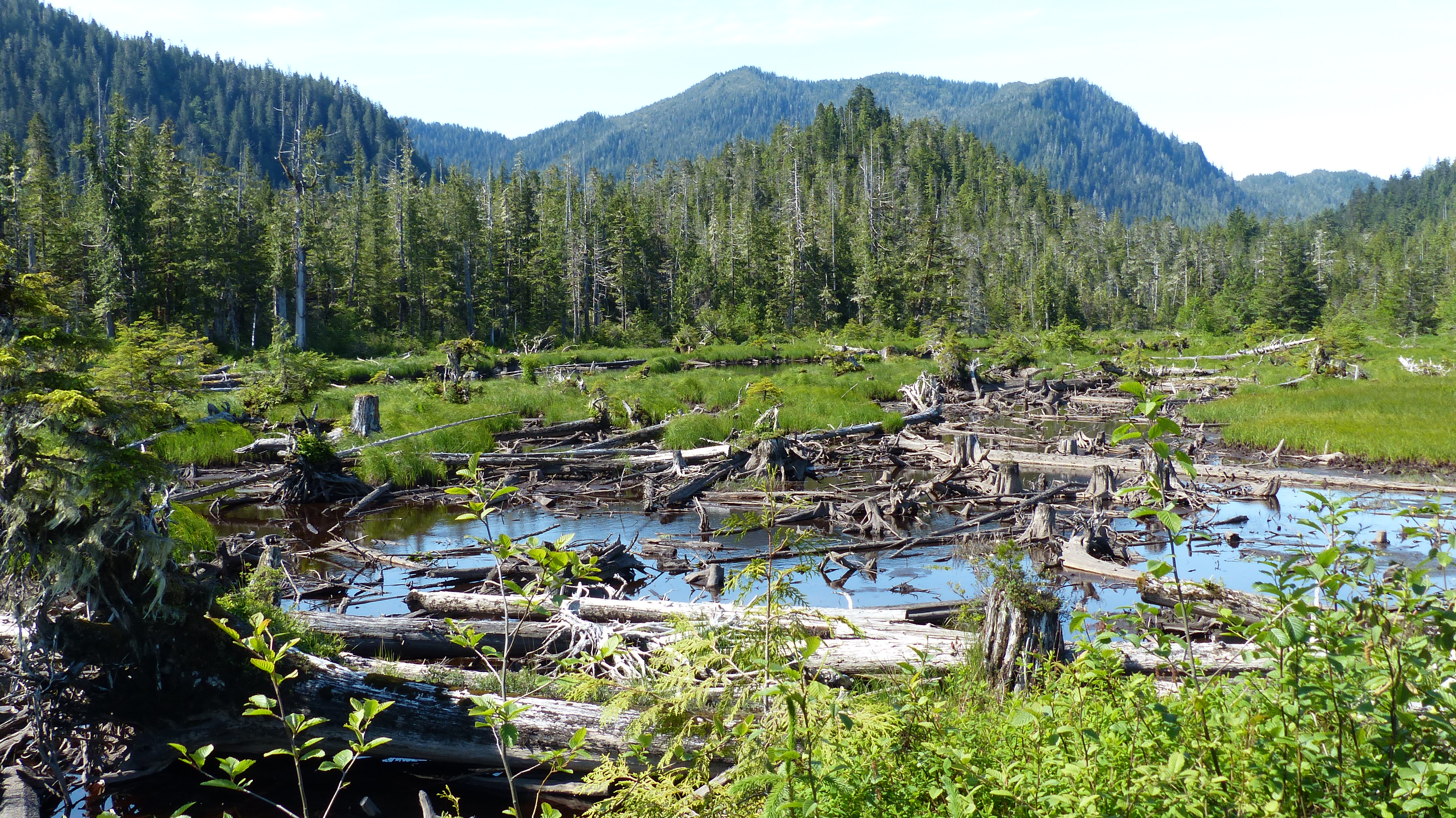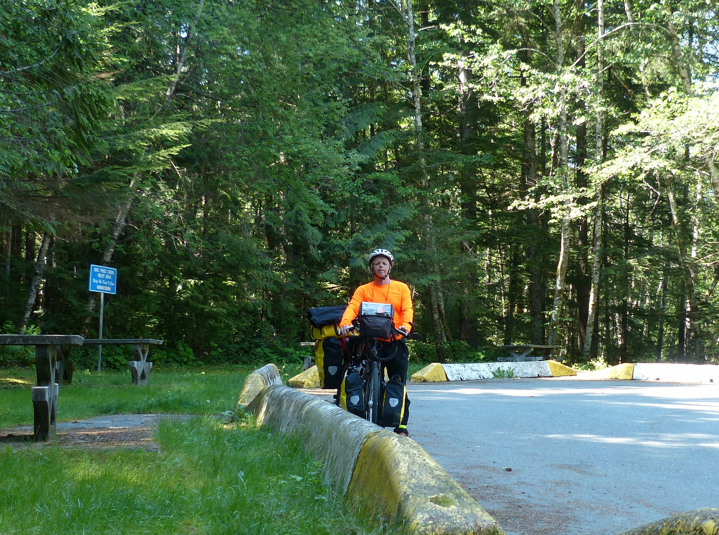 Dann ging es weiter heftig bergauf und bergab, und ich fühlte mich sehr gefordert, denn ich war ja noch gar nicht daran gewöhnt, meinen „Lastesel“ mit dem ganzen Expeditionsgepäck über steile Hügel hoch und runter zu treiben. Diese Art Bergtraining ist in Berlin und Umgebung ja auch gar nicht möglich. Das brachte dann meinen Plan völlig durcheinander. Oder besser meine Schreibtischplanung. Denn ich wollte ja noch hoch in den McMillan Provincial Park wegen der riesigen Redwoods. Später gibt es auf den Strecken durch Kanada keine mehr, und ich musste ja auch die Fähre nach Prince Rupert schaffen – oder eine Woche warten. Spätestens an der Abzweigung zu Highway 4 musste ich eine Entscheidung fällen, aber angesichts des Umwegs und drohender 250 m bergauf entschied ich: Heute nicht! Morgen extra und ohne Gepäck! So machte ich es dann, suchte mir einen Campingplatz und ruhte mich aus.