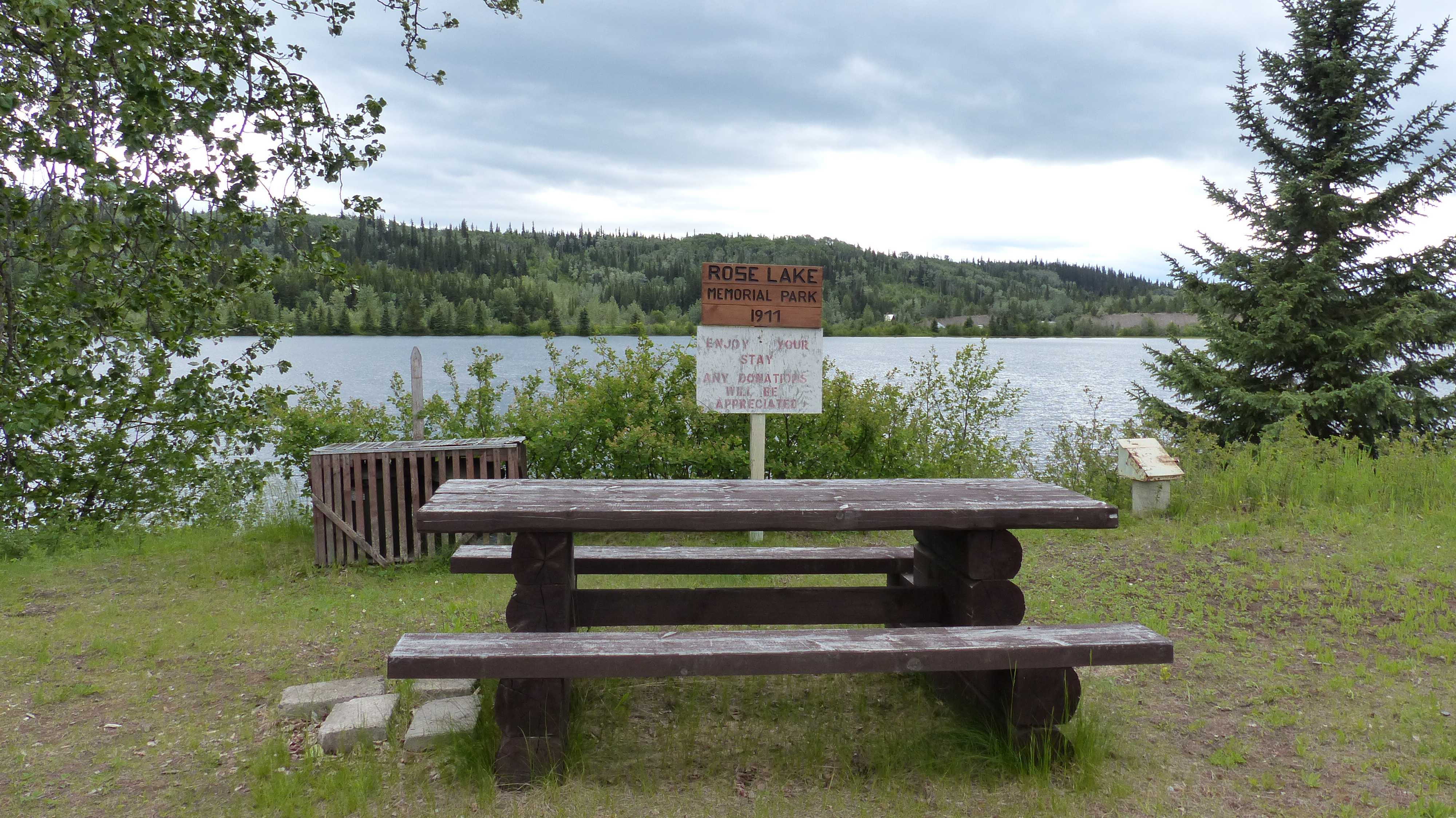 Das Herausfordernde an dieser Tour ist der ständige Kontrast zwischen dem starken Verkehr und der endlos erscheinenden Weite. Ich versuche immer mal Geräusche wie interessante Vogelstimmen aufzunehmen, aber es gelingt mir selten. Irgendwie merken die das und hören sofort auf – dann kommt wieder ein Truck von rechts … dann einer von links …. Ja manchmal auch ein paar Minuten gar keiner, aber dann ist auch der Vogel nicht mehr da, der wie vorhin reine Kadenzen flötete. Schade. Jetzt ein paar nette Bilder, z.B. vom winzigen Ort Rose Lake mit eigenem Friedhof und einer winzigen Badestelle, die auf Spendenbasis funktioniert. Zum Baden war es mir aber doch zu kalt.
