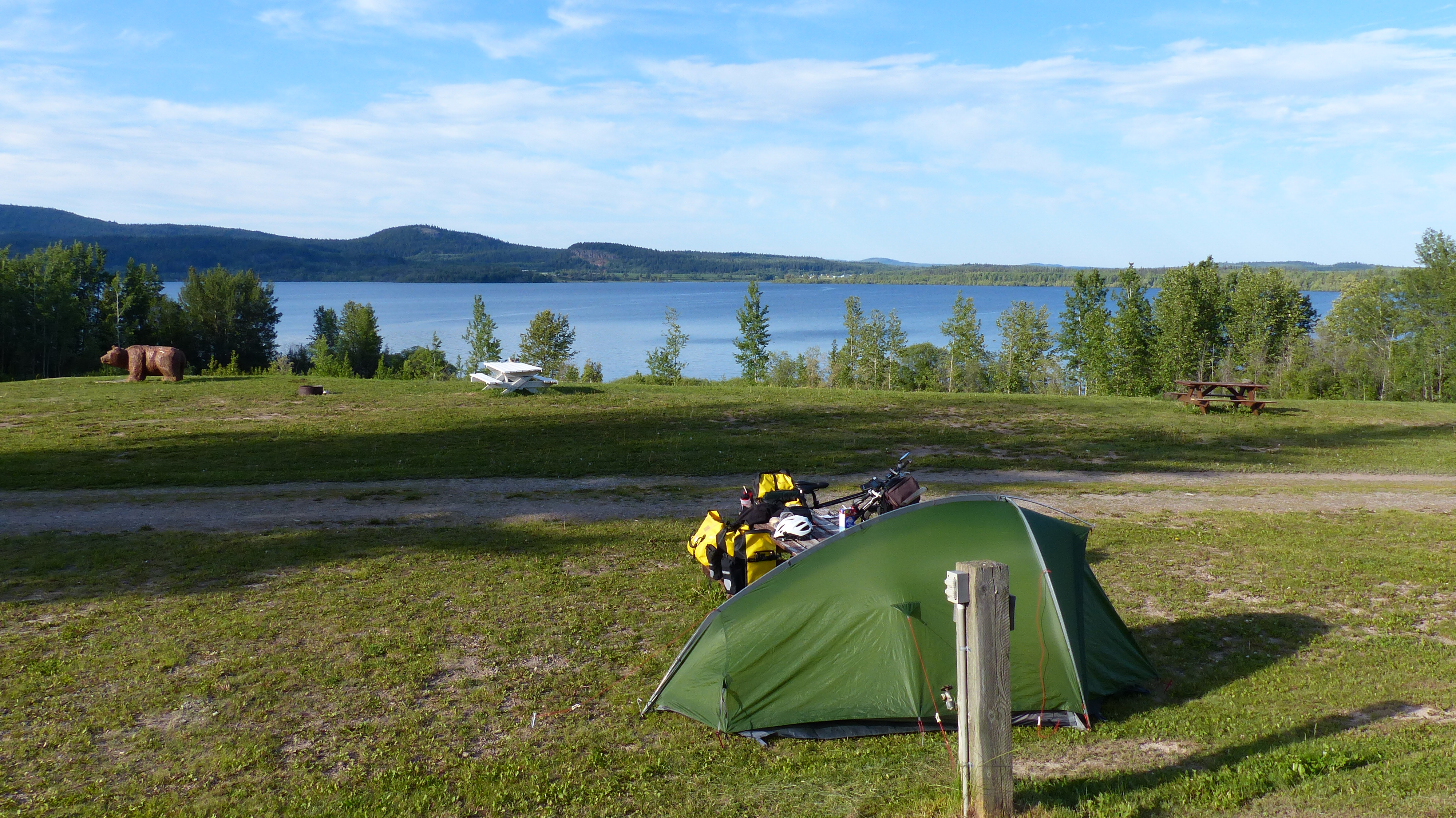 Manchmal gibt es auch ganz idyllische Campingplätze, wenn man den Ton weglässt. Zum Beispiel dieser hier am Fraser Lake. Hinter mir donnert der Strassenverkehr vorbei und vor dem See haben noch Güterzüge Platz. Die Plätze sind halt alle in Straßennähe, sonst findet sie ja keiner. Oder man müsste erst extra den Wald dafür roden.