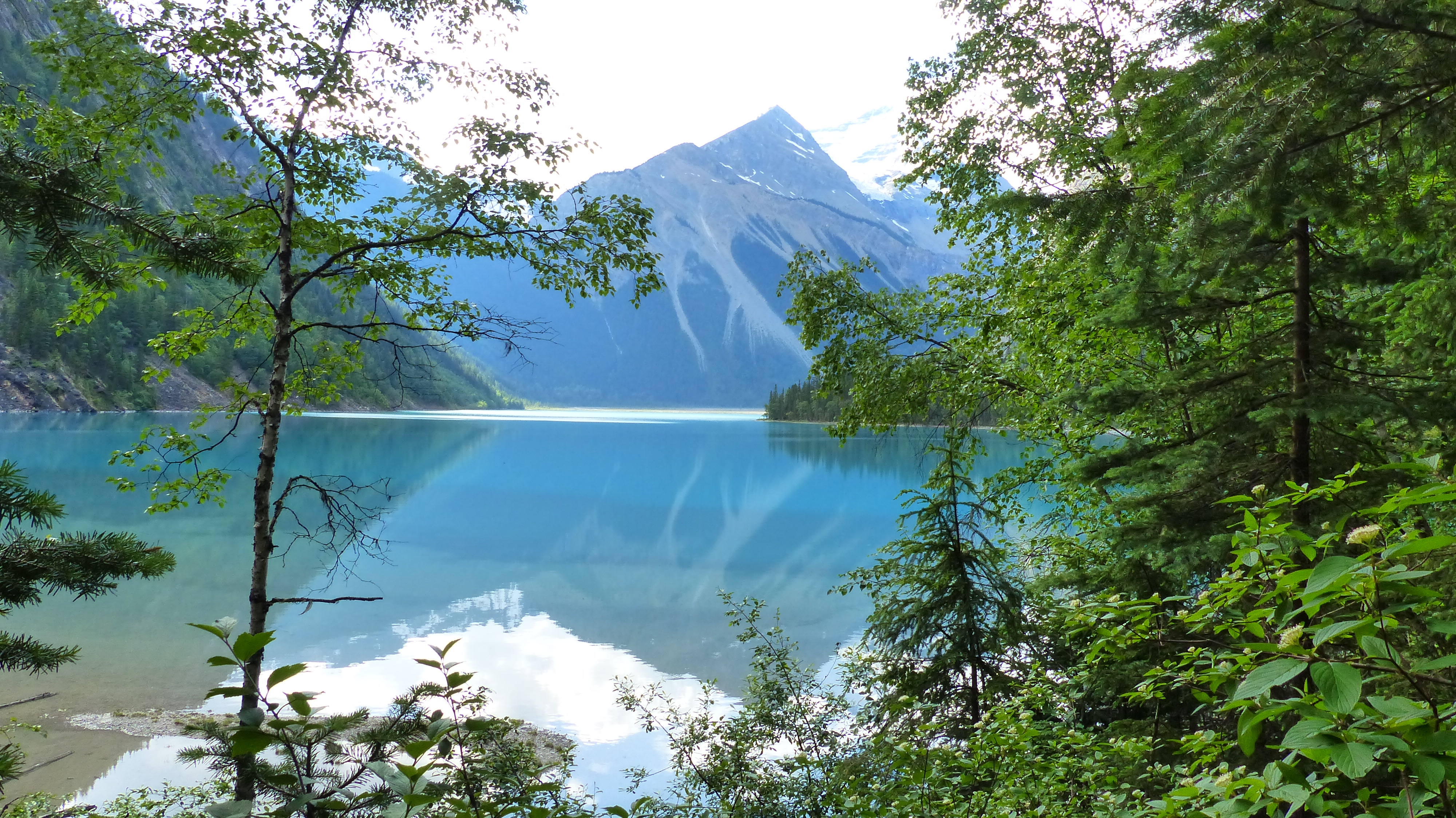 Nachdem ich Prince George verlassen hatte, fand ich nach 30 km Richard Riding, „Rick“, aus Großbritannien. Im Wald. Neben der Straße. Da zeltete er wild am Tage nach durchwachter Nacht, genervt weil sich am Vortag ein Blueberry-Pie in seiner Tasche verteilt hatte und er sich ewig mit Saubermachen aufgehalten hatte. Er war schon seit 4000 km von Alaska unterwegs und entschied kurzer Hand sich mir anzuschließen. Ich war überrascht, – aber warum nicht, wenn er doch schon so lange allein unterwegs ist? Das Ganze wurde für mich dann zu einem Bewusstseinstrainingsprogramm, denn der Kerl war stärker, jünger (50) und fitter als ich. Und er hatte daher erst mal ein höheres Grundtempo. Schon waren sie da, meine inneren Stimmen: „Du bist zu langsam!“,“Du bist nicht fit genug!“, „So kommst du nie durch Kanada“. Aber er nahm erstaunlich viel Rücksicht. Obwohl wir uns so viel gar nicht zu sagen hatten… Merkwürdig. Das Ganze hielt mehr als drei Tage bis Mt.Roberts, wo er mich dazu brachte, mit Rad und Pack zum Lake Kinney hinauf zu hasten, auf einem Weg, der eher für Mountainbikes (ohne Gepäck) geeignet war…. Aber dank seiner Hilfe schaffte ich es zum wunderschönen See-Bergblick-Panorama. Am nächsten Morgen trennten wir uns dann, er wollte noch weiter hinauf, ich aber nicht. Er hat auch viel mehr Zeit, weil er seine Rückkehr nach Hause noch gar nicht geplant hatte. (Letzten Endes fuhr er weiter nach Lateinanmerika, lernte dort eine Frau kennen und lebt mir ihr inzwischen in Neuseeland …)