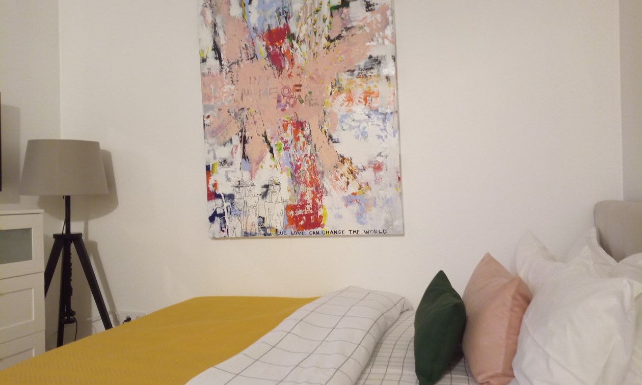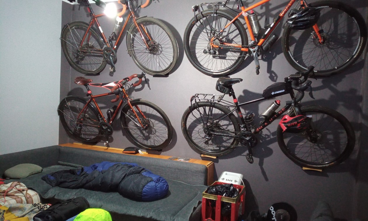 Etwas umständlich fand ich den Weg zum Ausgang auf die Bahnüberführung und musste eine lange Schleife auf die andere Straßenseite fahren. Von dort konnte ich mit Hilfe der auf meinem Navi im Voraus gespeicherten Route schnell den Weg zu meiner warmshowers – Gastgeberfamilie finden. Das Fahrrad konnte ich auf dem Hof parken und sie halfen mir, das gesamte Gepäck bis in das vierte Stockwerk hochzutragen. Oben angekommen, zeigte man mir mein Bett an einer Wand, die mit 4 hängenden Fahrrädern dekoriert war. Das war das erste Mal in meinem Leben, dass ich unter Fahrrädern schlief! Zuvor jedoch erzählte ich ihnen bei einem Abendessen mit auf den Fernseher übertragenen Fotos von vorigen Radreisen.