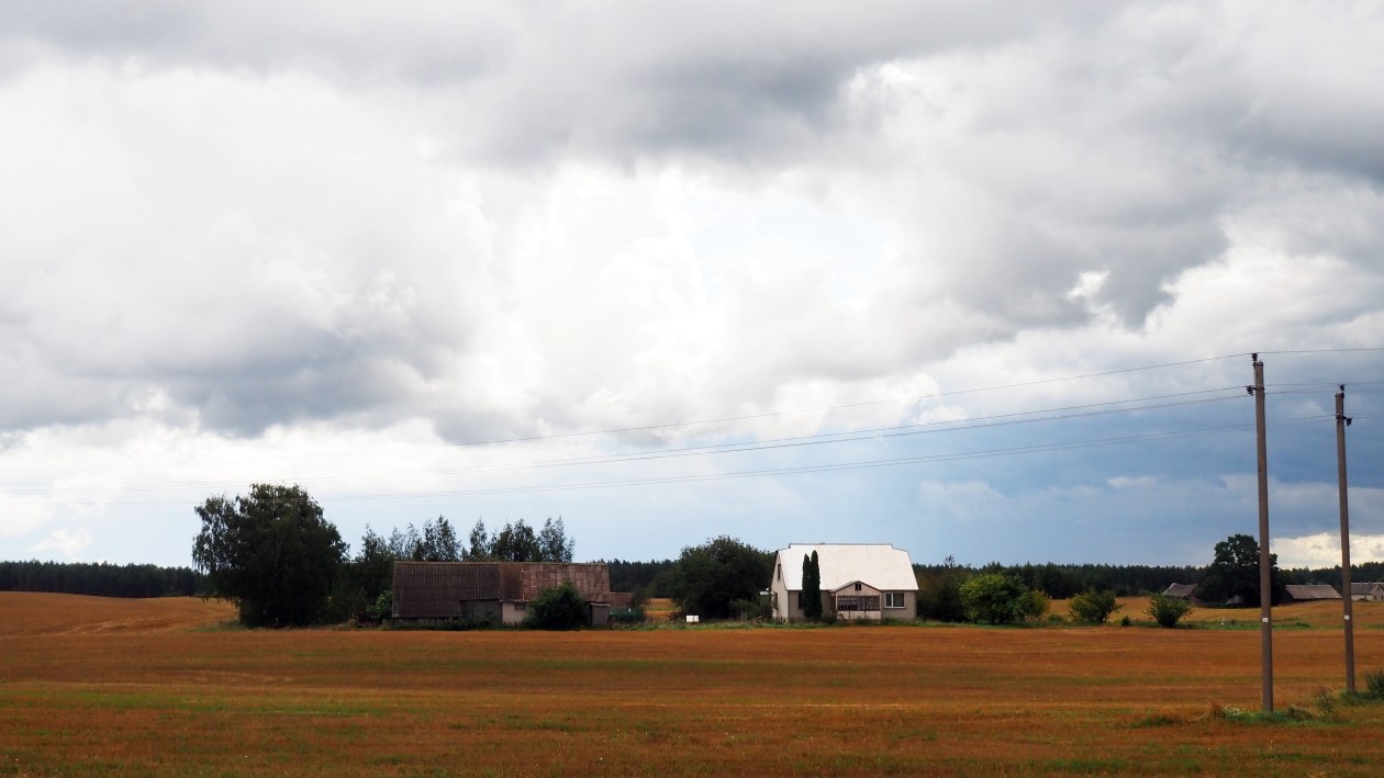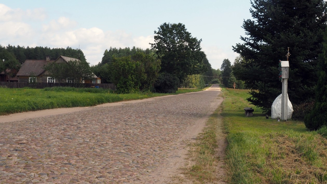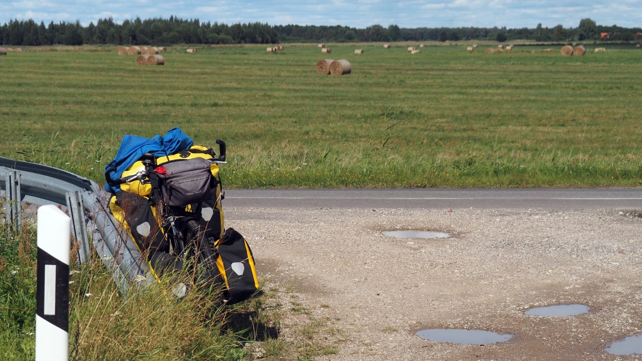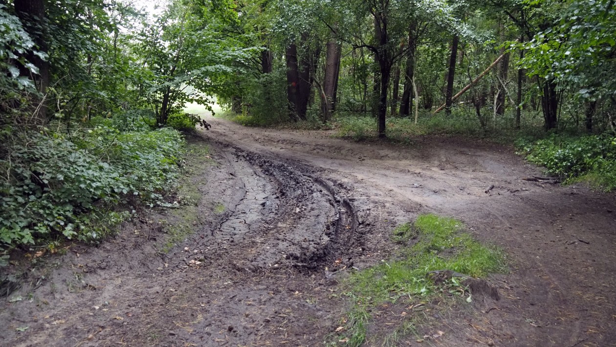 Zunächst nur leicht, aber ich zog das erste Mal seit Posen meine Regenbekleidung an. Der Weg, den ich für meine Route vorgesehen hatte, um näher am Memel zu fahren und nicht die verkehrsreiche 142 nutzen zu müssen, wurde immer schlechter und gabelte sich dann. Ich nahm die rechte Variante und geriet in tiefe Furchen, die mich stürzen ließen. In diesem Moment kam ein deutsches Radreisendenpärchen und halfen mir auf. Wir fuhren gemeinsam noch ein Stück weiter, um tiefe Pfützen herumkurvend, bis eine auch für diese jungen Leute zu steile, lehmige Steigung kam und wir kehrt machten.
