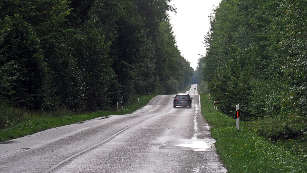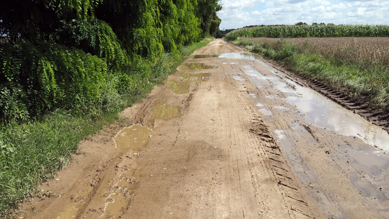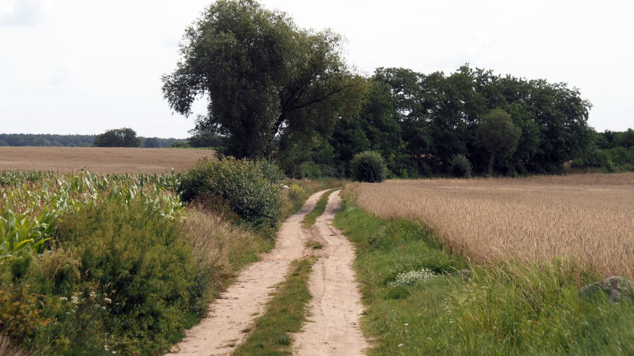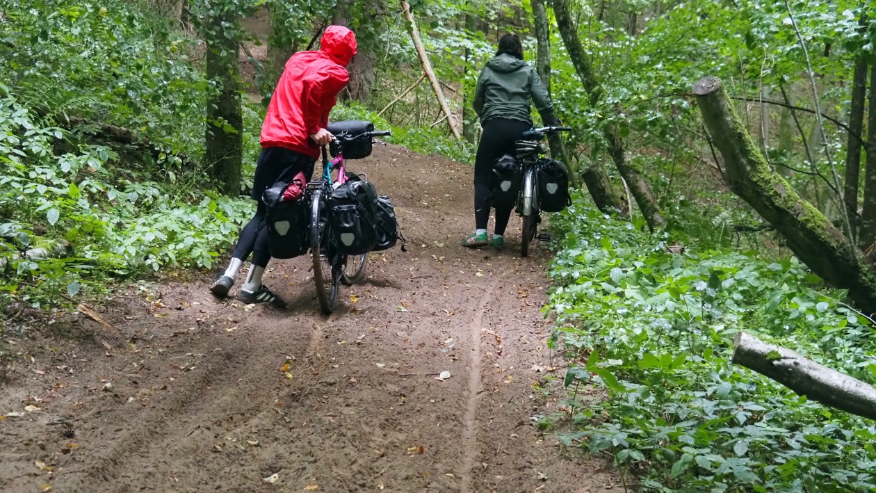 Zunächst nur leicht, aber ich zog das erste Mal seit Posen meine Regenbekleidung an. Der Weg, den ich für meine Route vorgesehen hatte, um näher am Memel zu fahren und nicht die verkehrsreiche 142 nutzen zu müssen, wurde immer schlechter und gabelte sich dann. Ich nahm die rechte Variante und geriet in tiefe Furchen, die mich stürzen ließen. In diesem Moment kam ein deutsches Radreisendenpärchen und halfen mir auf. Wir fuhren gemeinsam noch ein Stück weiter, um tiefe Pfützen herumkurvend, bis eine auch für diese jungen Leute zu steile, lehmige Steigung kam und wir kehrt machten.