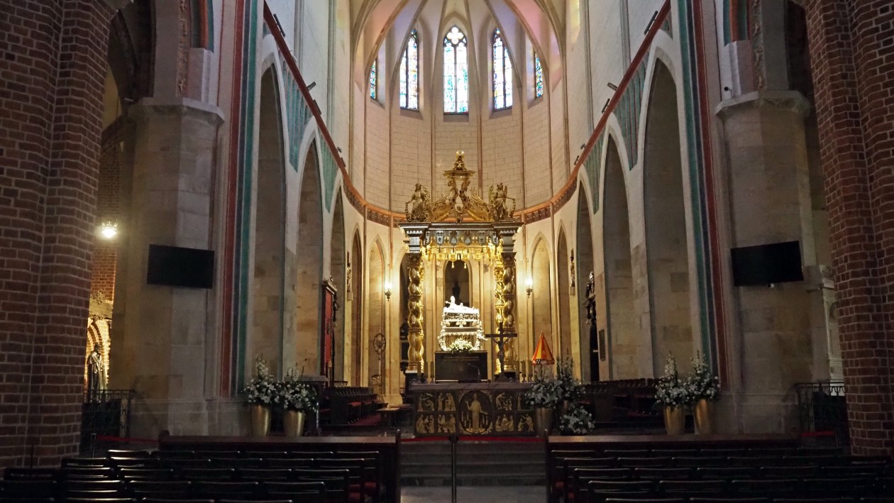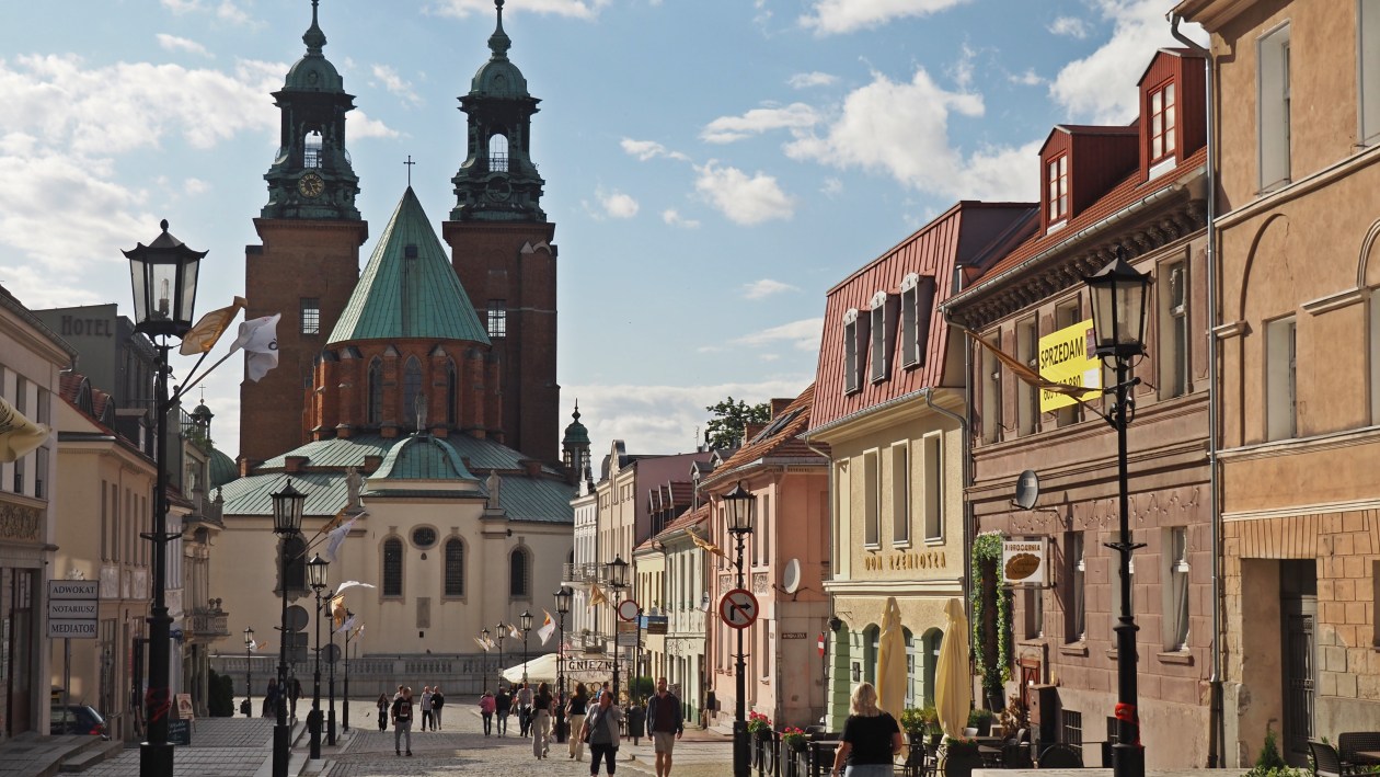 Also wieder gegen den heftigen Wind zurück. Ich hätte mal richtig gucken sollen, dann hätte ich auch gesehen, dass es eine um das Brückenbauwerk herum führende kleinere Straße rechts(!) abzweigend gab – aber ich wollte ja unbedingt auf der 194 fahren, sonst hätte mich mein Navi gleich richtig geführt. Und so kam ich etwas umständlicher in Gniezno/Gnesen und in meinem vor gebuchten günstigen Hotel an. Da es noch früh genug am Nachmittag war, machte ich mich zu einer Besichtigung der historischen Altstadt auf. Gniezno/Gnesen war lange Zeit das kulturelle Zentrum Polens, das mit dieser Stadt die Anfänge seines Staatswesens verbindet. Es gehörte ab 1793 zu Preußen, unterbrochen durch den napoleonischen Feldzug, war es ab 1815 bis 1920 wieder ins Deutsche Reich integriert und kam dann durch den Versailler Vertrag bis zum 2. Weltkrieg zu Polen um nach Befreiung vom Hitler Regime wieder in die Volksrepublik Polen eingegliedert zu werden. Ich machte eine längere Stadtwanderung, die mich zur sehenswerten Kathedrale und dann weiter von Kirche zu Kirche führte.