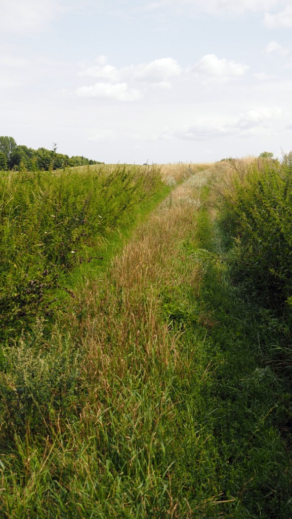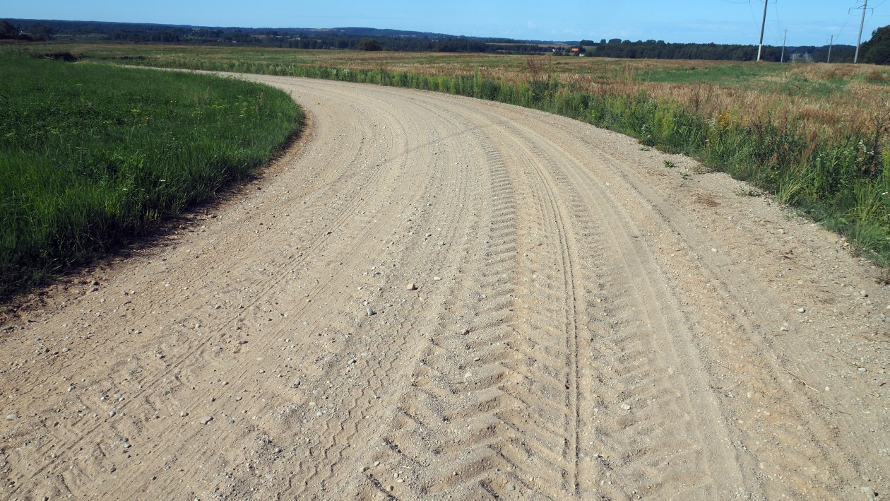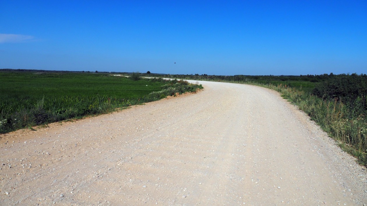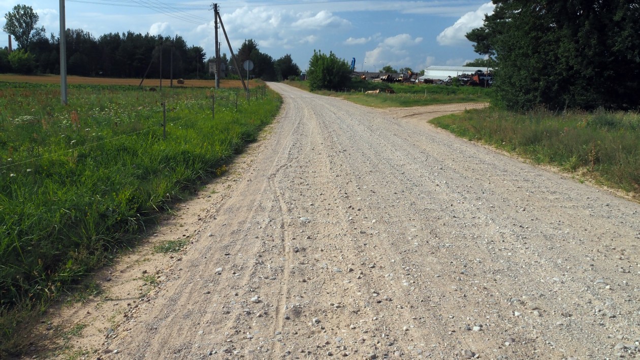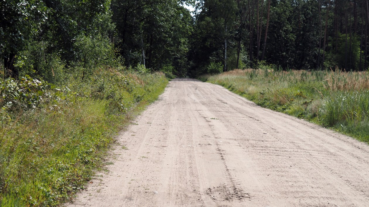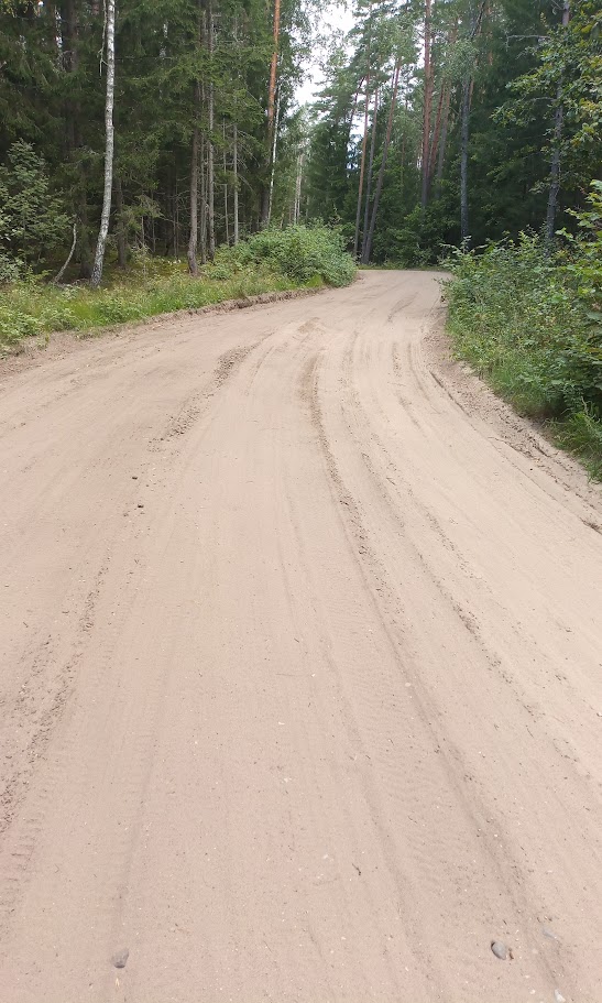Ich nahm eine andere Wegvariante zur A4 zurück, nachdem ich überzeugt war, dass alle anderen Möglichkeiten nicht besser sein würden. Dieses war die “Straße” von der nahe der Wiese liegenden Ortschaft Kukiškės. Weit gefehlt! Ein Weg voller lockerem Sand und das, obwohl dort auch Autoverkehr war. Zeitweilig blieb nichts übrig, als zu schieben.