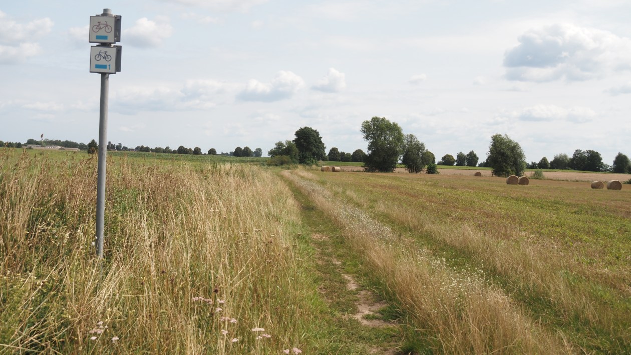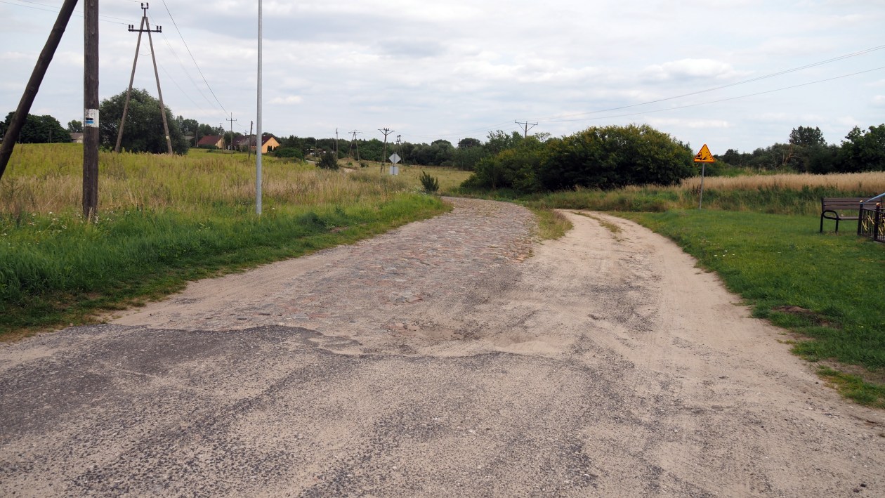 Zum Glück besserte es sich bald und ich konnte wieder über halbwegs gute, geteerte Straßen fahren. Einsames, ländliches Polen, einstmals letzter Zipfel reichsdeutschen Pommerns, landschaftlich ziemlich belanglos wie die Uckermark. Und dann kam an der linken Straßenseite ein richtiger Radweg! Das witzige war, dass das Radwegschild an jeder Bushaltestelle endete, um 20 m weiter den Radweg neu beginnen zu lassen.