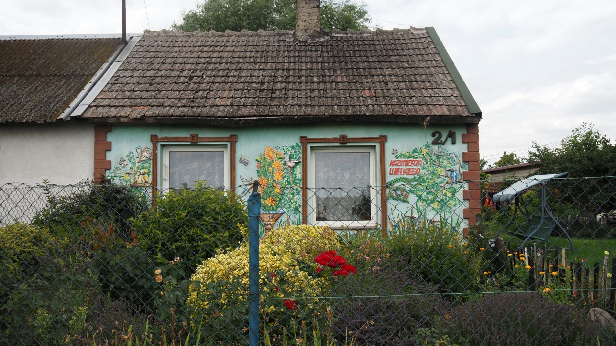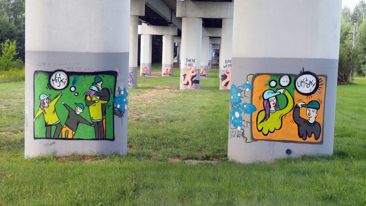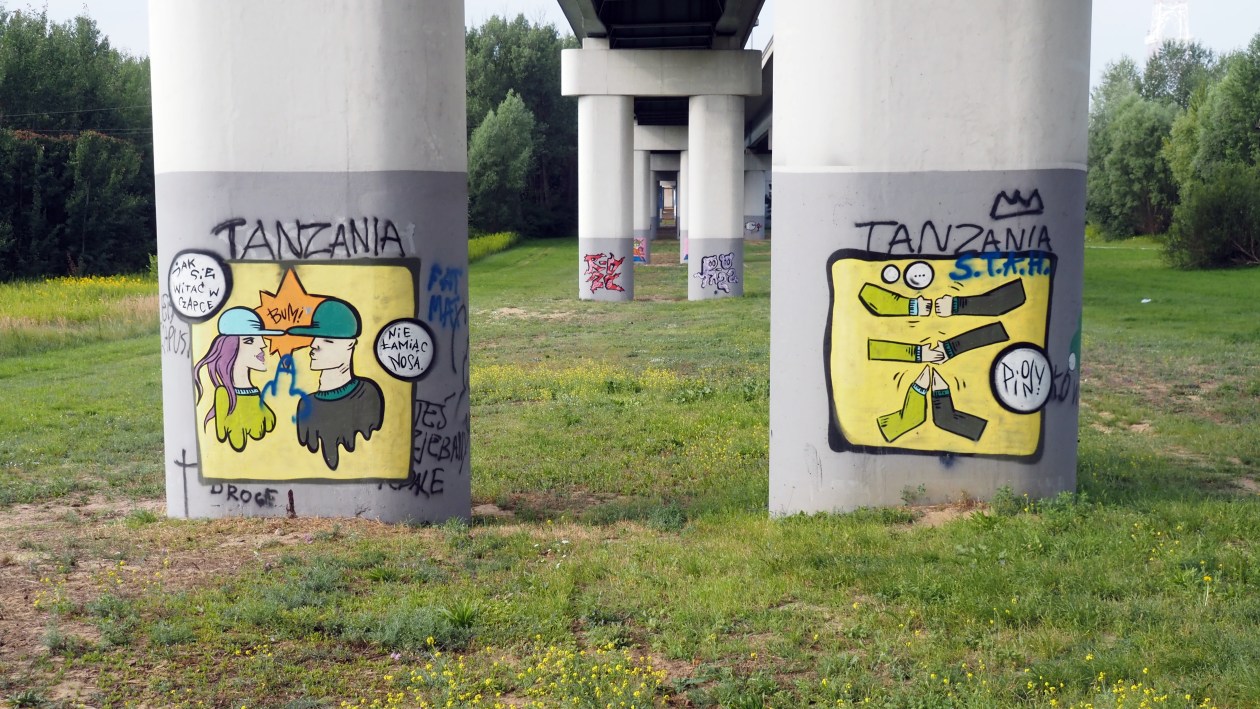 Am 10.08.25 hatte ich wieder einen Rückenwind Tag. Mit 25 km/ von hinten wurde ich durch die leicht wellige Landschaft geschoben. Aber erst einmal nach dem Start am Morgen musste ich einen Horrorweg mit ausgewaschenen Regenrinnen steil bergab schiebend absolvieren, der dann unter einer Autobahnbrücke mit witzigen künstlerischen Graffiti in eine richtige gut geteerte Straße parallel zur Weichsel mündete.