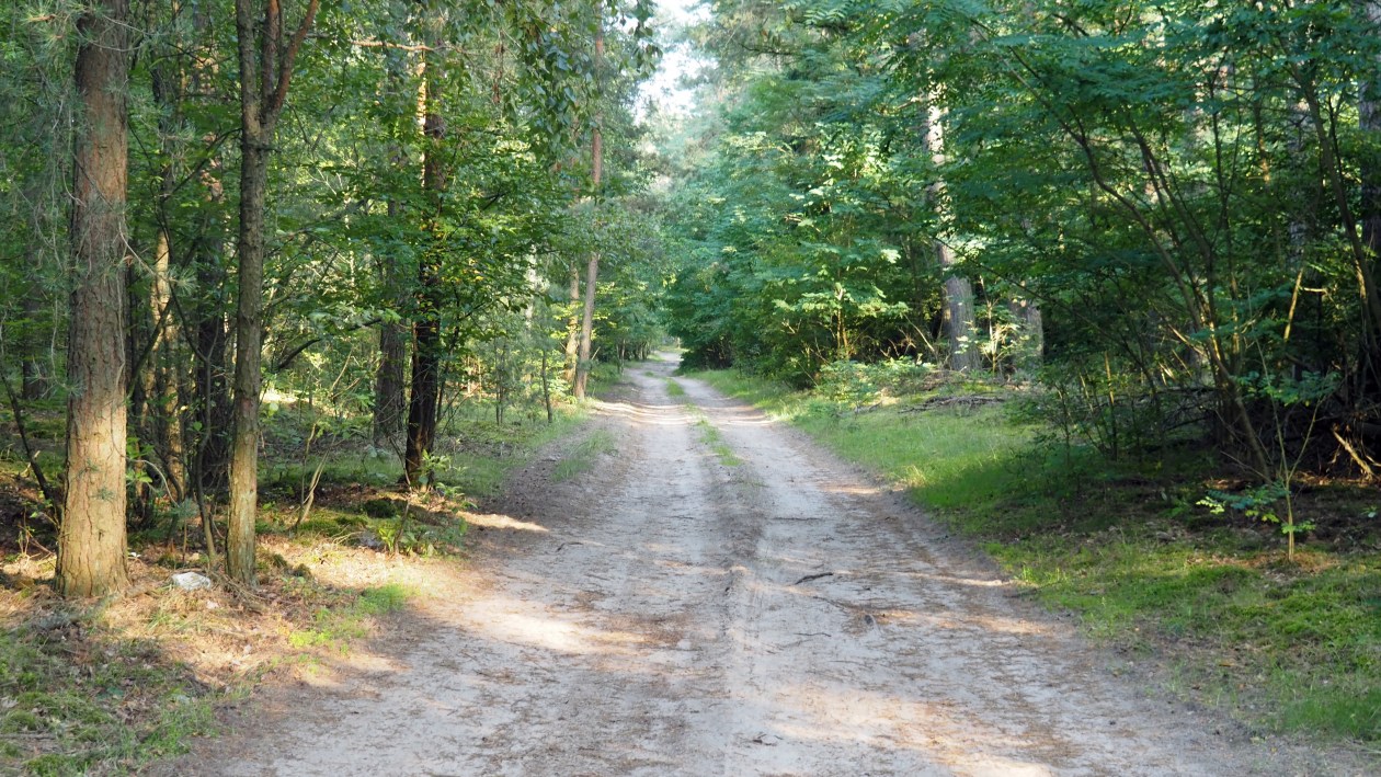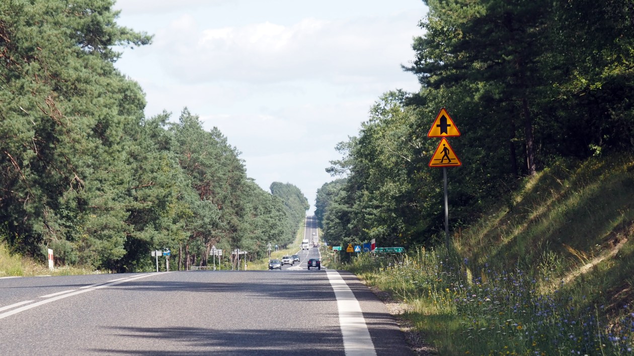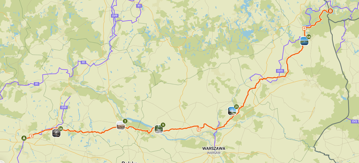 Ich wollte morgens nicht zu hundert Prozent die gleiche Tour zurück zu meiner Route bei Borkowo machen wie am Vorabend und bog dann auf eine Hängebrücke über die Wrka ab. Von dort aus überließ ich mein Routing der Navigationsempfehlung meines Garmin Navis. Schlechte Wahl, denn nach wenigen Kilometern endete die Straße an einem steilen Pfad, an dem ich nur mit Mühe mein beladenes Rad hochschieben konnte. Oben war zwar wieder alles gut, aber jetzt machte ich ungewollt oder fehleingeschätzt einen großen Umweg über Nasielsk.