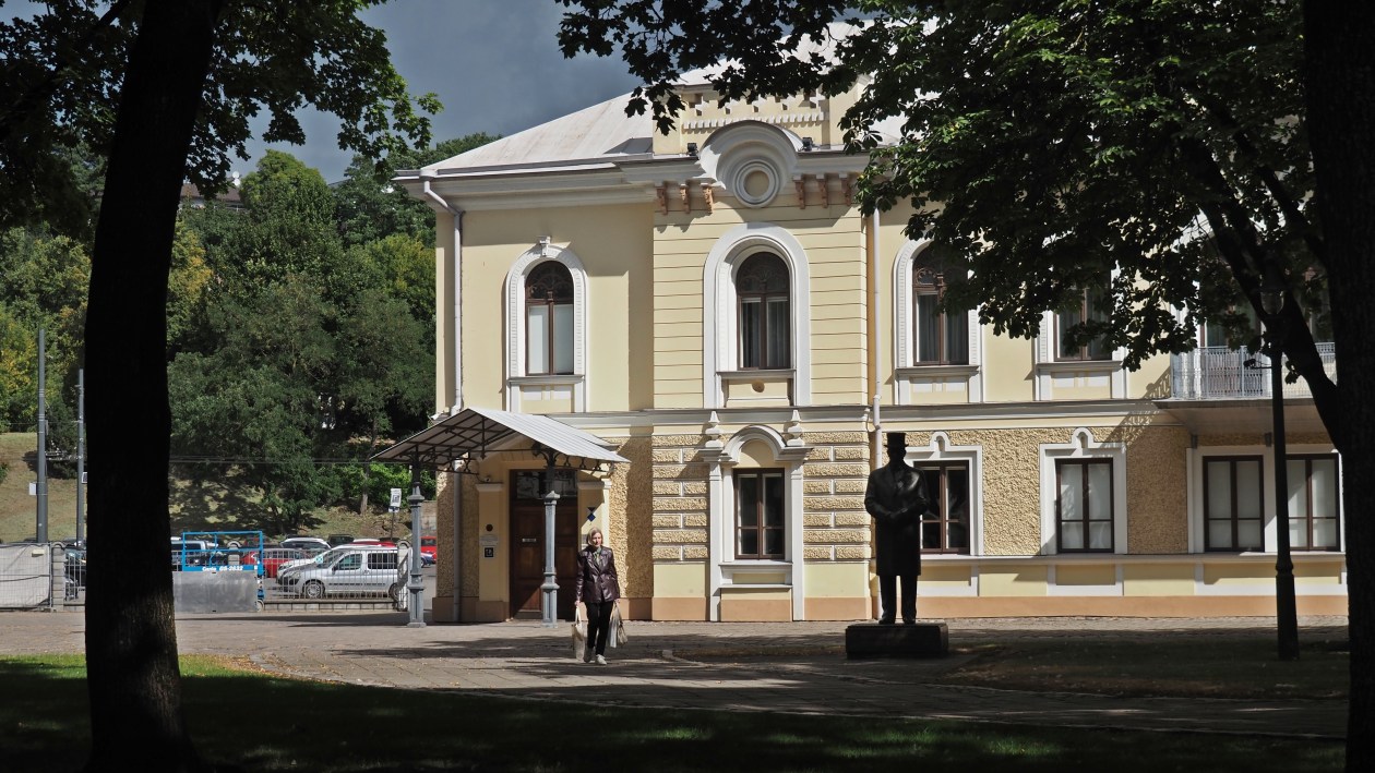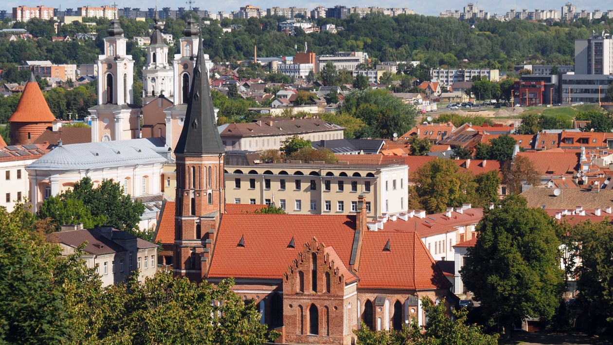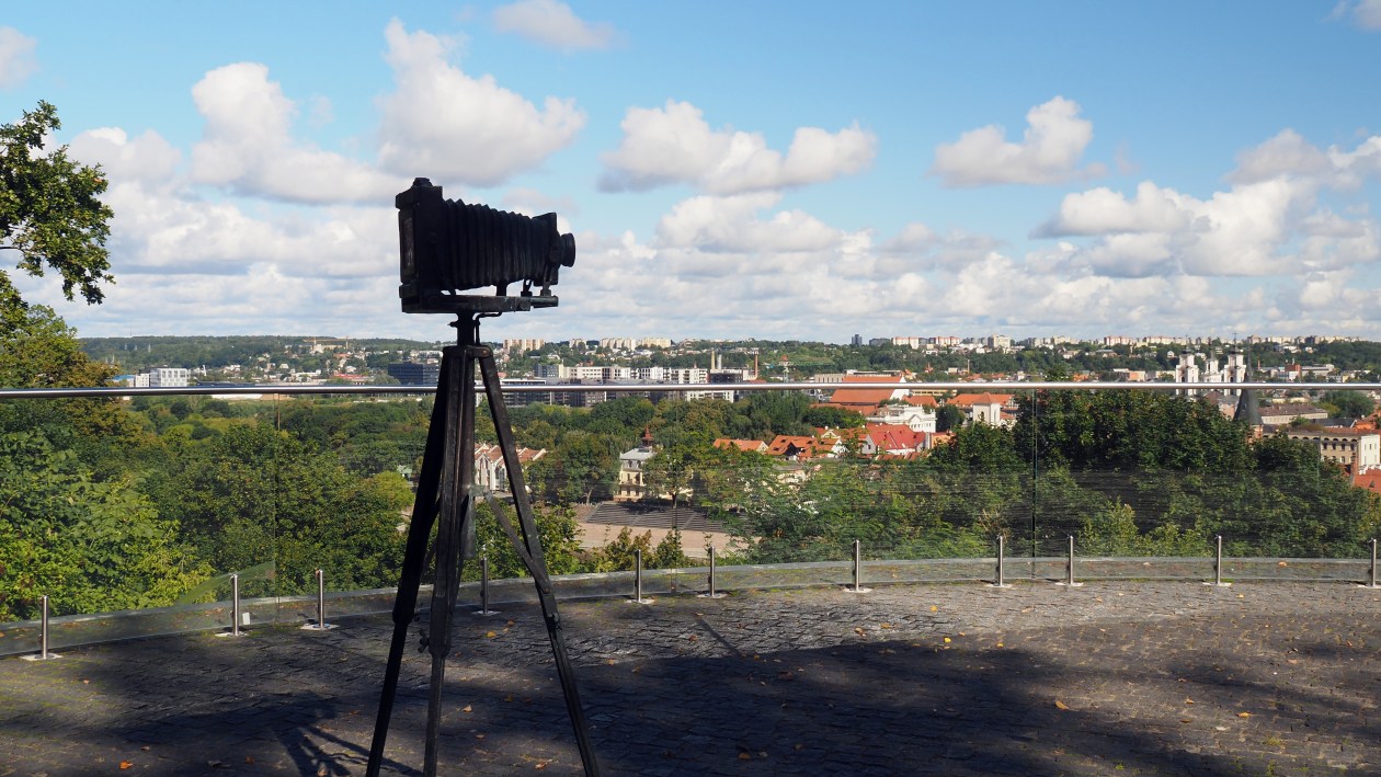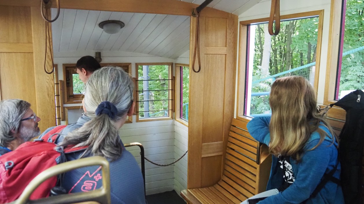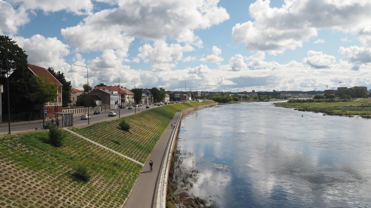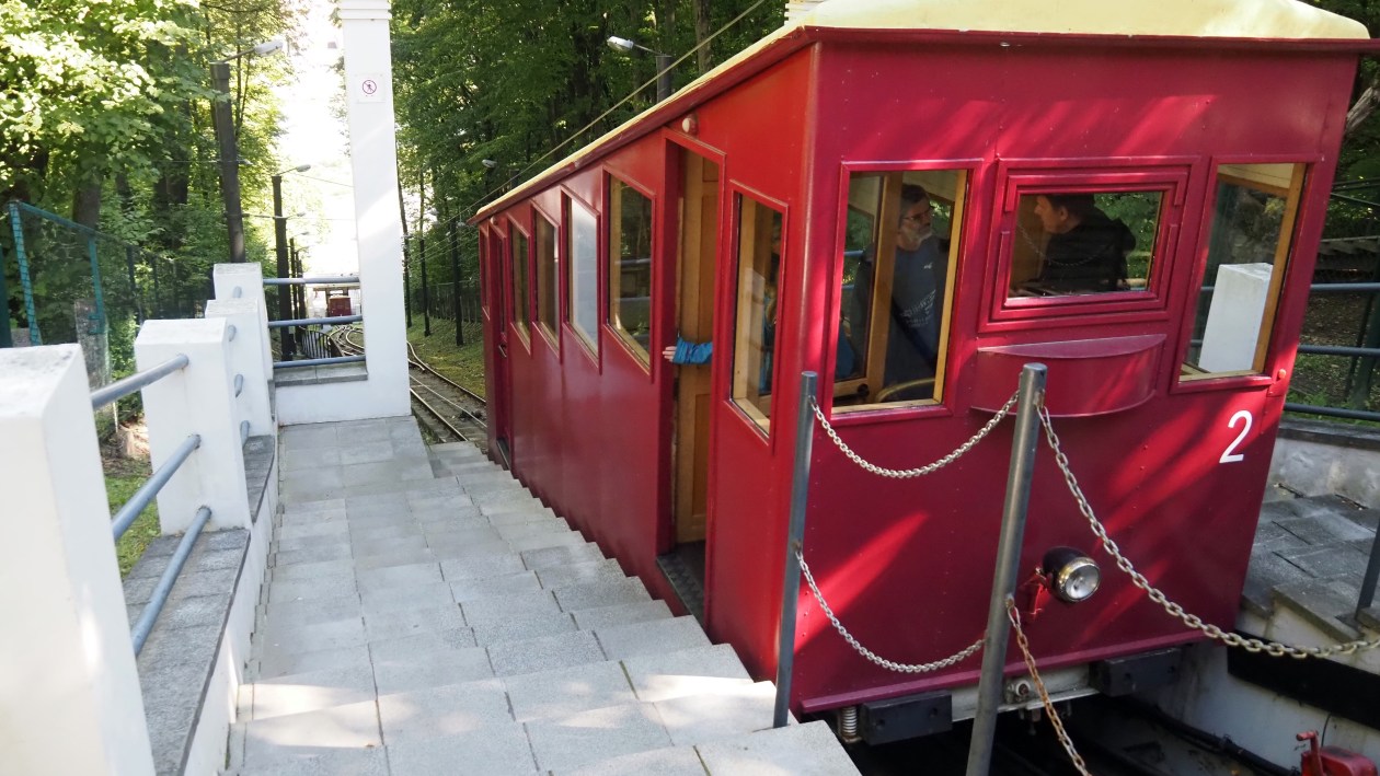 Heute blieb das Fahrrad stehen und ich machte zu Fuß eine Wanderung durch Kaunas. Kaunas war die erste Hauptstadt Litauens, von 1920 bis zur Eroberung durch die Wehrmacht 1941, nachdem es infolge des Versailler Vertrages seit Langem wieder eine eigene Staatlichkeit erlangt hatte. Vilnius und der westliche Teil des Landes gehörten zu dieser Zeit zu Polen. Als erstes lief ich durch ein parkähnliches Gelände an der Musikhochschule vorbei zur Aleksoto-Aussichtsplattform und einer Standseilbahn, die hinab zum Memel fuhr. Ein witziges, historisches Fahrzeug, mit dem man sich für ungefähr 1 € die Treppe abwärts ersparen konnte. Die Fahrt dauert dann keine 5 Minuten!