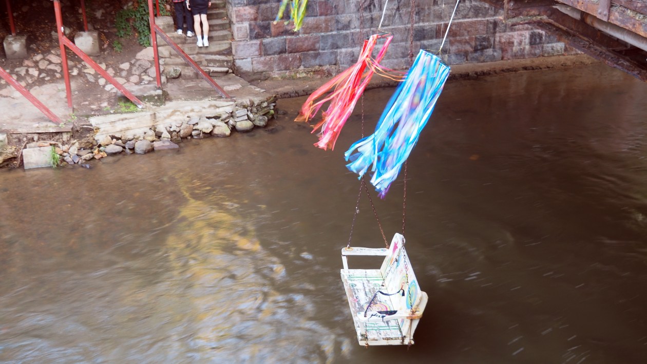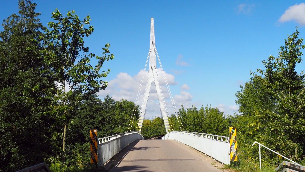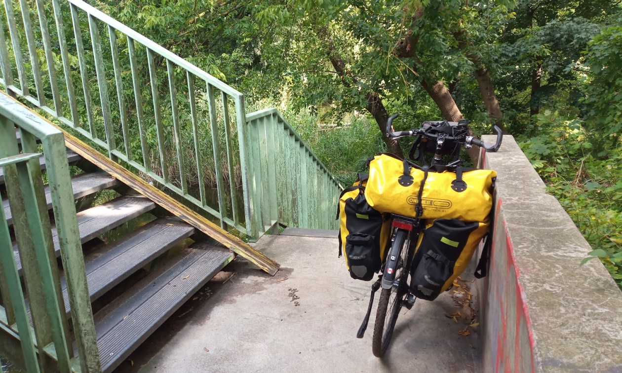 So navigierte ich bald zu meiner mit Komoot vorgeplanten Route am Malta-See, einer Regattastrecke, entlang auf einem ordentlichen Radweg durch eine langen Park. Plötzlich geriet ich an einem Bach an eine Brücke mit einer Treppe. Mir blieb nichts anderes übrig, als abzusteigen und erst das Gepäck, dann das Fahrrad hochzutragen.