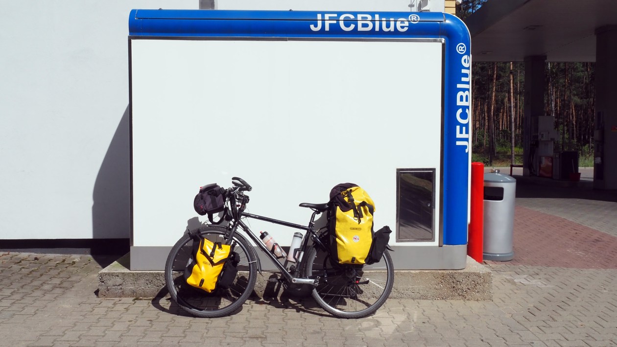 Als ich weiter fuhr, nervte mich schließlich ein schleifendes Geräusch. Ich hielt im Schatten eines Gebäudes und fand heraus, dass die hintere rechte Seitentasche nicht den richtigen Abstand zur Strebe des Gepäckträgers hatte, was dazu führte, dass dieser immer wieder das Schutzblech gegen den Reifen drückte. Mit ein paar Unterlegscheiben löste ich das Problem. Als ich weiterfahren wollte, sprang erst einmal vorn die Kette ab. Rrrrrrr! Schnell zu richten, aber dann stellte sich heraus, dass sich die gesamte Kettenschaltung nicht mehr im Lot befand. Bei dieser Gelegenheit kippte mir das Rad wieder über den viel zu schwachen Ersatz-Ständer aus Gniezno, und knacks, das war es dann mit Ständer Nummer zwei. Inzwischen stand ich nicht mehr im Schatten, sondern in der prallen Sonnenhitze. Ich schob rüber in den Schatten eines Baumes, aber mir fiel keine Lösung ein, egal was ich versuchte. Eine seltene Situation für mich nach über 50.000 km Radreisen…! Im Ergebnis konnte ich nur noch mit dem aller leichtesten Gang fahren, d.h. maximal mit 12 km/h. Ich googelte nach dem nächsten Fahrradladen und fand einen in Łomża, der angeblich bis 20 Uhr geöffnet hatte. Das müsste ich schaffen, dachte ich, es waren noch 17 km. Zwischendurch fiel es der Gangschaltung, warum auch immer, ein, wieder normal zu funktionieren, aber ich brauchte ja auch wieder einen neuen Ständer. Als ich den Laden erreichte, hatte dieser seine Öffnungszeiten auf “bis 18 Uhr” reduziert! Na schön, was nun? Einen anderen, der noch geöffnet hatte, gab es nicht. Ich fuhr frustriert zum Campingplatz am Narew-Ufer und wie zum Spaß ging es erstmal steil hoch und dann wieder steil bergab, bis ich die Rezeption mit einem schlecht gelaunten Mitarbeiter fand. Fast leerer Platz mit einem komplizierten Tor. Aber dann fand ich eine gute Stelle zum Zelten, direkt neben einer überdachten Sitzgelegenheit störten nur noch bis nach 23 Uhr laut feiernde Nachbarn. Wieder einmal…