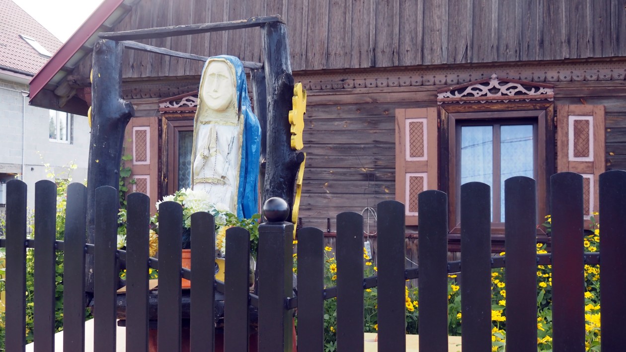 Ich kaufte noch ein und aß in einem Restaurant zu Mittag. Bei dieser Gelegenheit rief ich einen deutschen „Warmshowers“-Gastgeber an, der interessanterweise in einem Baumhaus wohnt, ob er mich in der nächsten Nacht beherbergen könnte. Leider war er selbst unterwegs, schickte mir aber den Link für Google Maps, wo ich einen wunderschönen Zeltplatz an einem Fluss finden könnte. Ich folgte dann dieser Route und nahm in kauf, dass die 133 jetzt zur A4 wurde, keine Autobahn, aber eine schnurgerade Hauptverkehrsader mit entsprechend starkem Verkehr, aber für mich jetzt ohne Alternative. In Perloja bog ich ab, in dem Ort einen Kaffee trinken zu können und machte aber stattdessen ein andere interessante Entdeckung. Perloja war in der Zeit zwischen 1918 und 1923 eine eigene Republik mit eigenem Präsidenten, eigener Verfassung, einer Armee mit 80 Soldaten, Währung, Siegel, Polizei und sogar einem Gefängnis, bis es sich 1923 dem litauischen Staat anschloss. (https://meduza.io/en/feature/2025/03/07/dispatch-from-perloja) Die Franziskus-Kirche war leider geschlossen. Auf dem Platz davor steht eine große Statue, die Vytautas den Großen darstellen soll, dem Großfürsten, der Ende des 14.Jahrhunderts die polnisch-litauische Union gegen den Deutschen Orden gründete. Vytautas und Gediminas gelten bis heute als Begründer litauischer Nationalität, denn einen Staat Litauen gab es ja erst ab 1920 infolge des Versailler Vertrages wieder. Entsprechend wird das vielerorts gewürdigt.