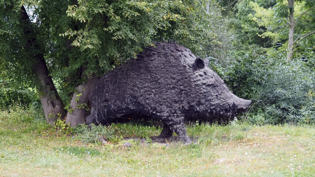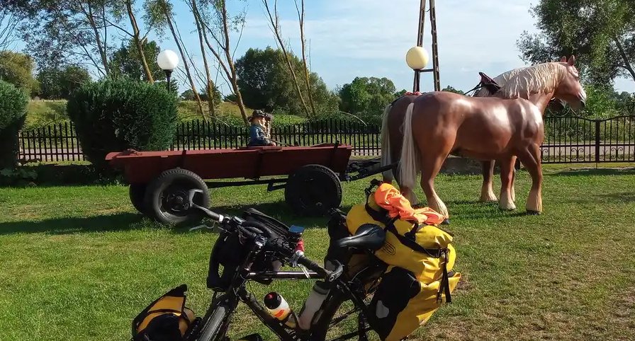 Jetzt musste ich aber langsam los und fuhr der Einfachheit halber auf der Fernstraße 64 und überlegte, wie weit ich es wohl schaffen würde. Ich würde später auf den sogenannten Zarenweg im Nationalpark Biebrza abbiegen. Der Name erinnert an die russische Besetzung Polens. Die 64 war zwar weniger stark befahren als zwei Tage zuvor die Fernstraße 62, dafür aber extrem langweilig. Schließlich bog ich in den Zarenweg ein und entdeckte nach erneuter Überquerung des Narew in Laskowiec an einem Haus eine Werbung “Stanica pod Bocianem” mit einem Campingzeichen! Nicht als Camping gelistet bei Google Maps! Ich klingelte und eine freundliche ältere Dame begleitete mich zum Nachbargrundstück mit einer Wiese, auf dem ein imposantes Pferdepaar aus Plastik imponierte.