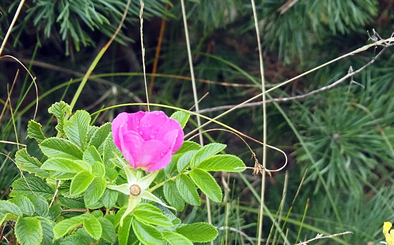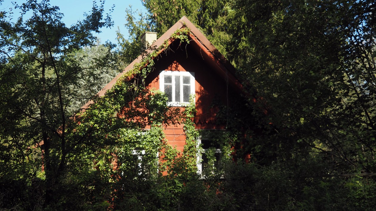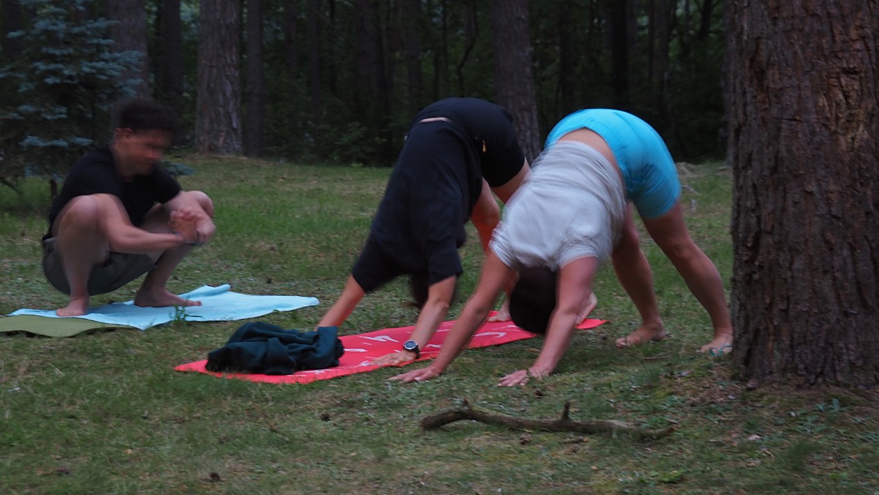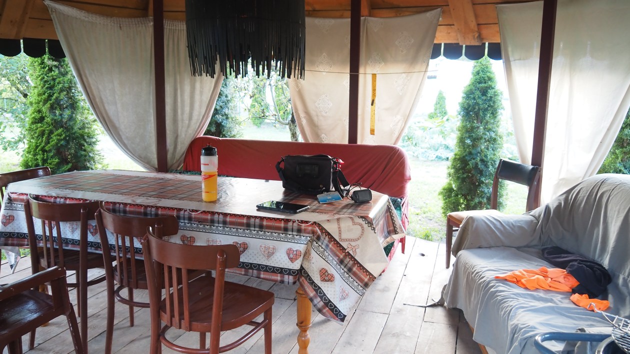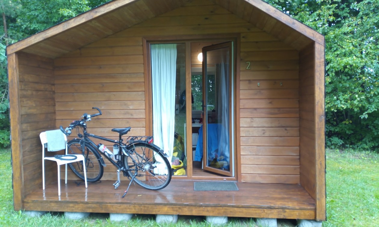 Zurück auf meine Route. Ich hielt Ausschau, ob ich bei irgendeinem Gehöft fragen wollte und sprach einen Mann an, der gerade seinen Sohn davon abhalten wollte, mit seinem Kinderfahrrad auf die Hauptstraße zu fahren und fragte, ob er einen Platz hätte, wo ich für eine Nacht zelten könnte. Das verneinte er zwar, zeigte mir aber auf Google Maps einen Platz, wo es seiner Meinung nach ginge. Ich setzte mir das als Navigationsziel und bog nach weiteren 5 km von der Hauptstraße in den Wald ab. Ich dachte, ich käme an ein “wildes” Seeufer. Aber nein, es war ein Privatgelände mit mehreren größeren Ferienhäuser, Zutritt verboten. Ich nahm den Hinweis erst mal nicht so ernst und fragte eine Frau, ob ich hier eventuell für eine Nacht zelten könne. Sie meinte, sie sei hier auch nur Mieterin und könne das nicht allein entscheiden. Nun gut, dachte ich, dann frage ich mal an einem anderen Haus und erwirkte, dass ich weiter oben hinter dem Volleyballplatz zelten könnte, eine Trockentoilette gäbe es auch. Jetzt fehlt nur noch Trinkwasser, dachte ich, und schon kam sie zu meinem Zelt mit einem 5 Liter-Kanister voller Wasser. Ich bedankte mich erfreut. Dann setzte ich mich auf die steinerne Kante des Volleyballplatzes um mein Abendessen zuzubereiten und schon kam eine andere Frau aus einem anderen Haus und lud mich zu einem Bier ein, wenn ich fertig mit essen wäre. So saßen wir dann auf der Veranda eines der Häuser später zu sechst, während ich meine Powerbank aufladen konnte. Ich wurde ausgiebig (auf Englisch) über meine Reise ausgefragt, bis irgendwann ein Teil der Gruppe für Yoga in den nahen Wald ging. Dann fing es an zu tröpfeln und ich zog mich in mein Zelt zurück.