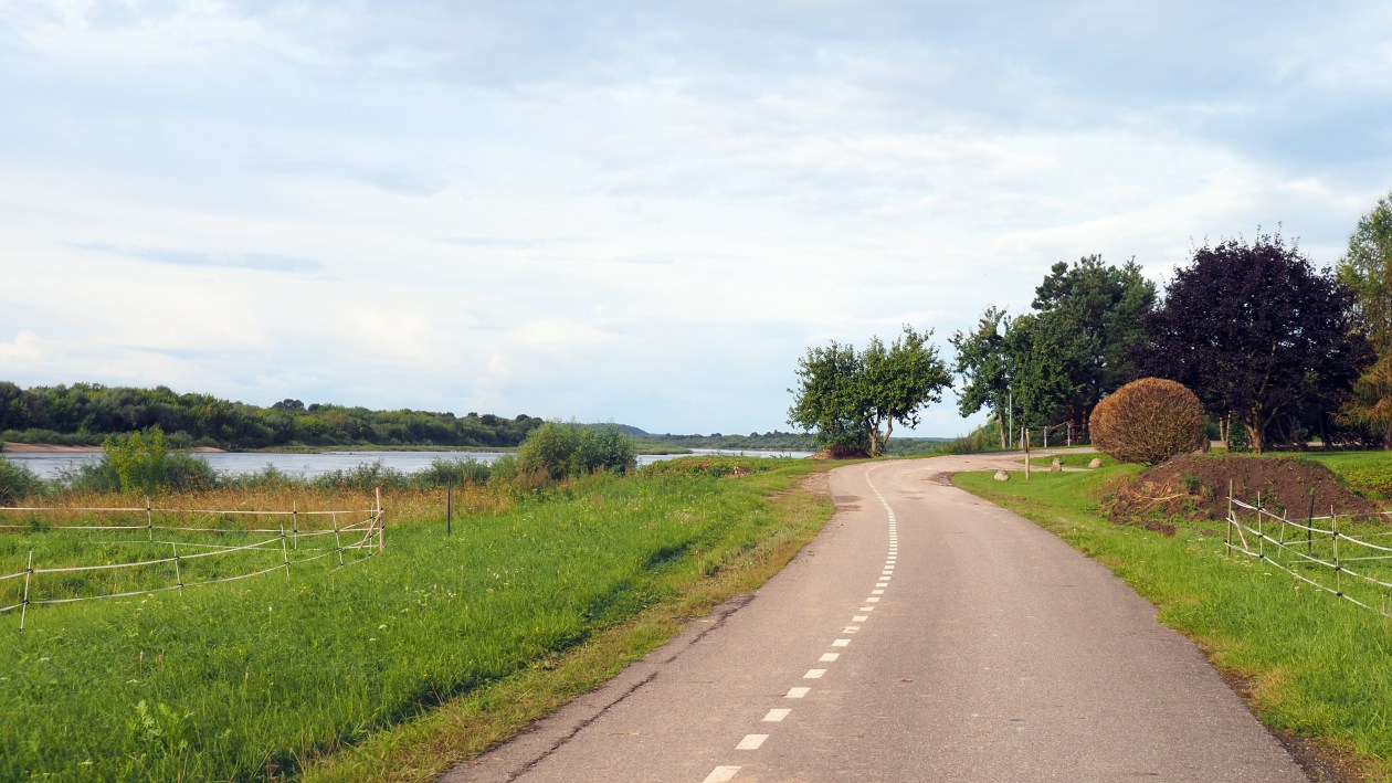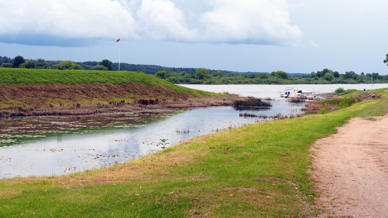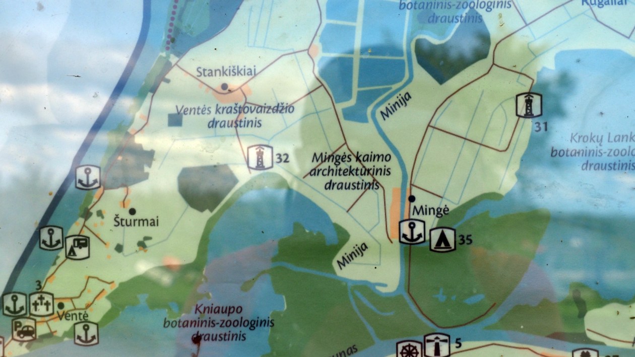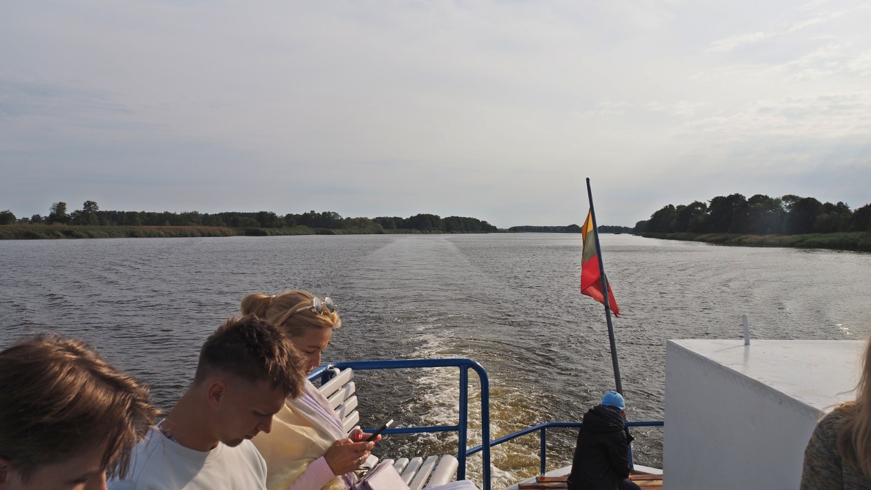 Ich musste leider feststellen, dass die Standard-Fährverbindung über die Kurische Nehrung am nächsten Morgen, einem Donnerstag, nicht verkehren würde. Aber man gab mir einen Hinweis auf eine andere Fährverbindung. Dazu musste ich 20 km weiter nach Mingé fahren, ohne schon zu wissen, wo genau ich dort zelten würde. Ich fuhr am geschützten Memeldelta entlang, rechter Hand befand sich jedoch zu meinem Erstaunen ein großes Torfabbaugebiet, obwohl damit ungeheure Mengen gebundenes CO² freigesetzt werden und es eigentlich eine Konvention zum Schutz der Moore gibt. Für die letzten 5 km musste ich dann wieder mit einem der “beliebten” Schotterwege vorliebnehmen, bis ich dann in Mingé ankam, einem zweigeteilten Dorf am gleichnamigen rechten Nebenfluss des Memel. Beide Seiten des Dorfes sind weder mit einer Fähre noch mit einer Brücke direkt verbunden. Zum Glück kam ich auf der richtigen Seite an.