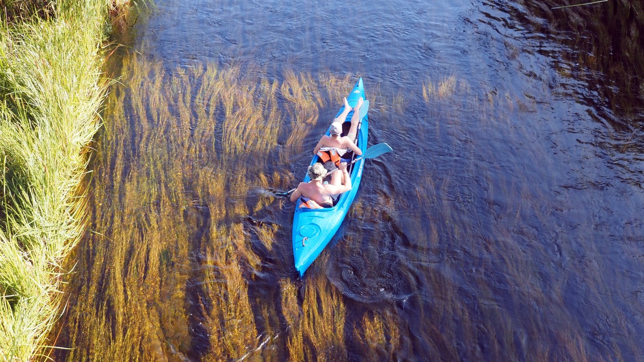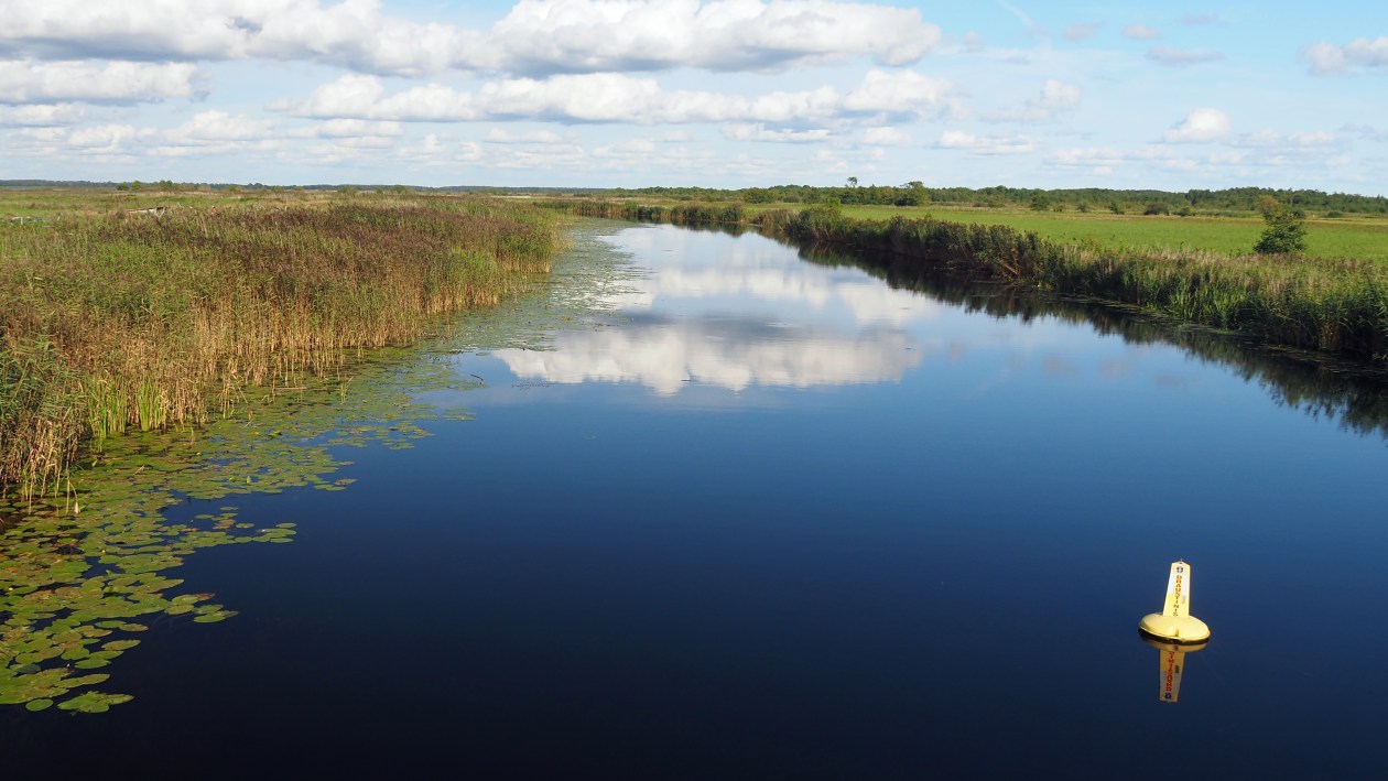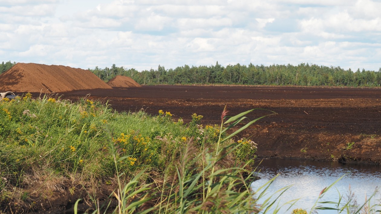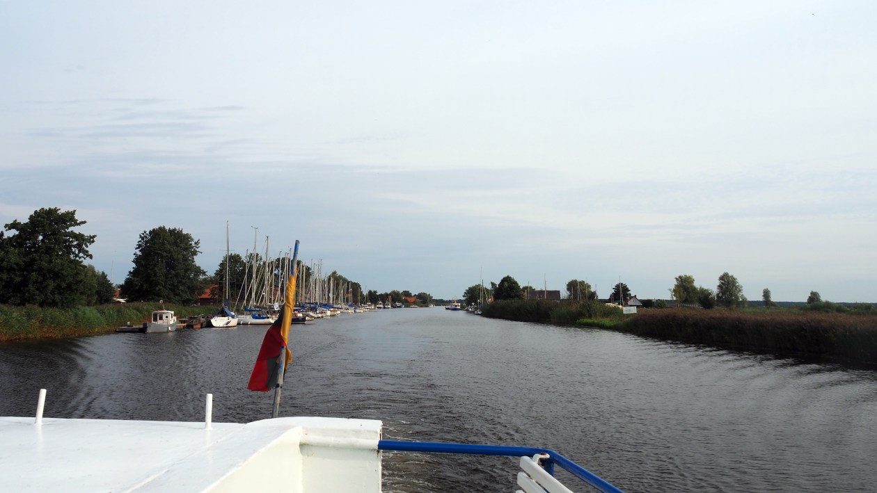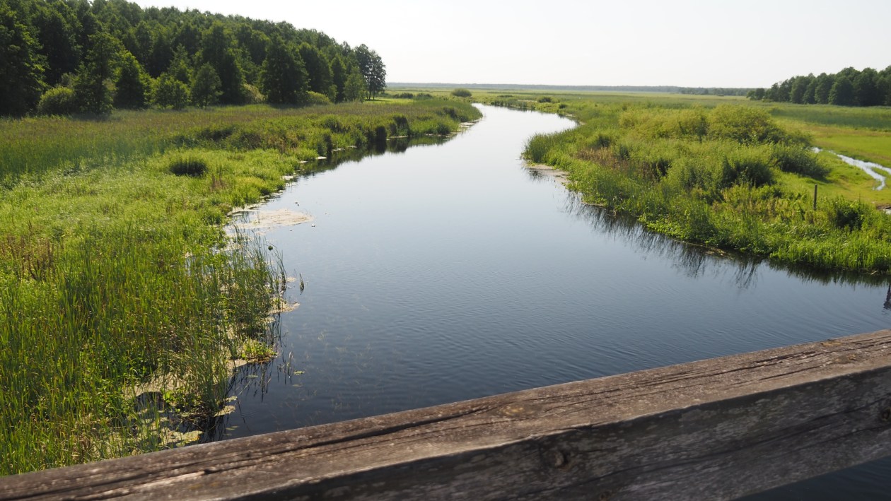 Ich musste leider feststellen, dass die Standard-Fährverbindung über die Kurische Nehrung am nächsten Morgen, einem Donnerstag, nicht verkehren würde. Aber man gab mir einen Hinweis auf eine andere Fährverbindung. Dazu musste ich 20 km weiter nach Mingé fahren, ohne schon zu wissen, wo genau ich dort zelten würde. Ich fuhr am geschützten Memeldelta entlang, rechter Hand befand sich jedoch zu meinem Erstaunen ein großes Torfabbaugebiet, obwohl damit ungeheure Mengen gebundenes CO² freigesetzt werden und es eigentlich eine Konvention zum Schutz der Moore gibt. Für die letzten 5 km musste ich dann wieder mit einem der “beliebten” Schotterwege vorliebnehmen, bis ich dann in Mingé ankam, einem zweigeteilten Dorf am gleichnamigen rechten Nebenfluss des Memel. Beide Seiten des Dorfes sind weder mit einer Fähre noch mit einer Brücke direkt verbunden. Zum Glück kam ich auf der richtigen Seite an.