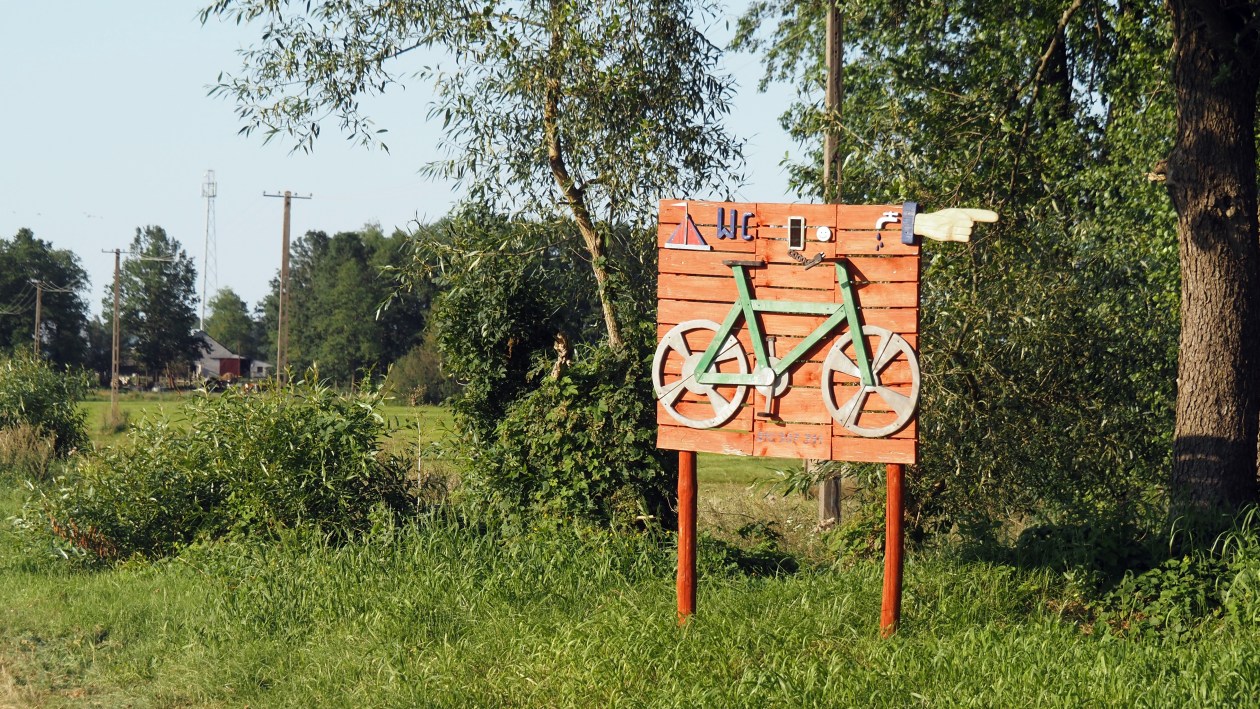 Ich befürchtete 35 km, aber zum Glück waren es dann nur 15, bis wieder eine ordentliche Straße anfing. Ich hoffte sehr, mal in die parallel verlaufende klare Biebrza springen zu können, aber an allen dafür geeigneten Stellen saßen Angler. Im Dörfchen Kopiec tauchte plötzlich ein Gehöft mit einem bunt gemalten Schild auf, das ein Fahrrad, Zelt, Dusche, WC und eine Steckdose zeigte und bremste scharf. Genau das brauchte ich jetzt! Ich erkundete den Platz, betrat ein Gebäude mit offen stehender Tür, fand ein Bad mit Dusche und Toilette, rief laut, aber niemand meldete sich. Erst als ich beim Zeltaufbau war, kam eine Frau, die mich begrüßte und ihren Mann rief. Alles war okay und wir einigten uns auf 40 Złoty, wie inzwischen üblich. Ich verzichtete ausnahmsweise als einziger Gast am Platz auf mein Überzelt und wusch noch meine verstaubte Kleidung.