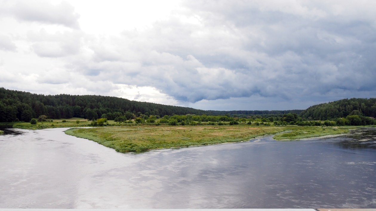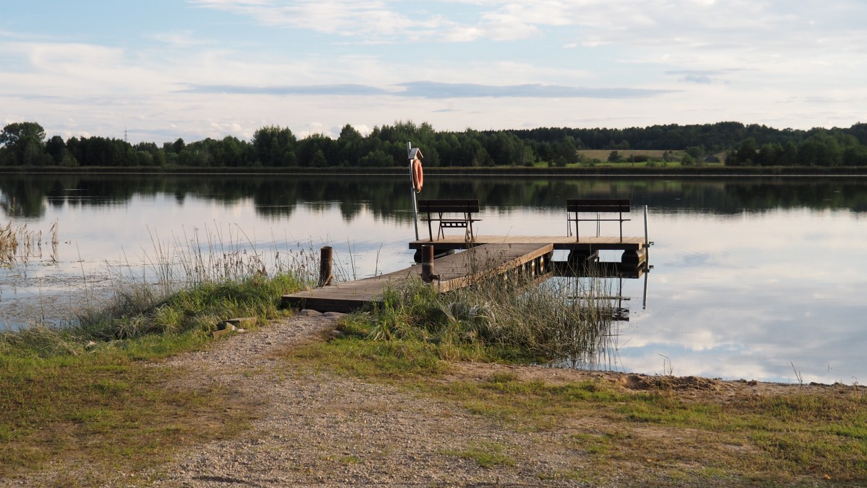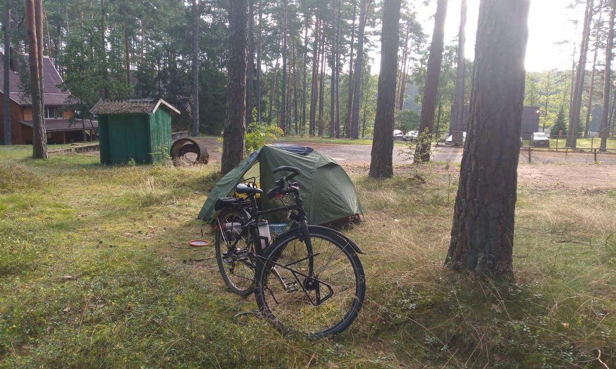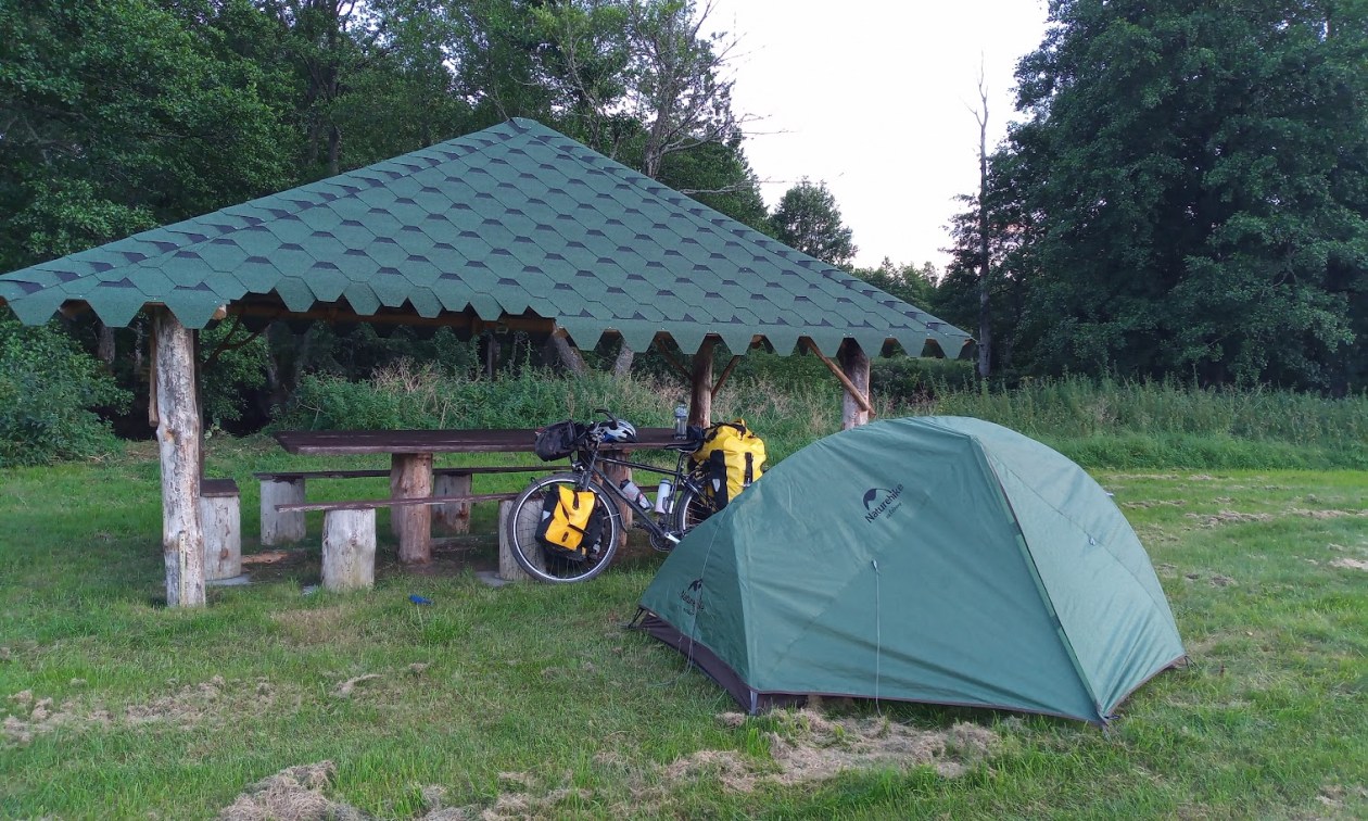 Ich folgte der A4 weiter, bis zur Abzweigung der besagten Zeltstelle. Jetzt ging es zunächst noch halbwegs ordentlich voran, dann aber, nach einer weiteren Abzweigung, auf einem kaum noch sinnvoll befahrbaren hügeligen Waldweg mit sandigen Stellen und tiefen Pfützenlöchern entlang. Mehrmals rutschte ich weg, einmal fiel ich auch hin und musste meine vordere Packtasche wieder neu anbringen, die Hose voll Sand. Endlich kam ich zu einer riesigen frisch gemähten Wiese. Kein Zeichen einer Rezeption, aber ein überdachter Unterstand mit großem Tisch und Bänken, neben dem ich mein Zelt aufschlug. Direkt am Fluss Merkys. Vermutlich ein Rastplatz für Bootswanderer, aber völlig leer. Leider war kein Trinkwasser erreichbar und die Oberfläche des Flusses war wegen des steilen Ufers zu unerreichbar, um etwas zum Filtern heraus zu angeln. Aber die anderthalb Liter, die ich noch in meinen Flaschen hatte, reichten gerade noch bis zur Abfahrt am nächsten Tag. Eine stille Nacht, nur der Fluss rauschte und gurgelte leise…