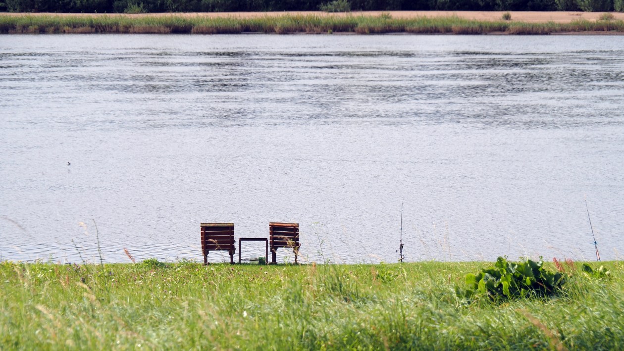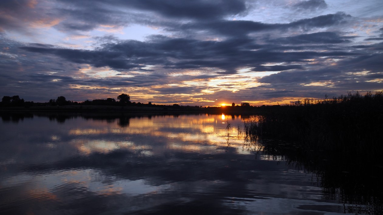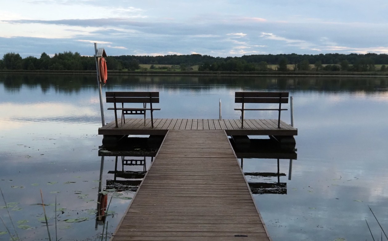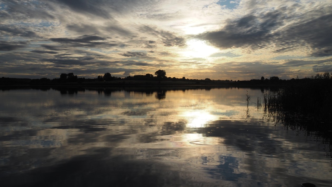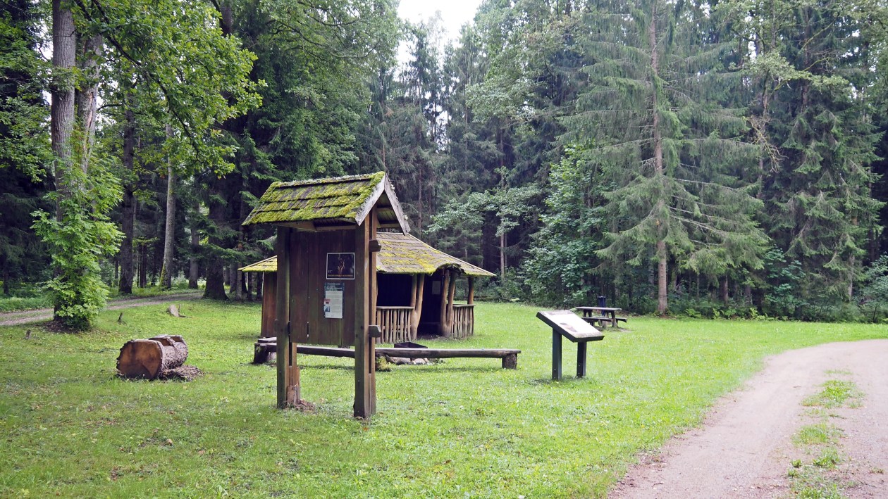 Ich folgte der A4 weiter, bis zur Abzweigung der besagten Zeltstelle. Jetzt ging es zunächst noch halbwegs ordentlich voran, dann aber, nach einer weiteren Abzweigung, auf einem kaum noch sinnvoll befahrbaren hügeligen Waldweg mit sandigen Stellen und tiefen Pfützenlöchern entlang. Mehrmals rutschte ich weg, einmal fiel ich auch hin und musste meine vordere Packtasche wieder neu anbringen, die Hose voll Sand. Endlich kam ich zu einer riesigen frisch gemähten Wiese. Kein Zeichen einer Rezeption, aber ein überdachter Unterstand mit großem Tisch und Bänken, neben dem ich mein Zelt aufschlug. Direkt am Fluss Merkys. Vermutlich ein Rastplatz für Bootswanderer, aber völlig leer. Leider war kein Trinkwasser erreichbar und die Oberfläche des Flusses war wegen des steilen Ufers zu unerreichbar, um etwas zum Filtern heraus zu angeln. Aber die anderthalb Liter, die ich noch in meinen Flaschen hatte, reichten gerade noch bis zur Abfahrt am nächsten Tag. Eine stille Nacht, nur der Fluss rauschte und gurgelte leise…