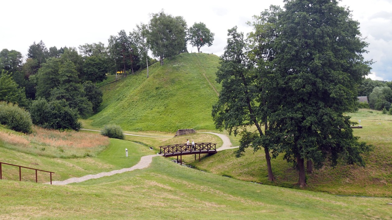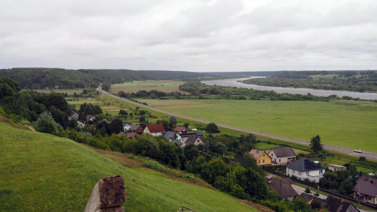 Zurück zur Gabelung. Dann wurde der Weg befahrbarer. Sie waren nun schneller unterwegs als ich. In Vilkija gab es einen Imbiss, und da traf ich sie wieder. Wir unterhielten uns und von dort aus entschieden wir, doch auf der 141 zu fahren. Aber sie waren zu schnell für mich und ich ließ sie einfach fahren. Mich stört so etwas nicht mehr, Jüngere sind eben fitter, da muss ich mich nicht vergleichen oder anpassen. Außerdem herrschte die ganze Zeit Gegenwind. In Seredžius sah ich das Hinweisschild eines Lebensmittelladens. Ich bog dorthin ab und hoffte, dort einen Kaffee trinken zu können. Leider gab es keinen, aber er hatte ein Angebot, wie ein General Store in den USA, von Schrauben über Schuhcreme bis hin zu Lebensmitteln. Gegenüber begann eine lange Treppe aufwärts zur Anlage einer ehemaligen Hügelburg, von der aus ich eine wunderbare Aussicht über die Memelwindung hatte. Ein einst strategisch interessanter Ort.