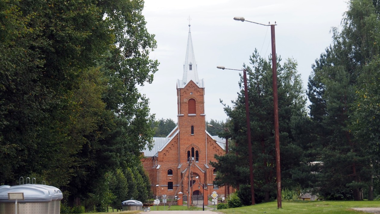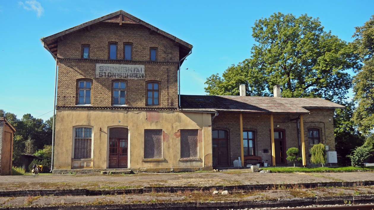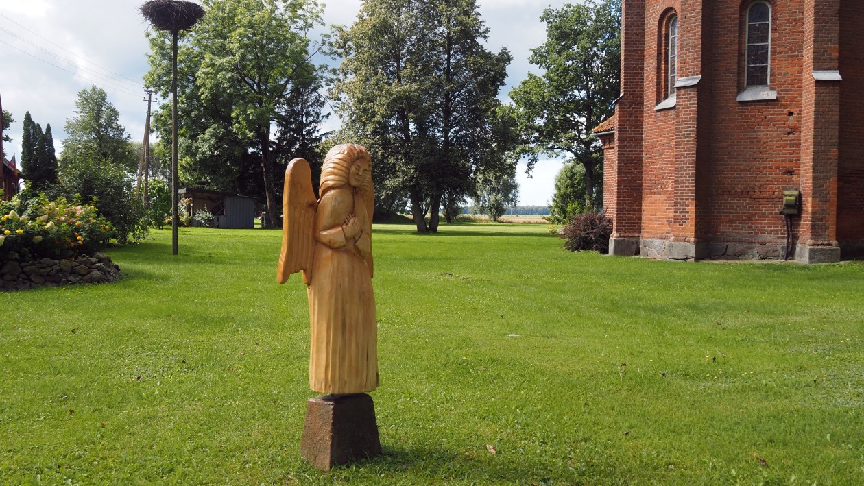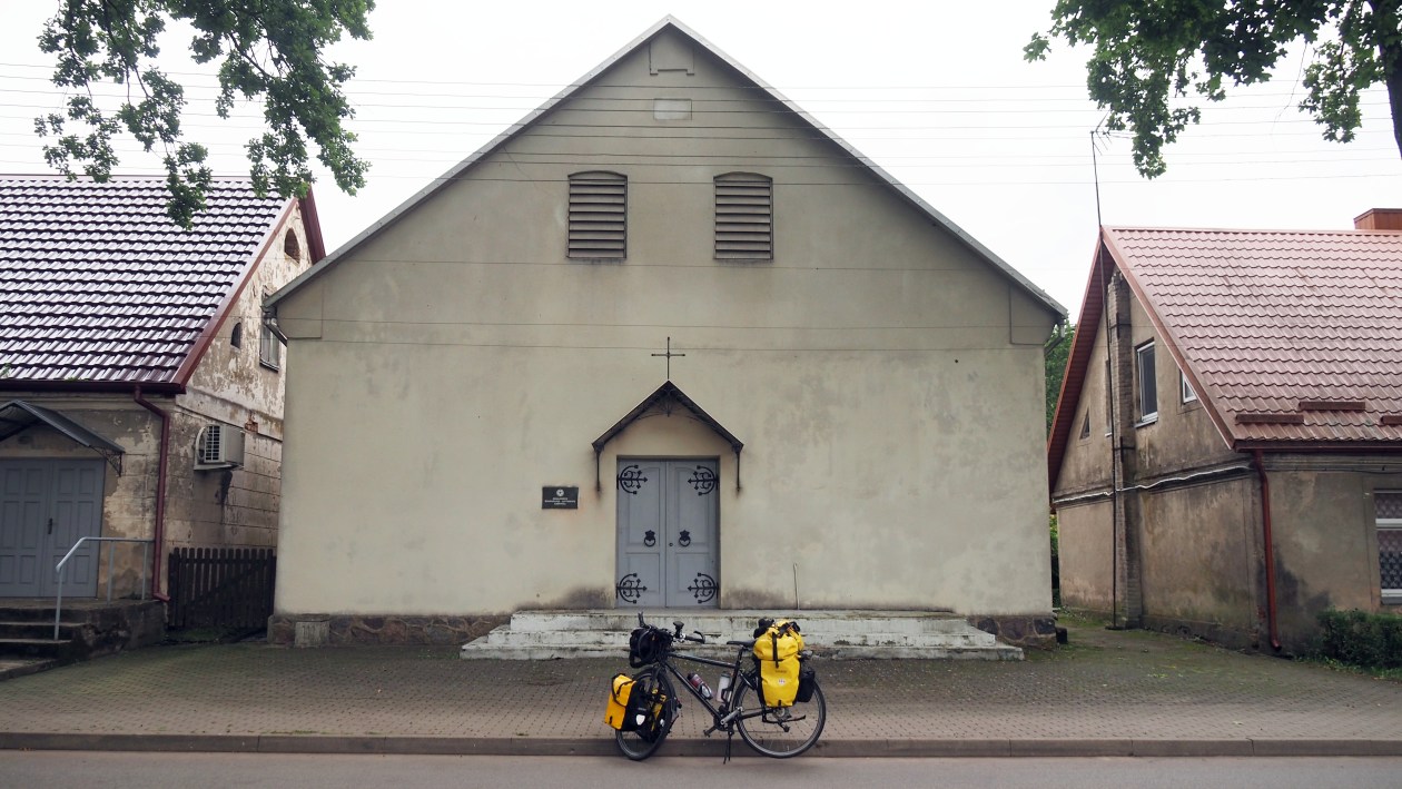 Noch 3 Tage und ich würde Litauen wieder verlassen. Aber zuerst musste ich nach Šilutė / Heydekrug und von dort zu einer Fähre über die Kurische Nehrung radeln. Zurück über die einsame E 77 zur 141. Brötchen erstand ich im ersten Supermarkt in Pagegiai/Pogegen. In Litauen gibt es übrigens ein ähnliches Backwarenangebot wie in Deutschland! Dann weiter durch die wenig interessant wirkende Stadt. Ich bog aus reiner Neugierde zur Bahnstation Stoniskiai/Stonischken ab, die erkennbar die litauische und deutsche Bezeichnung trug, aber wohl nicht mehr für den Personenverkehr genutzt wurde. Einen Güterzug sah ich später vorbeifahren. Ich hielt dann an einer ehemals deutschen Evangelischen Kirche. Ein Mann gärtnerte dort mit seinem Bruder. In gebrochenem Deutsch erzählte er mir, dass er Holzbildhauer sei und aus Nida/Nidden käme. Leider war die wenig genutzte Kirche verschlossen, aber ich umrundete sie und macht ein paar Fotos.