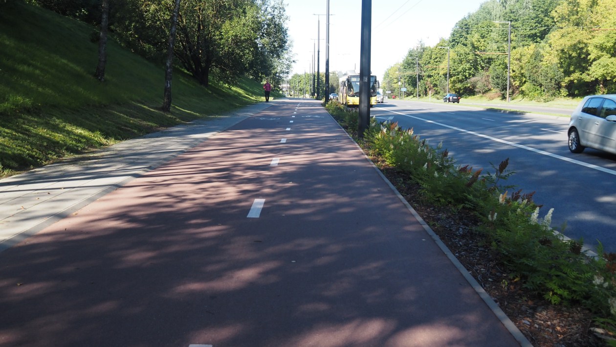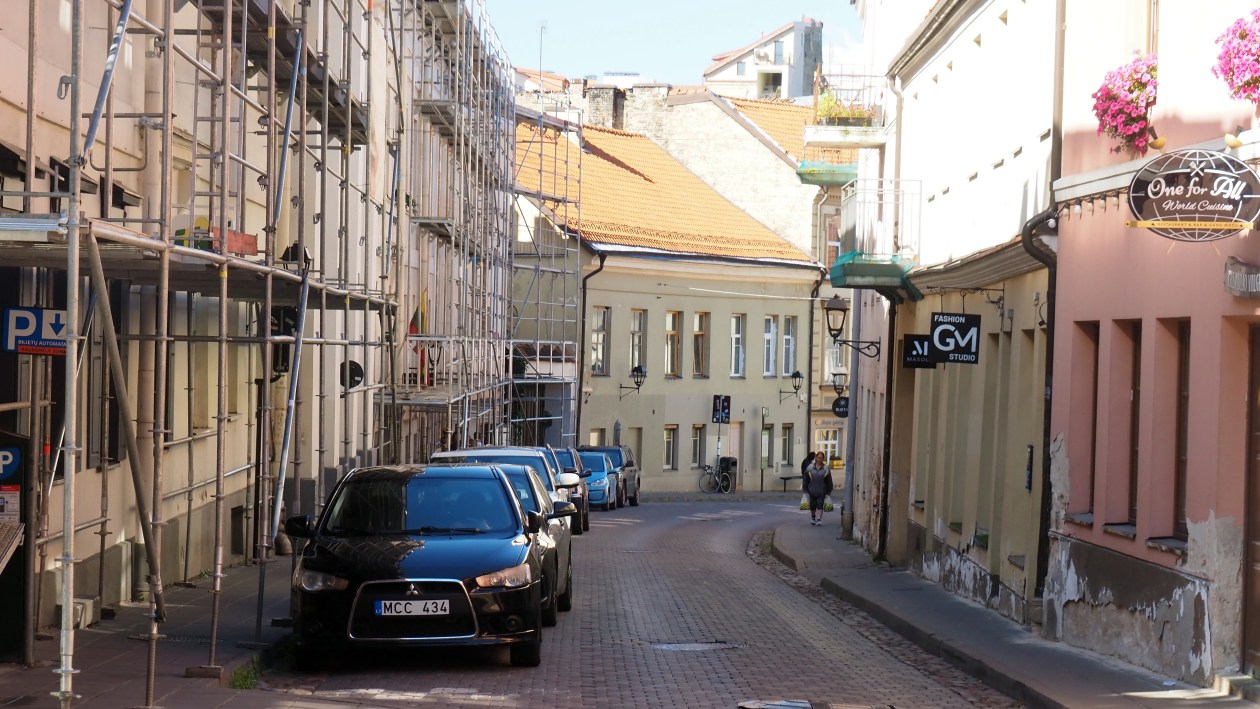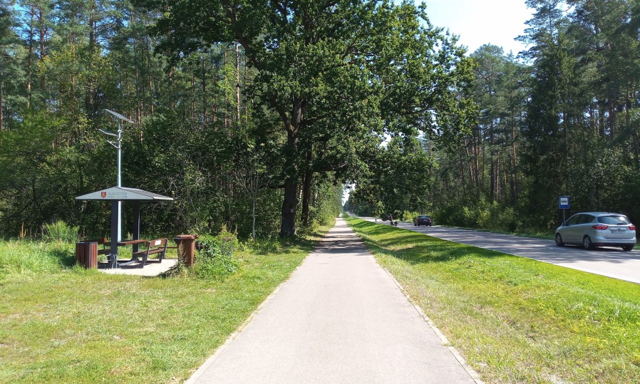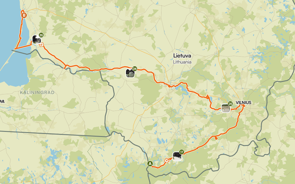 Zum Glück ging es ab dem nächsten Dorf einigermaßen normal weiter, immer in einigem Abstand zur Autobahn. Nach deren Unterquerung bei Rumšiškės hatte ich nur die Wahl zwischen einem Waldweg für eine nicht klar erkennbare Länge – immerhin halbfest – zu fahren oder einen langen Umweg in Kauf zu nehmen. Ich entschied mich für den Waldweg und zum Glück hatte ich nach 4 km wieder festen Boden unter den Reifen und erreichte so auch die ersten Häuser der Außenbezirke von Kaunas, der zweitgrößten litauischen Stadt. Bis zu meinem Ziel, ein AirBnB-Zimmer, sollten es noch 25 km sein. Die Strecke entpuppte sich als eine echte großstädtische Herausforderung, teils ohne Radweg, dafür umso mehr Verkehr. Und fast wäre ich überfahren worden! Als ich ungeduldiger Mensch, um einen Ampelstau abzukürzen, von der zu schmalen Fahrbahn auf den zu schmalen Fußweg wechselte, musste ich einem tief hängenden Ast ausweichen, rutschte mit dem Vorderrad wieder auf die Fahrbahn und kippte dann komplett um. Zu meinem Glück stoppte der Verkehr sofort und ich räppelte mich unter meinem Rad hervor, hievte alles wieder auf den Fußweg und stellte fest, dass das dies Halterung meines Navis beschädigt hatte und ich ihn erst einmal lose in die Lenkertasche legen musste, wo er mir nicht viel nützte. Bei näherer Betrachtung erkannte ich, dass sich das gut mit Sekundenkleber kleben lassen müsste. Nur leider – die Tube, die ich dabeihatte, bestand nur noch aus aufgeblähter Luft.