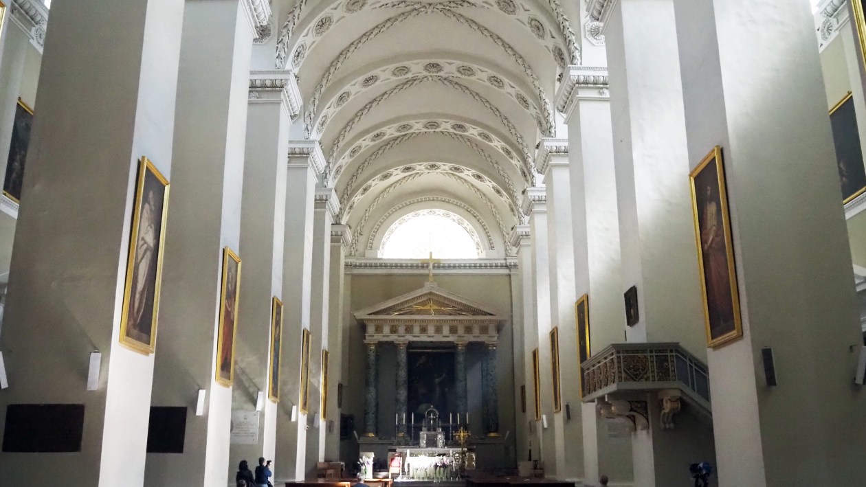 Jedenfalls wurde aus dem Waldweg auf polnischer Seite jetzt eine neue und frisch geteerte, aber völlig leere Landstraße, die aber nach anderthalb Kilometern zu einer ewig langen Baustelle wurde, an der ich aber immerhin gut entlangfahren konnte. Aber auch Kopfsteinpflaster blieb mir nicht erspart. In Kapčiamiestis konnte ich wieder für Euro im dörflichen Supermarkt einkaufen und erkannte sofort, dass die Preise eher denen in Deutschland ähneln als den wesentlich günstigeren in Polen. Hier wurde mir wieder bewusst, wie fremd mir litauisch ist. Kein einziges Wort, das mich an irgendetwas aus einer slawischen, romanischen oder indogermanischen Sprache erinnert. Zum Glück verstehen die meisten Menschen wenigstens etwas Englisch. Nach einer Mittagspause am Marktplatz ging es weiter bis Leipalingis, wo ich plante eventuell an einem kleinen See zu zelten, aber mir war nicht nach wild zelten am Ortsrand, ohne dass ich das Wasser im See wegen des Schilfgürtels erreichen konnte. Einen Campingplatz ortete ich abseits meiner Route 17 km südlich und machte mich auf den Weg. Ich kam an einer wunderschönen spätklassizistischen Kirche vorbei, die ich aber wegen einer gerade stattfindenden Messe nur von de Tür aus innen anschaute. Dann geriet ich aber auf eine so irre Schotterstrecke, so dass ich nach wenigen Kilometern aufgab und kehrt machte. Die ideale Strecke für Gravel-Fans, zu denen ich mit meiner Ausstattung nicht gehöre. Da in Litauen Zelten überall erlaubt ist, wo es nicht ausdrücklich verboten ist, wollte ich eine andere Lösung suchen.