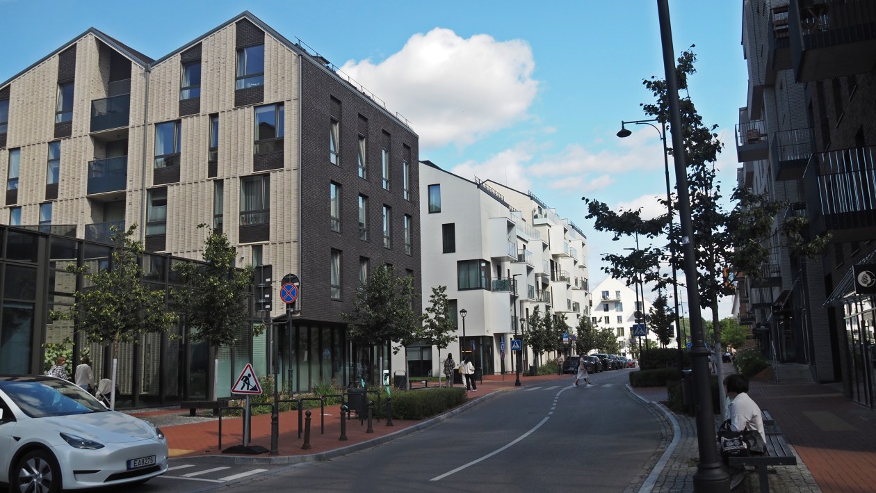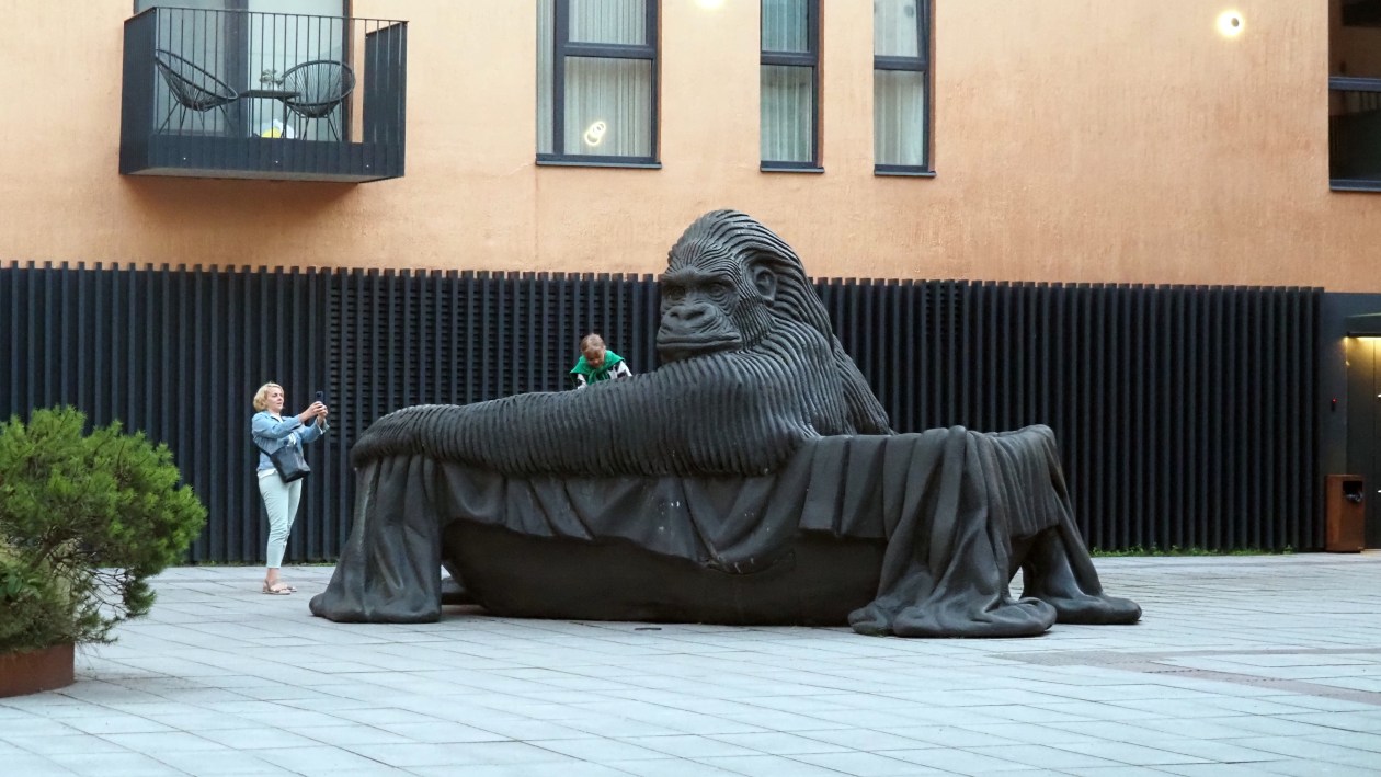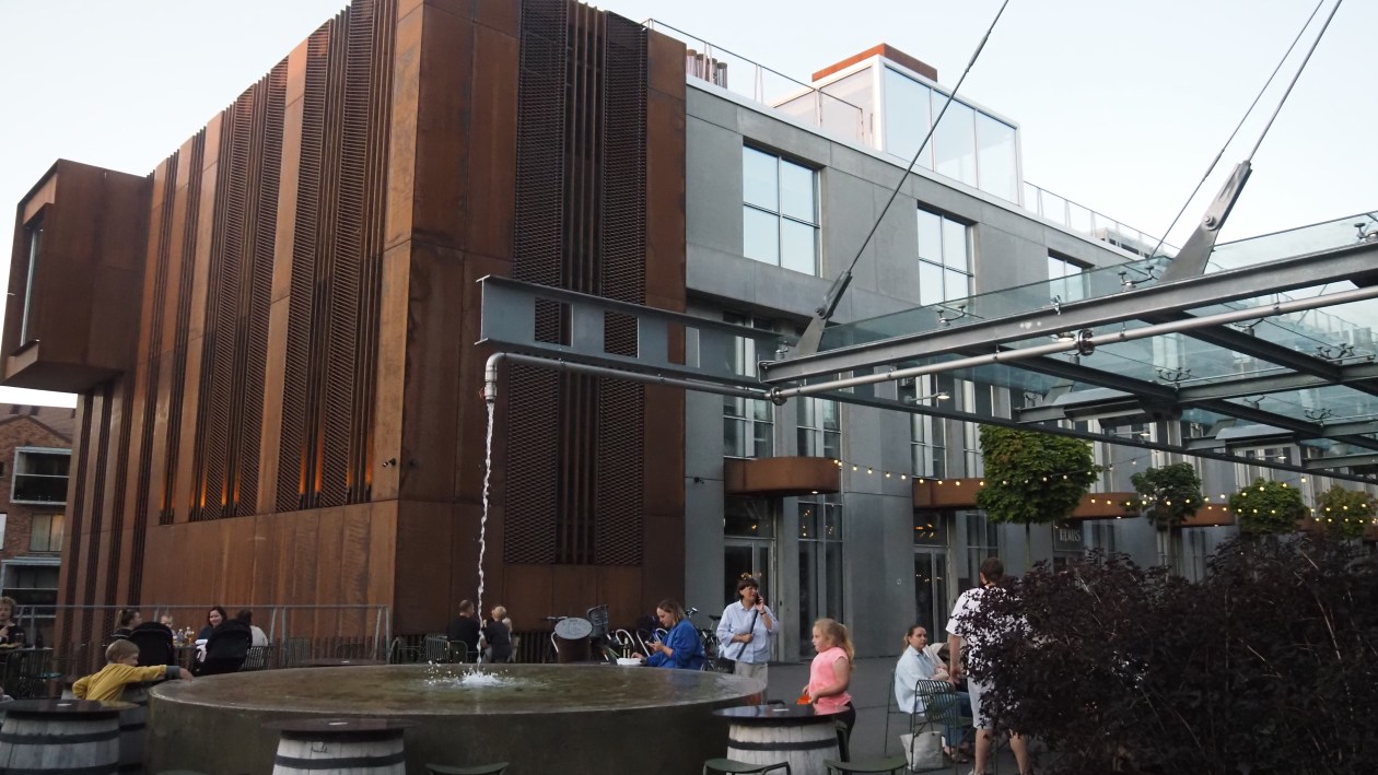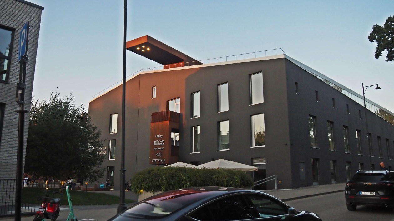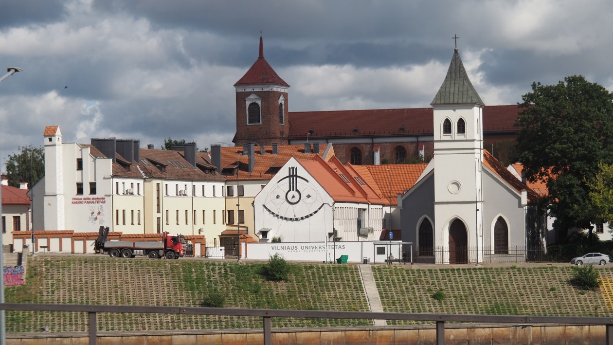 Als ich später zurück zu meinem Zelt kam, hörte ich um mich herum Deutsch. Ich stellte fest, dass es sich um eine Familie deutscher Radfahrer handelte, die gerade eine Baltikum-Rundfahrt machten. 2 Söhne, 15 und 17 Jahre alt, die Eltern und die Großeltern. Ich fragte, ob ich mich dazu setzen dürfe, und wir kamen ins Gespräch miteinander. Ich fragte auch, ob die Großeltern der Ursprung dieses Hobbys wären, aber nein, es waren die Eltern, die hierbei ansteckend gewirkt hatten. Ich erzählte von Užupis, und so beschlossen wir, gemeinsam dort Essen zu gehen und später Užupis im Dunkeln zu besichtigen. Unser Weg führte zunächst an moderner Bebauung nahe des Campings vorbei.