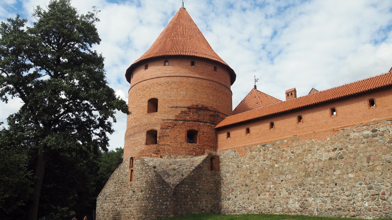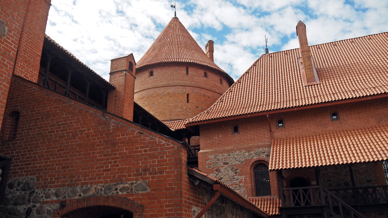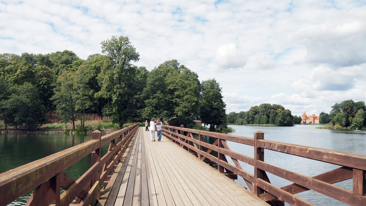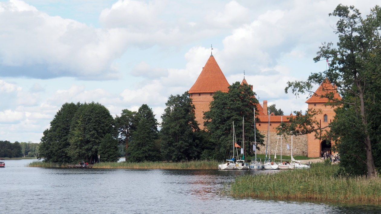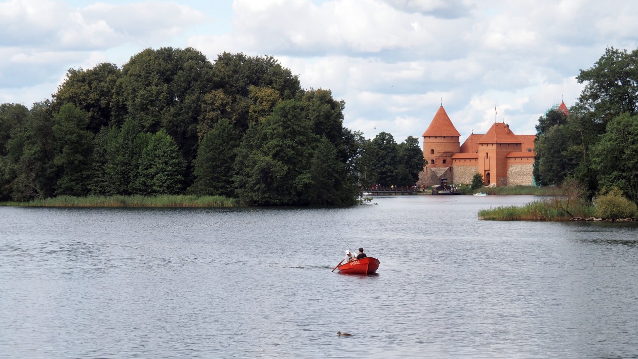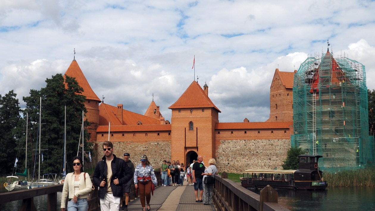 Trakai war ein Zwischenziel für diesen Tag. Er war im 14.Jahrhundert für sieben Jahre Hauptstadt des Großfürstentums Litauen, das sich von der Ostsee bis zum Schwarzen Meer ausdehnte, bis diese nach Vilnius verlegt wurde. Hier gibt es eine Inselburg, durch Brücken, auf denen Radfahren verboten ist, mit dem Ort verbunden. Also schob ich das Rad durch die Menschenmassen, die das gleiche Ziel hatten, und parkte es samt Gepäck vor der Burg. Dann begann ich mich an der Schlange vor der Kasse anzustellen, bis mir klar wurde, dass mir für einen mehrstündigen Besuch einfach die Zeit fehlte und so erhaschte ich wenigstens einen Blick in den Innenhof.