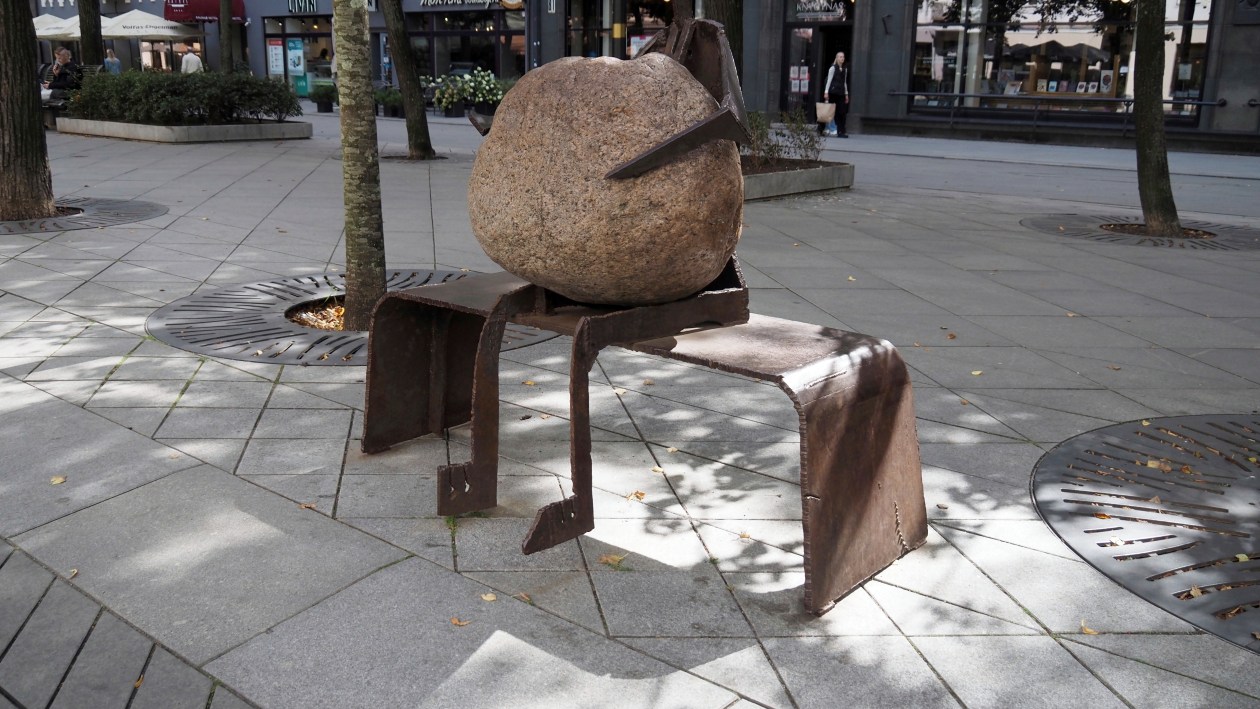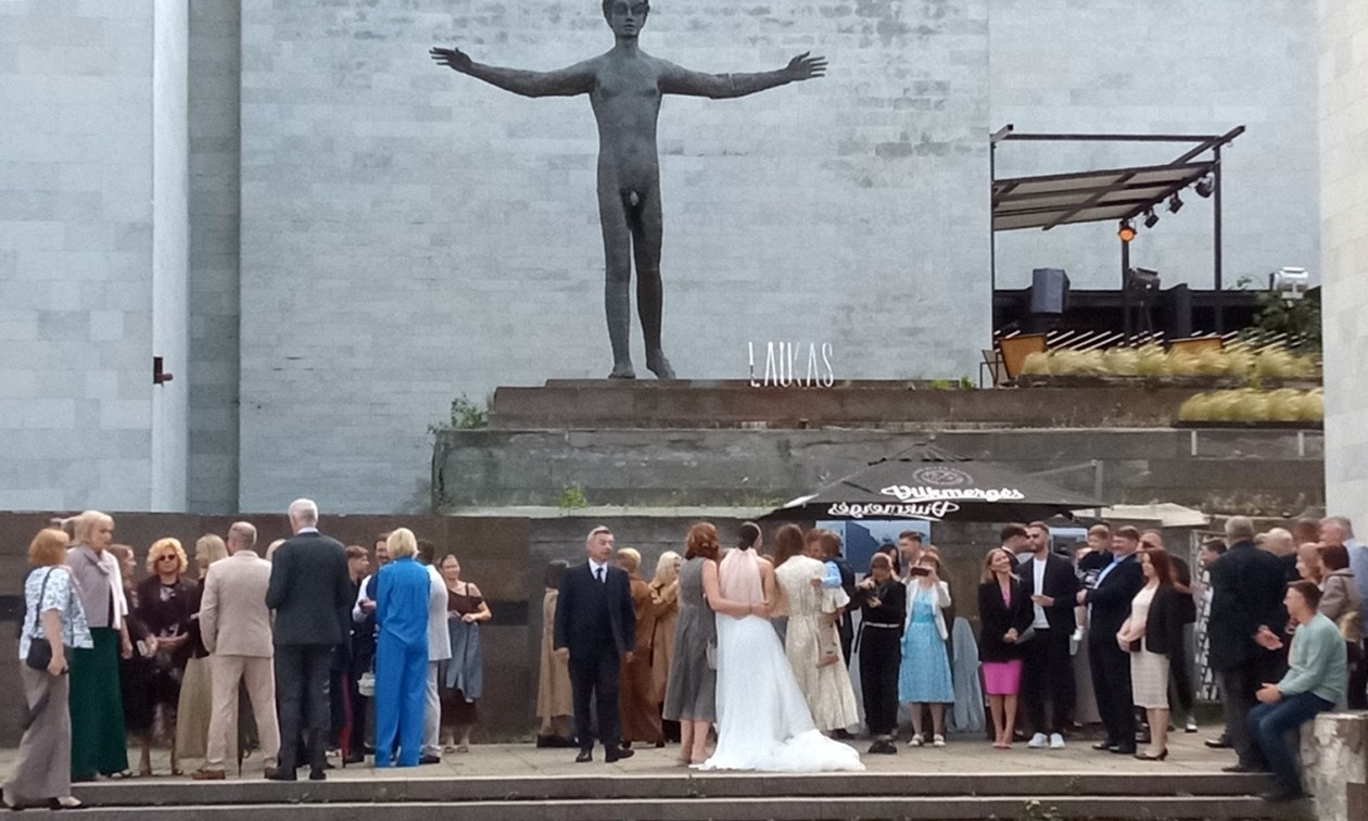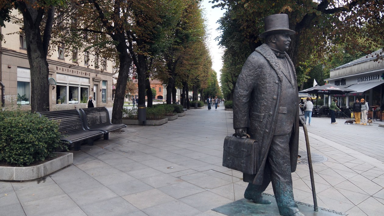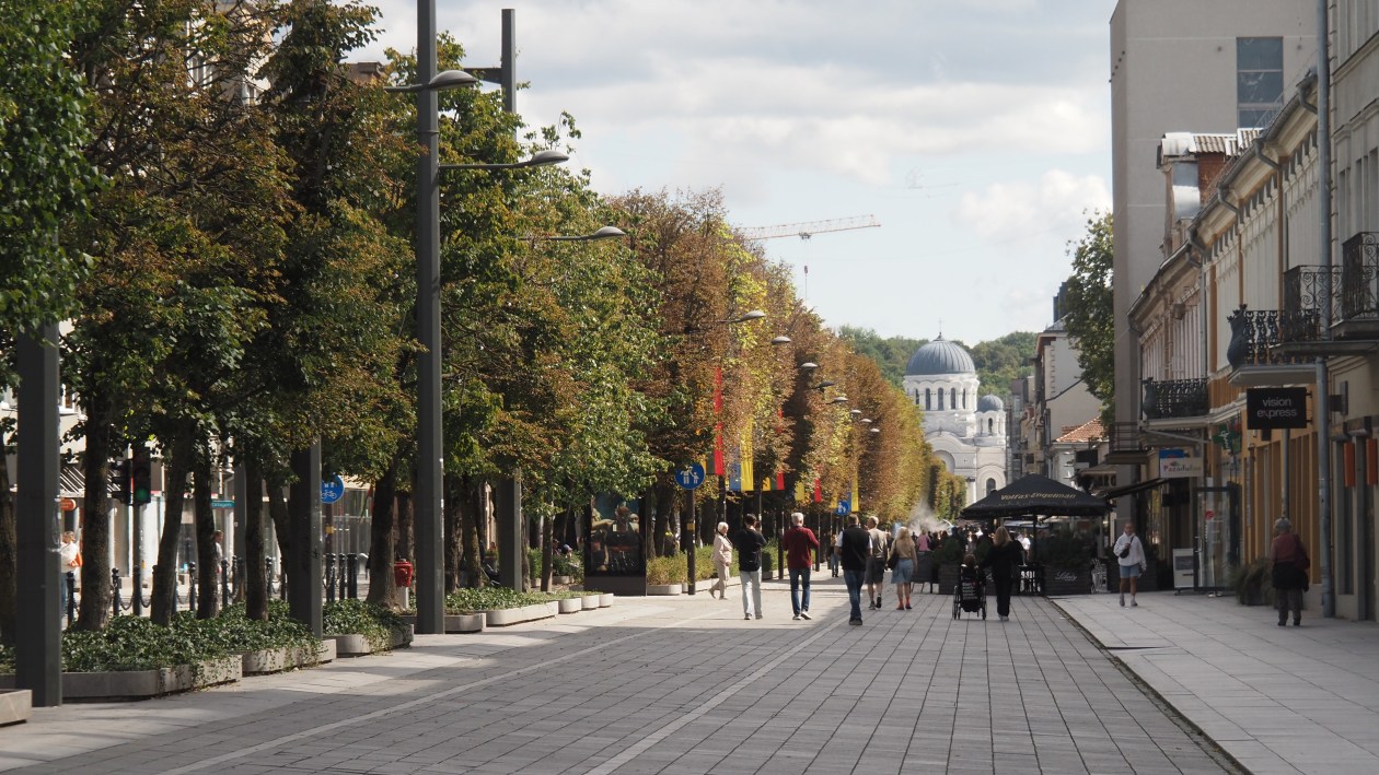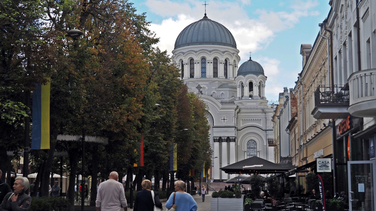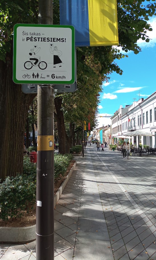 Ich musste unbedingt ein Lederwarengeschäft finden, denn meine Gürtelschnalle war fast abgerissen. Das, das ich recherchiert hatte, sollte heute am Samstag geöffnet sein. Dem war aber nicht so. Ich versuchte es mit anderen Modegeschäften, aber alles war für Damen und sie hatten nichts Passendes. Dann stieß ich auf die große, lange sehr repräsentativ Freiheitsallee ( Laisvės alėja) mit vielen Bäumen auf dem Mittelstreifen. Rechts Fußgängerzone, links Rad- und Fußweg. Hier fand ich ein Geschäft, das zumindest zwei passende Gürtel vorrätig hatte und kaufte mir einen. Die gesamte Allee ist abwechselnd litauisch und ukrainisch beflaggt, als Zeichen der Solidarität mit der Ukraine. Ich kam am ehemaligen Regierungssitz, einem klotzigen Gebäude im Bauhaus-Stil, vorbei, das zu Sowjetzeiten als Provinzverwaltung und heute als Standesamt dient. Mit einer pathetischen Gediminas-Reiterstatue davor.