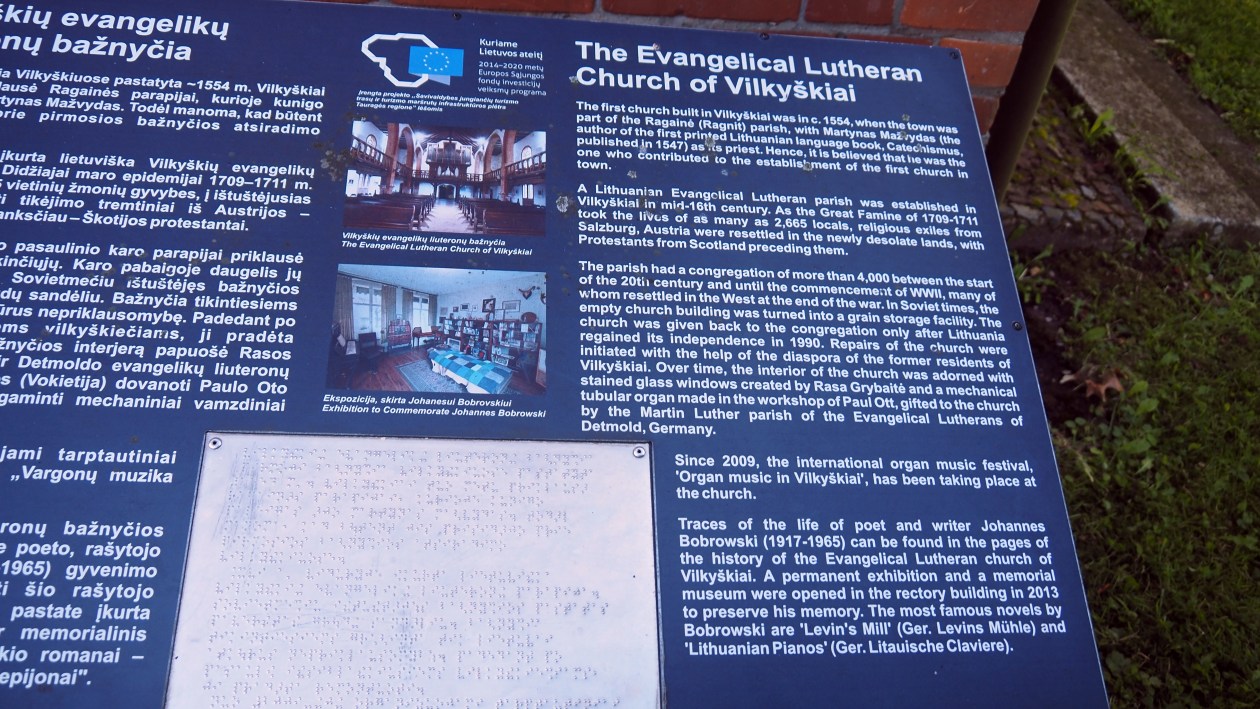 Weiter durch diese Region begegnete mir der Name des Schriftstellers Johannes Bobrowski. In Vilkyskiai/Willkischken befand ich mich plötzlich auf der Johaneso Bobrovskio gata und wunderte mich. Stammte dieser deutsche Schriftsteller von hier? Es gibt sogar ein Johannes-Bobrowski-Gymnasium! Nähere Recherchen ergaben aber, dass dieser oft seine hier im Ort lebende Großmutter besuchte und ebenso die Dörfer in der Umgebung. Dies spiegelt sich in seinem Roman Litauische Claviere wider. Es gibt eine restaurierte Evangelische Kirche und die Rekonstruktion seines Berliner Arbeitszimmers im Gemeindehaus. Leider geschlossen, als ich dort war.