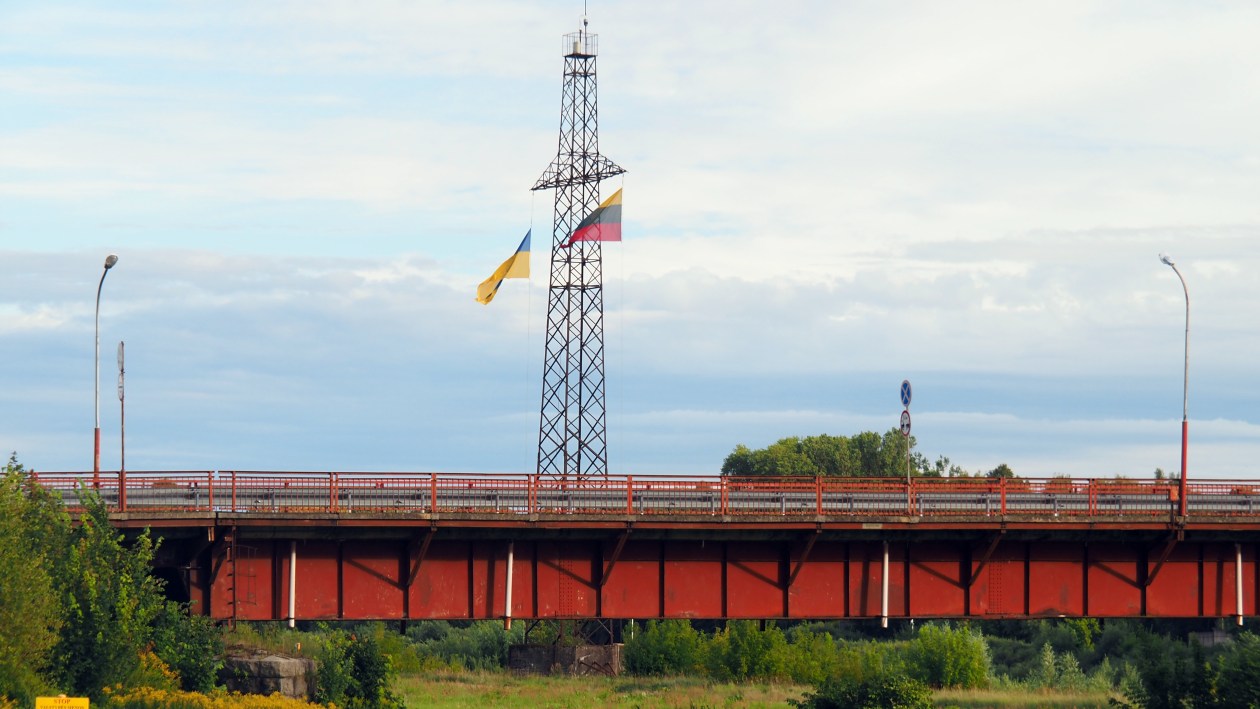 Jetzt war ich unheimlich neugierig auf diesen Ort geworden. Schon 2 km vorher gab es eine wie ausgestorben da liegende Grenzabfertigung für LKW, die von der E 77 abbiegt und über eine extra gebaute neue Straße zu einer extra dafür gebauten neuen Brücke führt. Hier im Ort befindet sich der ältere Grenzübergang über die immer noch so heißende Königin-Luise-Brücke nach Sowjetsk, früher Tilsit. (Den gleichnamigen Käse haben die Russen nicht mit umbenannt, dachte ich mir.) Ich ging durch eine Parkanlage, vorbei an einem Friedensengel so nah wie möglich ans Ufer heran und warf einen Blick auf die andere Seite. Da lag die Stadt, einst Tilsit. Ein wie ein zufälliges architektonisches Element wirkendes Z auf einer Hauswand drohte herüber. Die Brücke links von mir, jetzt mehr wie ein bombastisches Denkmal. Auf litauischer Seite wehten stolz eine ukrainische und eine litauische Flagge. Kein Mensch, nirgends.