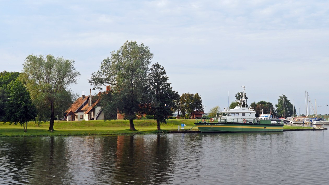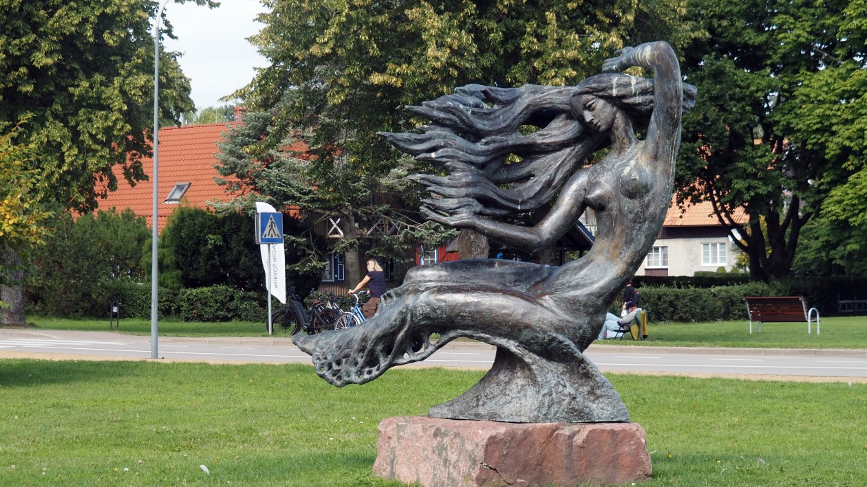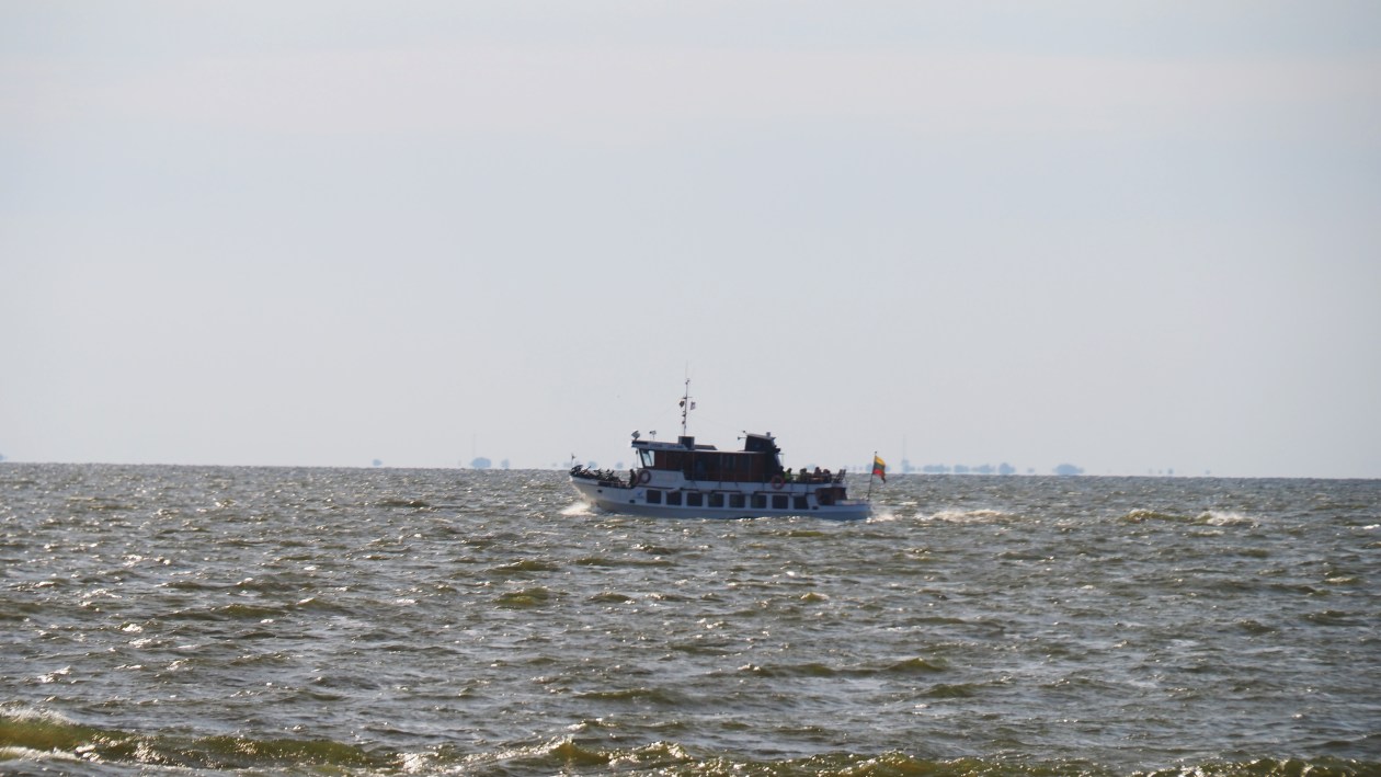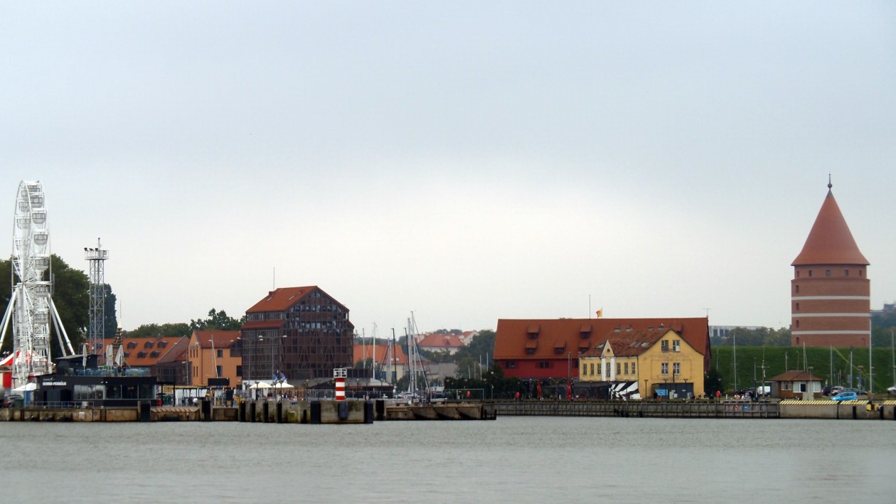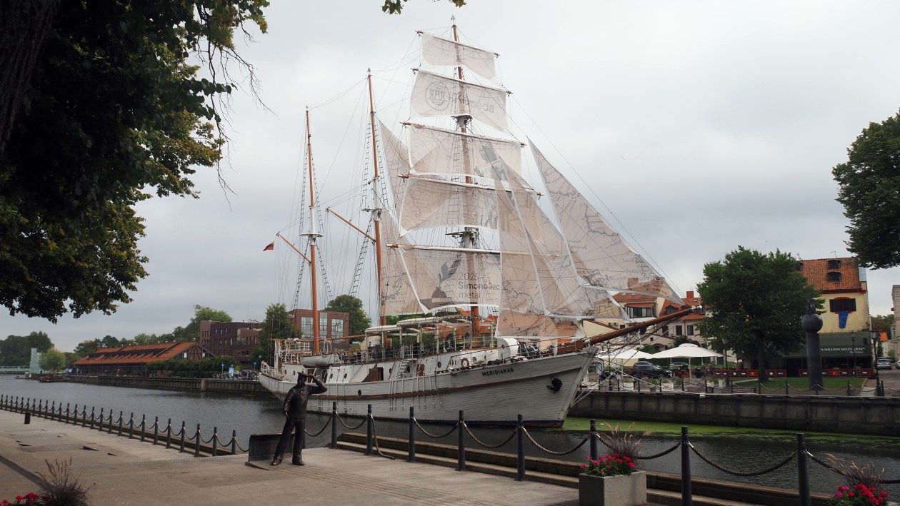 Für Radfahrer gibt es im Sommer die Fußgängerfähre, die alle halbe Stunde direkt in der Nähe der Altstadt die Mündung des Kurischen Haffs überquert. Vor dort kann man das Panorama der Stadt bewundern. Ich besuchte dann noch das Simon-Dach-Denkmal mit Ännchen von Tharau obenauf, ging in ein Restaurant am Theaterplatz, machte dann einige Zick-Zack-Wege durch einen Park und bewunderte ein al Restaurant dienendes Segelschiff, dann fuhr ich langsam zu meinem Fährhafen, entlang viel befahrener Straßen und kam rechtzeitig dort an. Nach 1350 km war ich am Ziel.