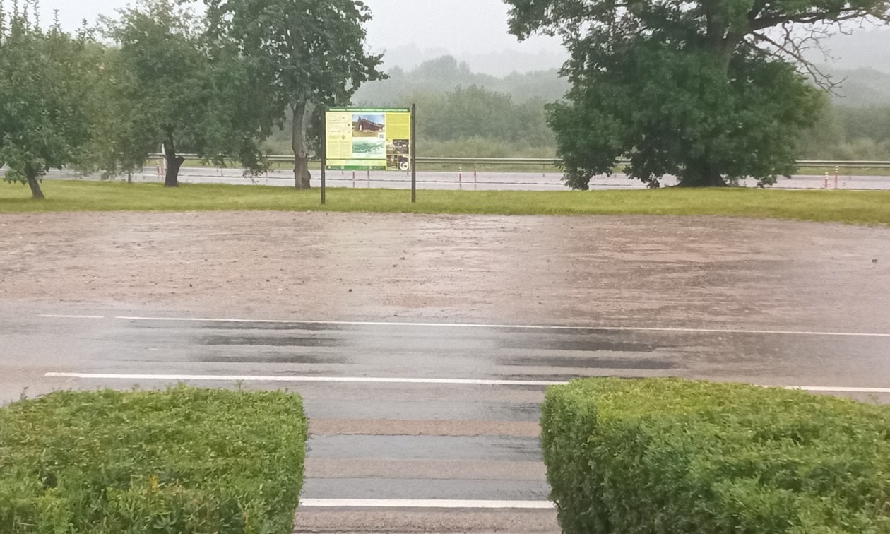 Bei diesem Wetter irgendwo wild zu zelten, war für mich undenkbar. Noch 32 km bis zum nächsten Campingplatz, bei dem ich hoffte, eine Hütte mieten zu können. Wieder nahm der Regen zu. Ich fuhr wie in einer unendlichen Waschanlage und fühlte mich wie 2017 in Neufundland, nur dass es damals dort mit 8°C wesentlich kälter war. Meine Regenbekleidung versagte völlig. Auch meine neue norwegische Regenhose, die angeblich eine Dichte von 20 l pro cm² hatte, war komplett durchnässt und natürlich auch die Hose darunter. Nirgends war etwas zum Unterstellen in Sicht. Die weiter oberhalb der Straße liegende Burg Panemuné ließ ich rechts liegen. Erst 500 m vor dem Campingplatz nahe Šilinė konnte ich mich patschnass unter ein Vordach flüchten.