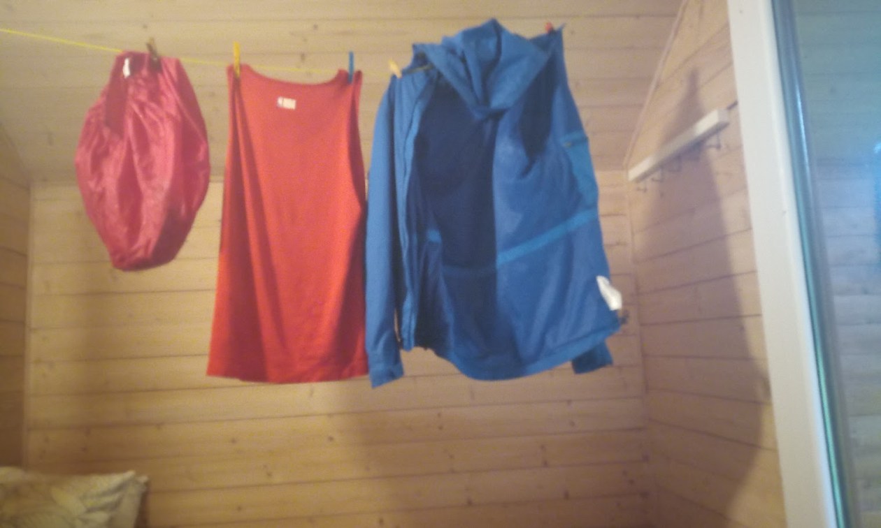 Ich hielt mich da nicht lange auf und zum Glück konnte ich eine Hütte für 37 € mieten. Die war natürlich unbeheizt und im Inneren herrschten die gleichen 13°C wie draußen. Ich spannte eine Leine und hing einen Teil meiner Sachen dort auf, den anderen trug ich quer über den riesigen, aber fast leeren Platz zum Wäschetrockner. Ich traf auch das Pärchen, das ich früher getroffen hatte, dort wieder. Sie zelteten an einem überdachten Tisch mutig und hatten das Wetter deutlich besser als ich überstanden. Ihre Regenjacken von Marmot und Patagonia waren dicht geblieben, obwohl sie schon ein paar Jahre alt waren. Aber erst einmal fror ich und verkroch mich in meiner Hütte unter meiner Bettdecke und wartete darauf, dass der Wäschetrockner mit meinen Sachen fertig sein würde. Erst beim späteren Schreiben dieses Blogs bemerke ich lächelnd, dass dieser Campingplatz “Medaus Slénis” heißt, zu Deutsch Honigtal und erinnere mich, dass es dort auch Honig zu kaufen gab.