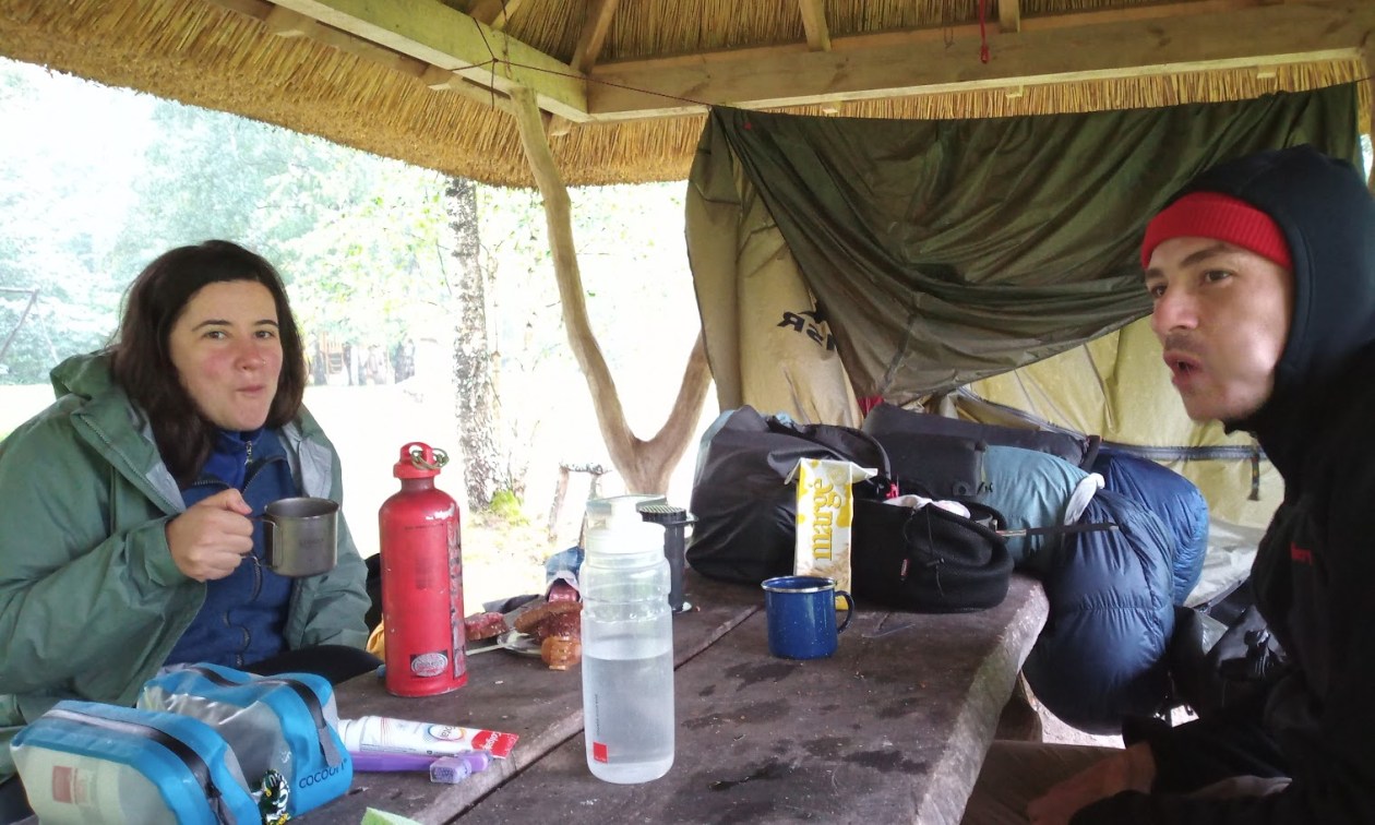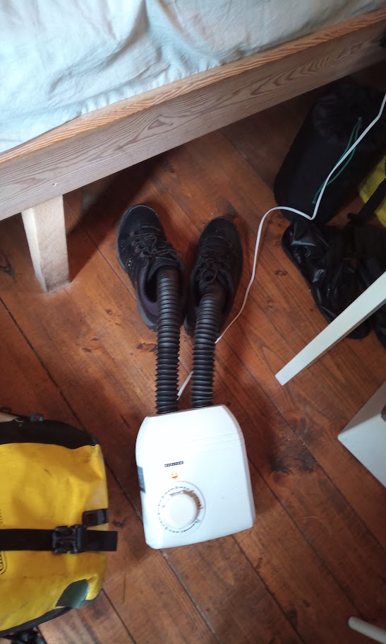 Meine Sachen auf der Leine waren an diesem Morgen noch feucht, so dass ich sie nun auch zum Trockner brachte. Die Sonne schien, aber am Nachmittag (!) sollte es wieder regnen. Ich frühstückte mit dem deutschen Pärchen, deren Namen ich leider vergessen habe. Sie erzählten, dass er aus Dresden und sie aus Köln sei und in Aachen studierten. Ihre Fahrräder hätte er allein zusammengebaut, was ich sehr bemerkenswert fand. Obwohl es sich zuzog, wollten beide bald aufbrechen. Ich schenkte ihnen noch eine meiner Gaskartuschen, denn mit dem, was ich noch hatte, würde ich die letzten 4 Tage locker reichen. Als sie dann aufbrachen, fing es entgegen der Vorhersage schon am Vormittag wieder an zu regnen. Ich rechnete meine restlichen Kilometer durch und entschied, dass ich heute nicht weiterfahre. Die ca. 200 km würde ich auch in 3 Tagen locker schaffen. Ich ging zur Rezeption und verlängerte meine Buchung entsprechend. Dann fragte ich die Dame, ob sie irgendetwas zum Schuhe trocknen hätte, denn meine waren leider noch komplett feucht. Und schon lieh sie mir einen elektrischen Schuhtrockner! Ich wusste gar nicht, dass es so etwas überhaupt gibt und nahm ihn erfreut mit in meine Hütte.