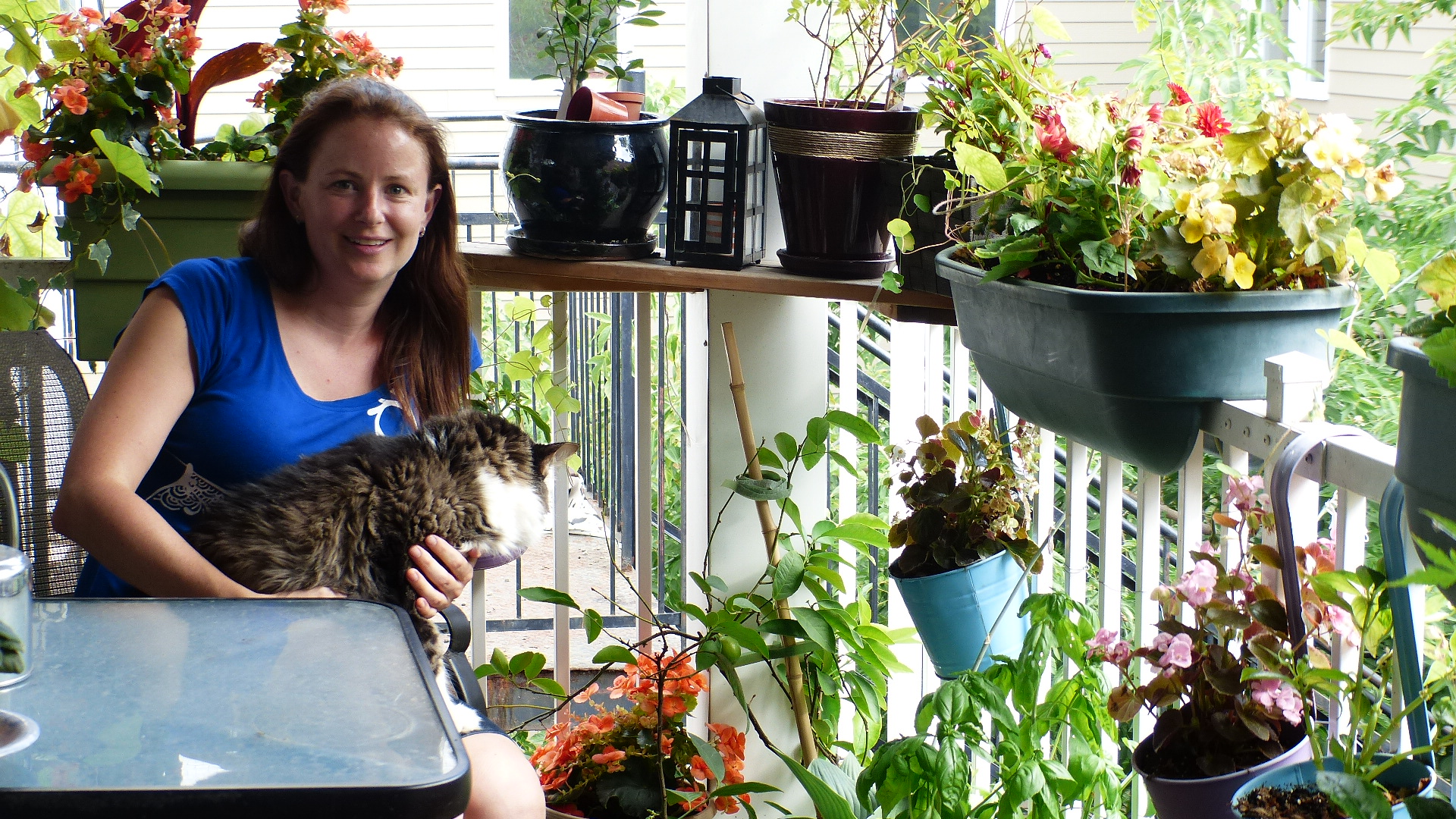 Das ist Jackie auf ihrem Balkon. Sie hat nicht nur Kanada koplett durchquert, sondern vorher auch noch Kalifornien der Länge nach, zusammen 10.000 km in fünf Monaten. Und sie kocht gut und phantasievoll.