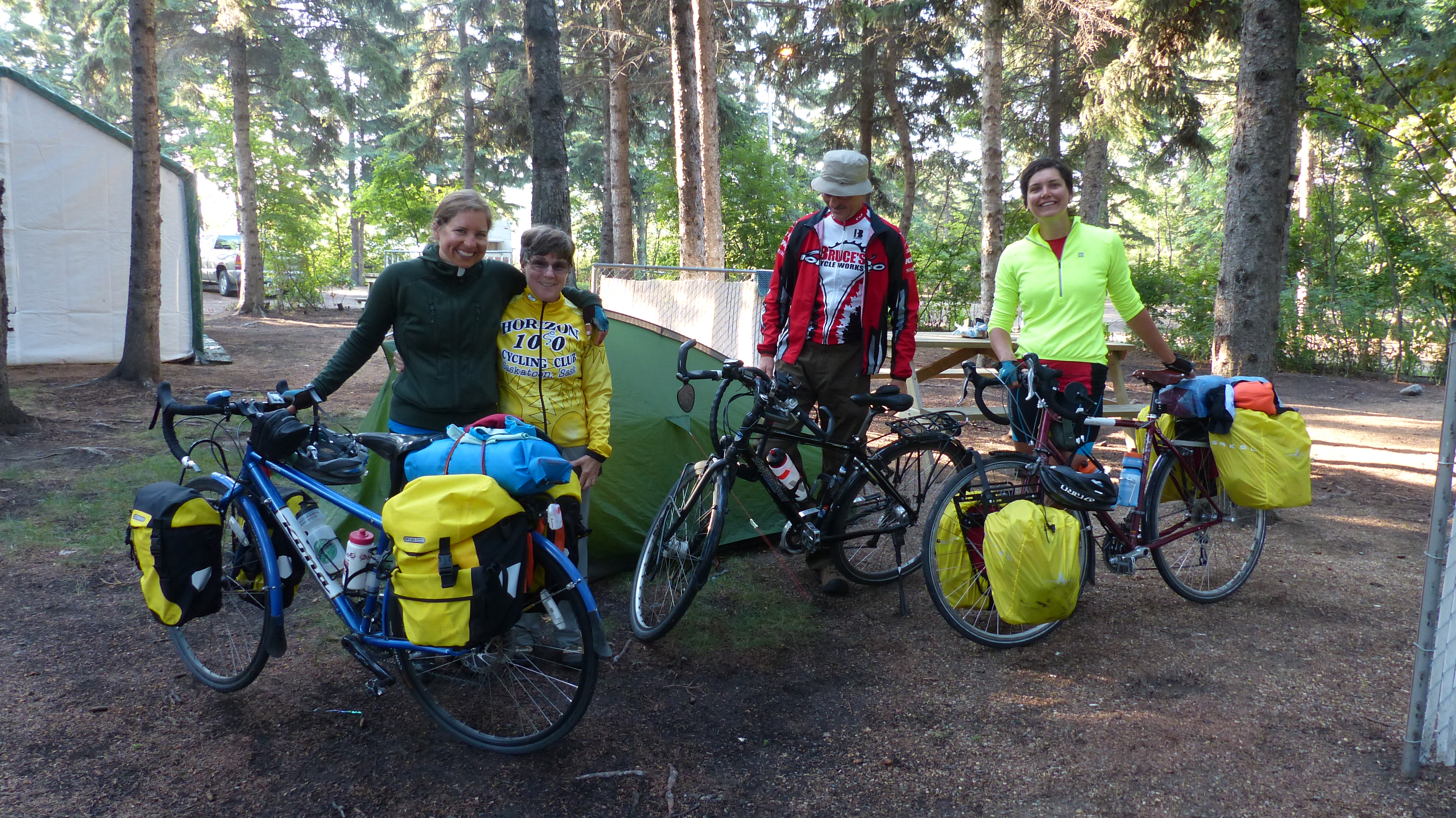 Auf dem Campingplatz in Yorkton traf ich dann als erstes die zwei Mädels (Nr.1, Kristen und Nr.4, Hyla) aus Vancouver, die ebenfalls das Land durchqueren, allerdings im atemberaubenden Tempo von 3 Wochen für bisher ca. 3000 km. Und das ohne Training. 24 müsste man sein … Später traf ich beim Einkaufen ein anderes Paar, Nancy und Ronald, ebenfalls das Land durchquerend und lotste sie zum Campingplatz.. Die haben etwa mein Format.