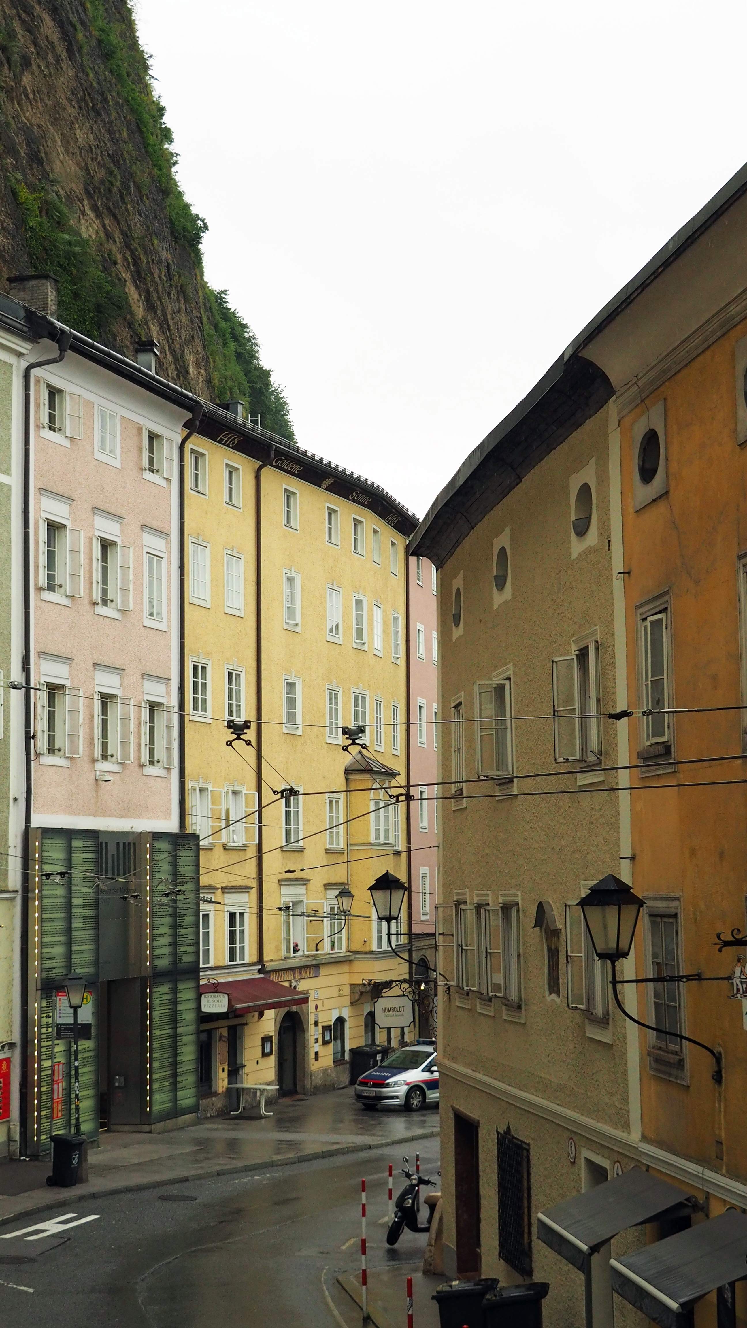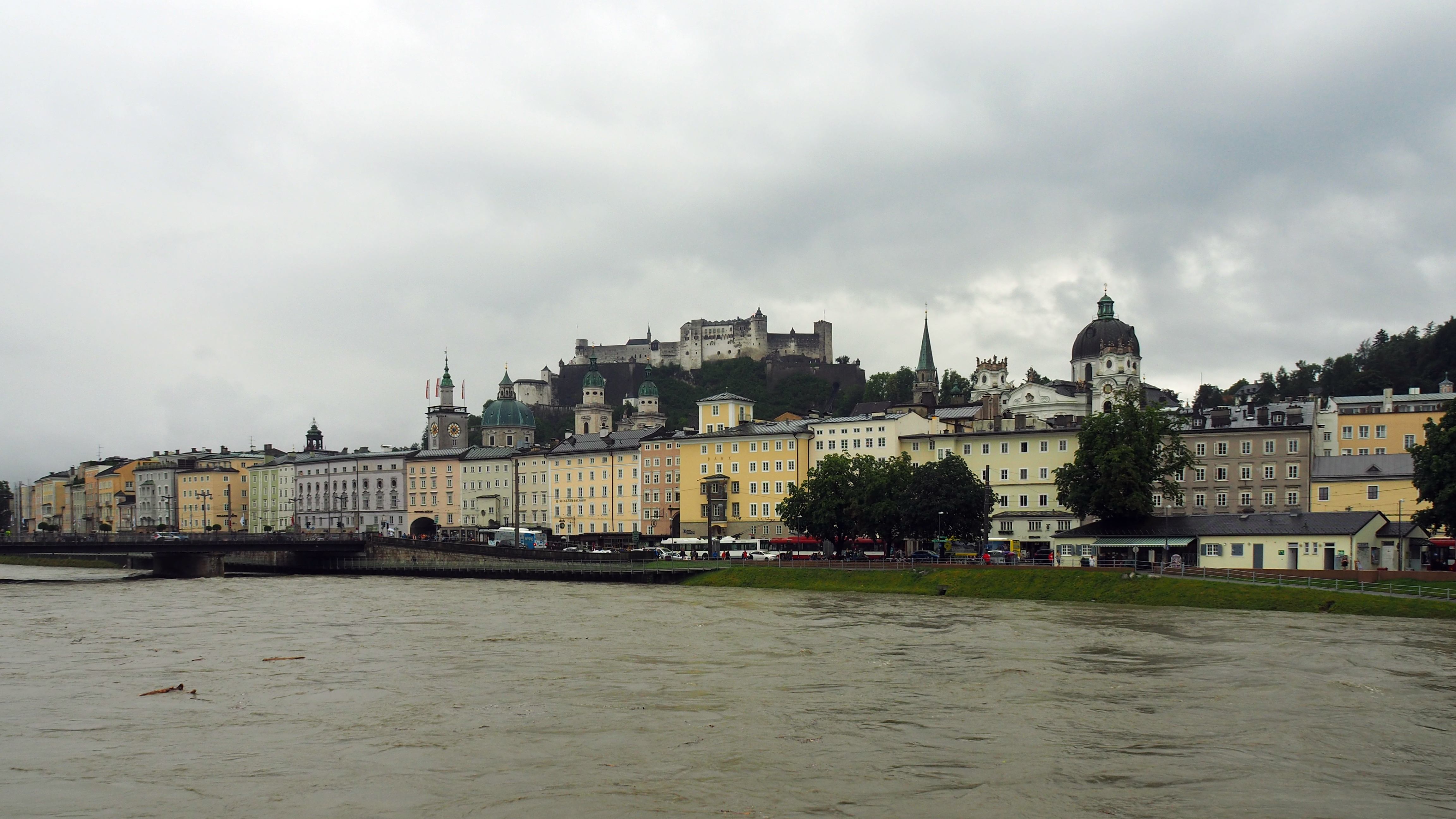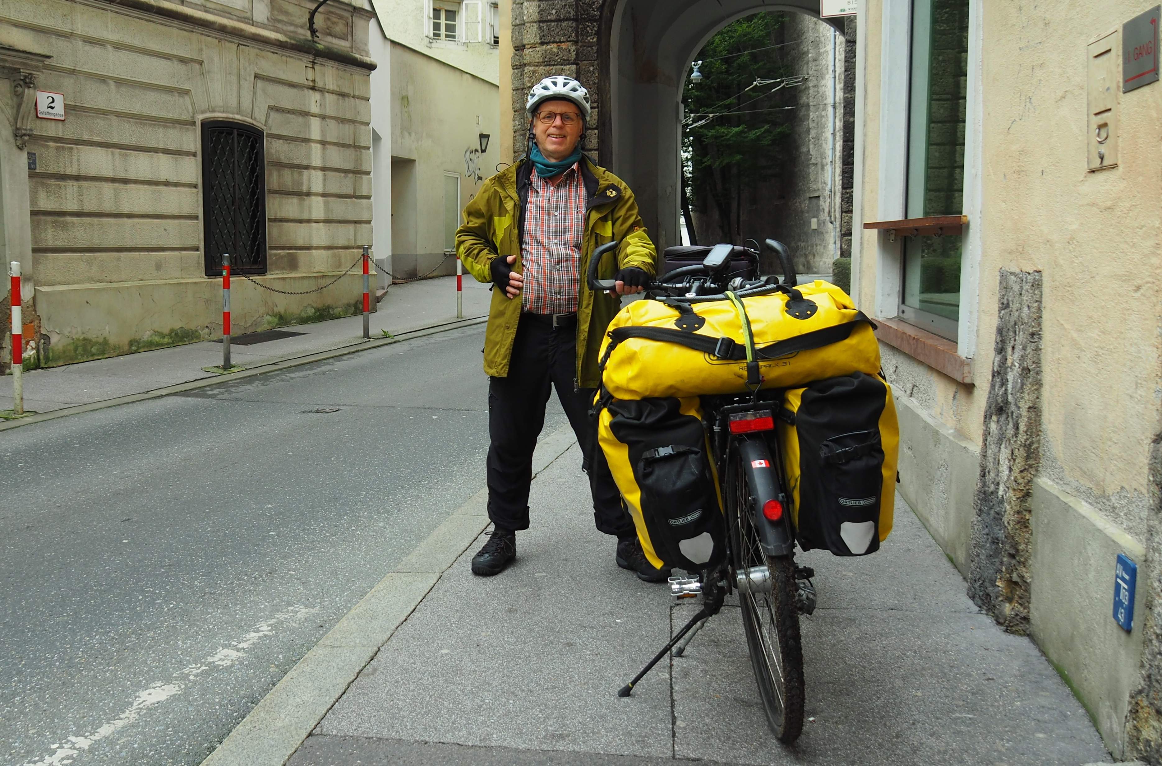 Tag 1: Ich sitze in der Küche meines Gastgebers Benedikt in Salzburg. Eine Ersatzlösung von einem „warmshowers“-Gastgeber vermittelt, der mich selbst nicht unterbringen konnte und in seiner Radfahrergruppe gefragt hatte, ob jemand einspringen kann. Gestern Abend bin ich nach einer 12-stündigen stressigen Zugfahrt mit viermal Umsteigen aus Berlin hier angekommen. Der vorhergesagte Regen begann wenige Minuten nach meiner Ankunft in der Gstettengasse. Es pladderte die ganze Nacht auf ein Blechdach und während ich auf meinem Bett in einem fast lichtlosen, stickigen Durchgangszimmer lag, begleitete mich dieses Geräusch. Ich konnte es nicht abstellen, weil ich sonst die Tür zur Veranda hätte schließen müssen und womöglich erstickt wäre …