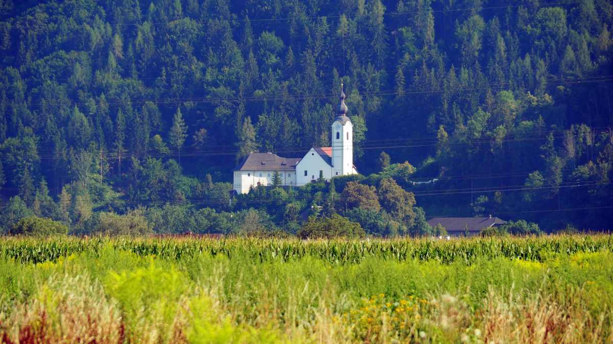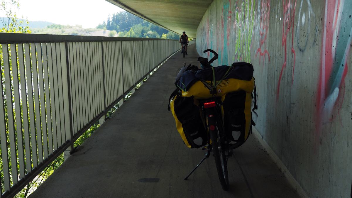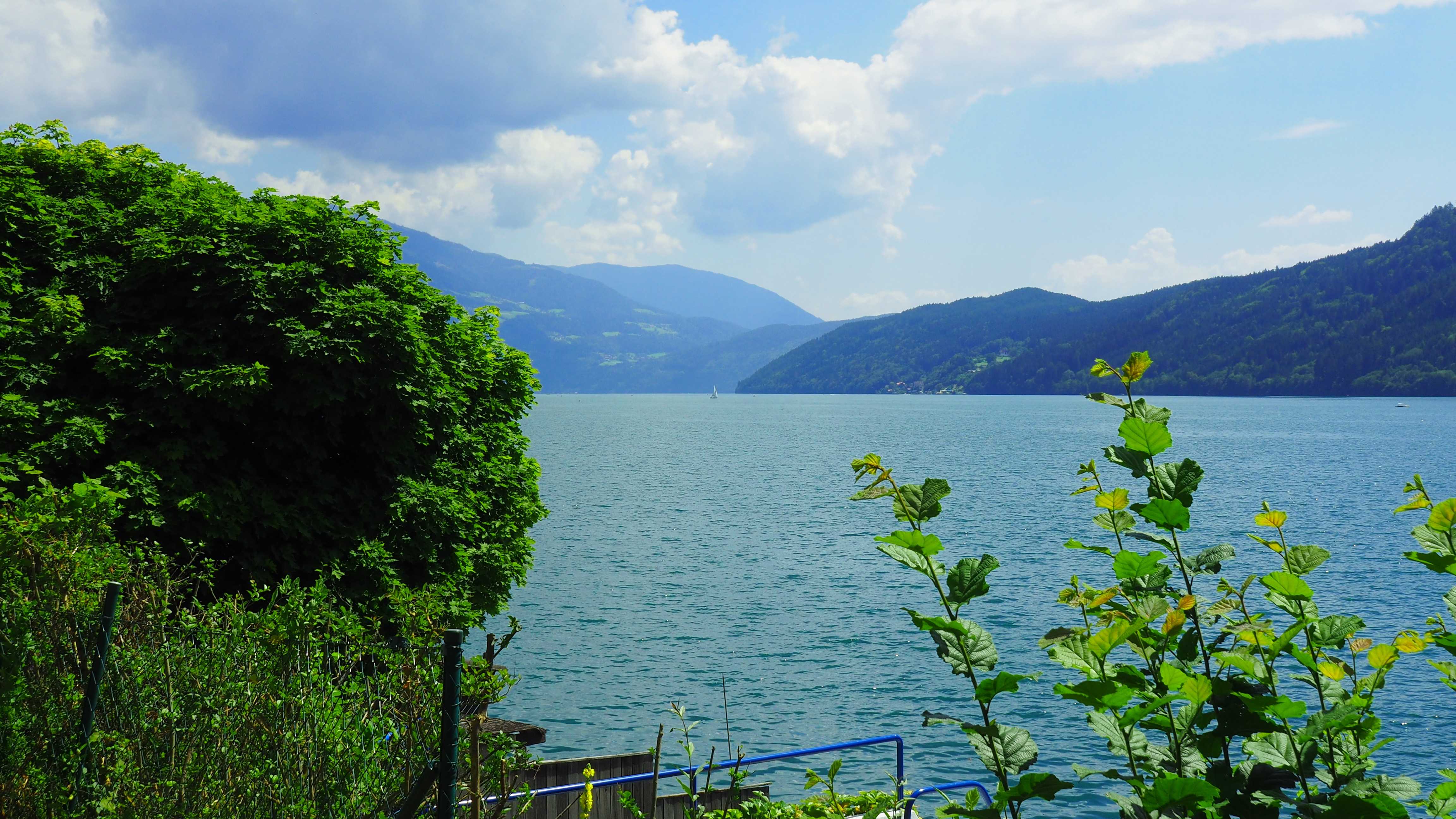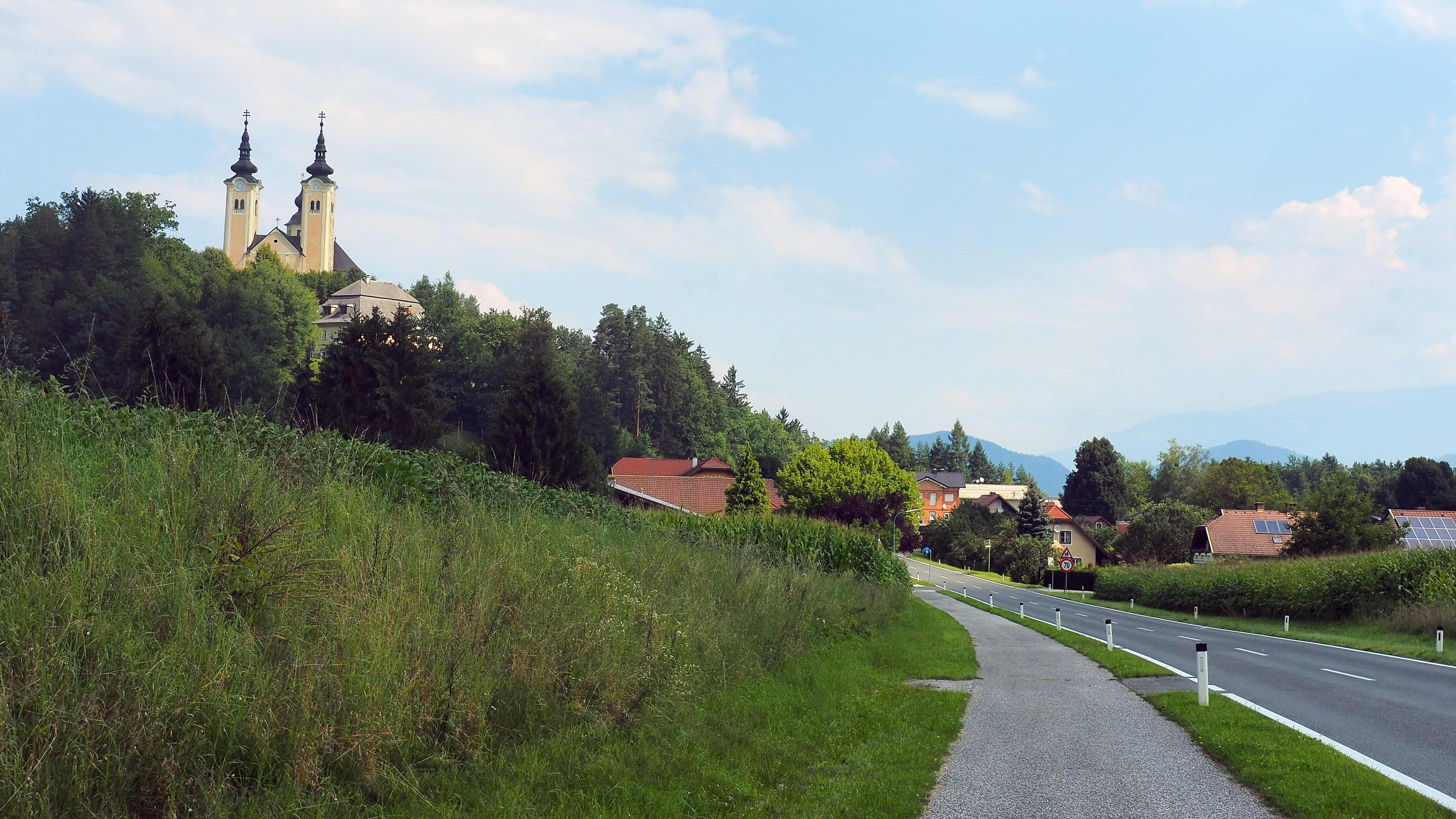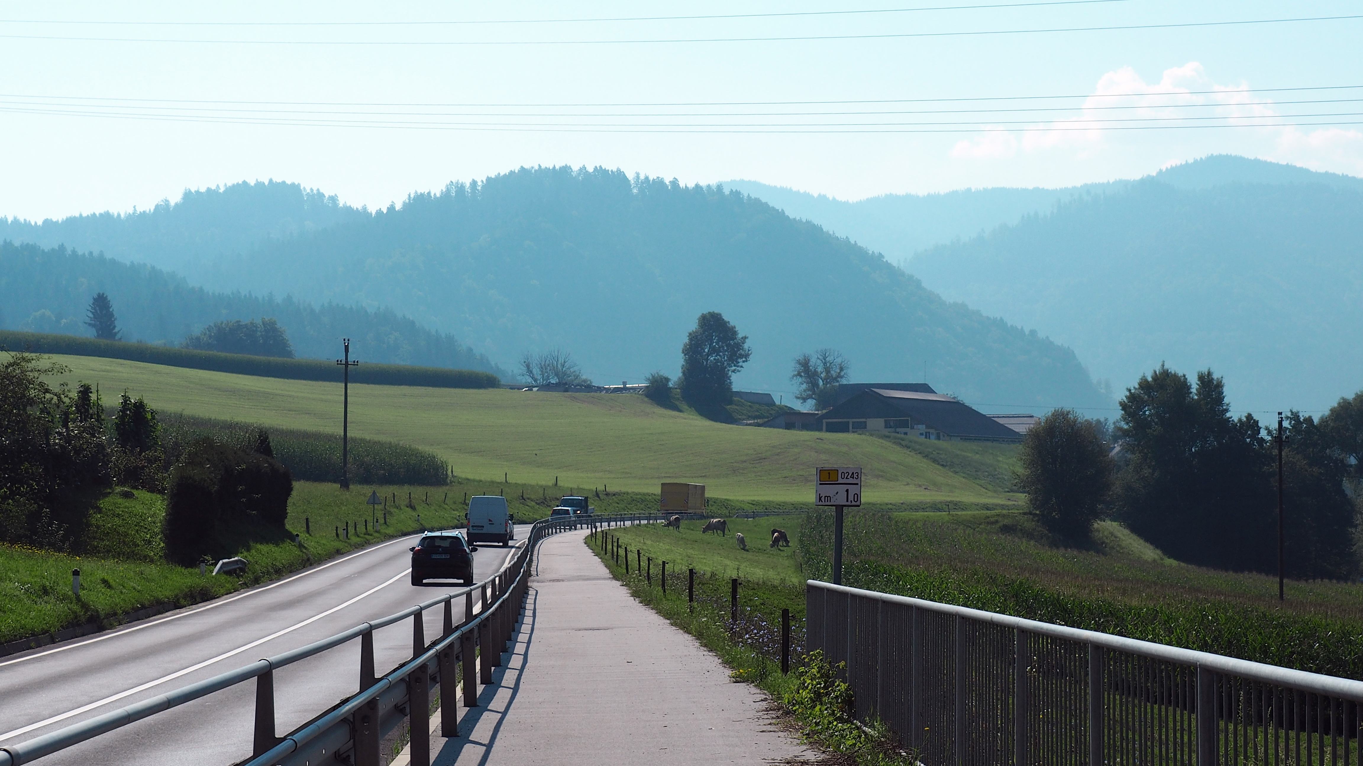 Tag 6 (Etappe 4). Morgens ausgiebiges Schwimmen im Ossiacher See, kurz nach Sonnenaufgang. Die Hitze nahm zu, es war aber nicht so schlimm wie laut Nachrichten gerade in Frankreich und Deutschland. Wie auch immer, die 30 ° C hier fühlten sich für mich wie 35°C an. Die Hitze machte mich schneller müde als ich es mir lieb war. Nach einem doppelten Espresso in Klagenfurt fühlte ich mich auf den letzten 25 km wieder etwas fitter. Mein auf einer Bank liegen gelassenes Handy lag, oh Wunder, immer noch da … 15 Minuten Schreck waren vorbei. (Richtig verloren habe ich es dann erstmalig nach meiner Rückkehr in Brandenburg, zum Glück kein teures Smartphon). Der Weg führte ein gutes Stück schnurgerade an einer Bahnstrecke entlang, bis es später kurz und steil bergan ging. Ich lernte durch eine Informationstafel, dass dieses Gebiet nur dank einer gewonnenen Volksabstimmung 1919 nicht Slowenien zugeschlagen wurde. Dann hielt ich bei einem plötzlich am Wegesrand auftauchenden Bed & Breakfast an und bekam ein freies Zimmer, änderte also spontan meinen Plan, diese Nacht irgendwo zu campen. Denn 35 €, die es kosten würde, waren heute für mich okay. Mit Frühstück! Ein altes Ehepaar, weit über 80 vermietete einen Teil des Hauses. Später grummelte die alte Dame, dass 35 € viel zu wenig wären… naja, da hat sie leider Pech gehabt, ich hätte ja auch weiterfahren können.