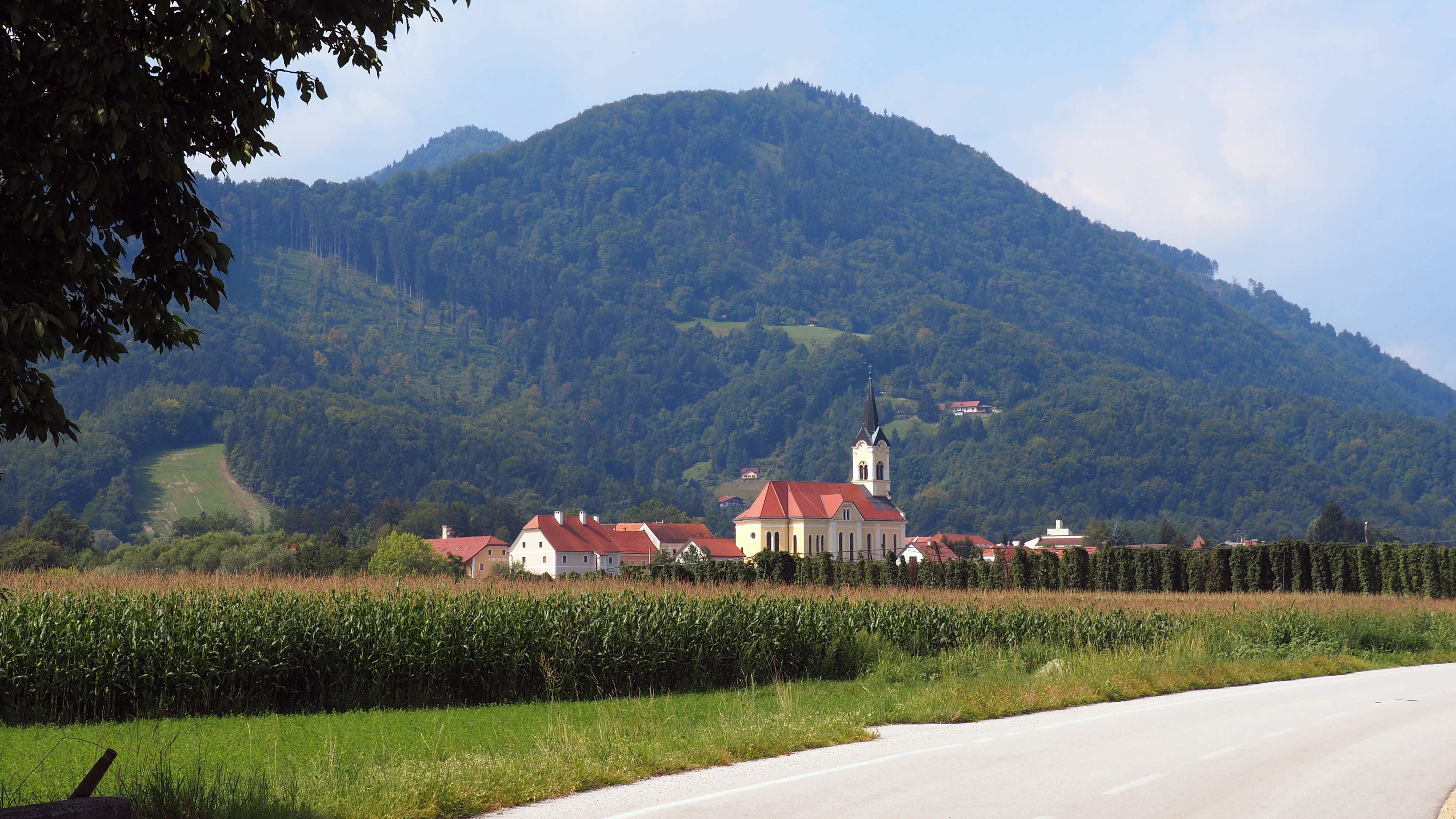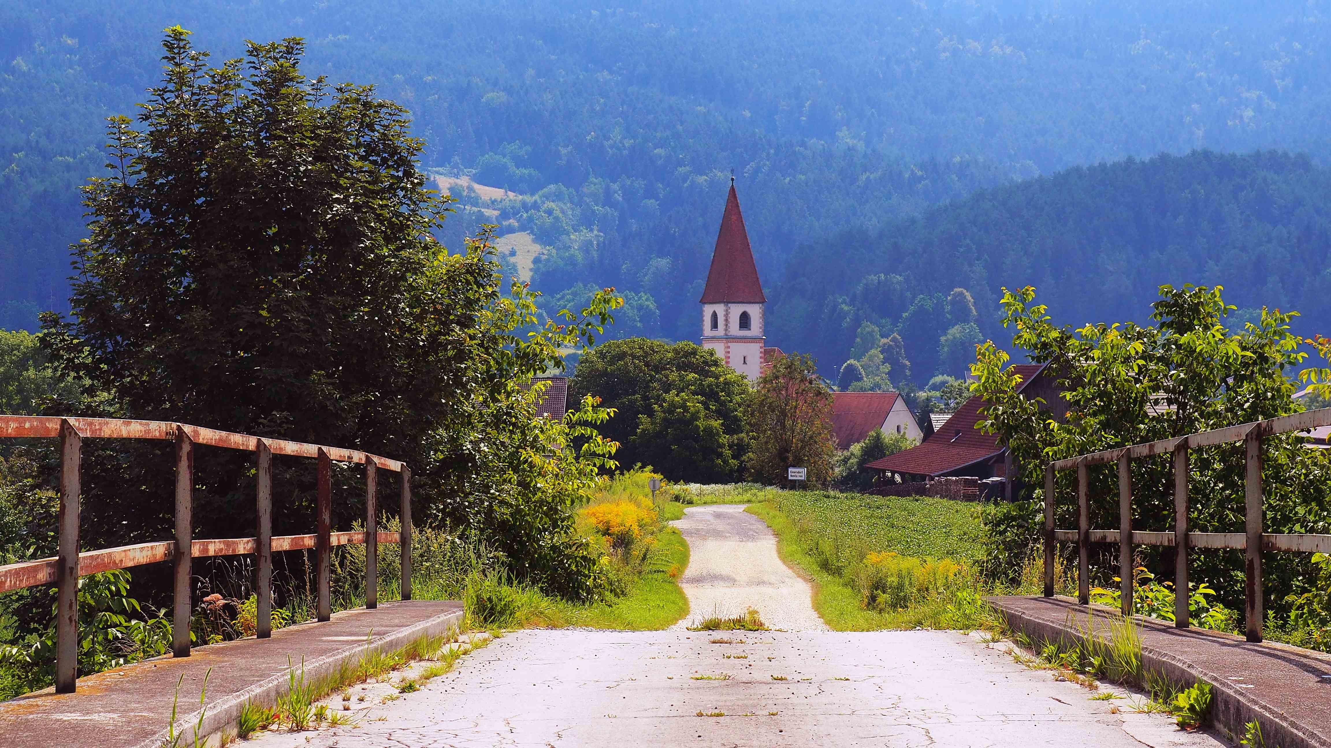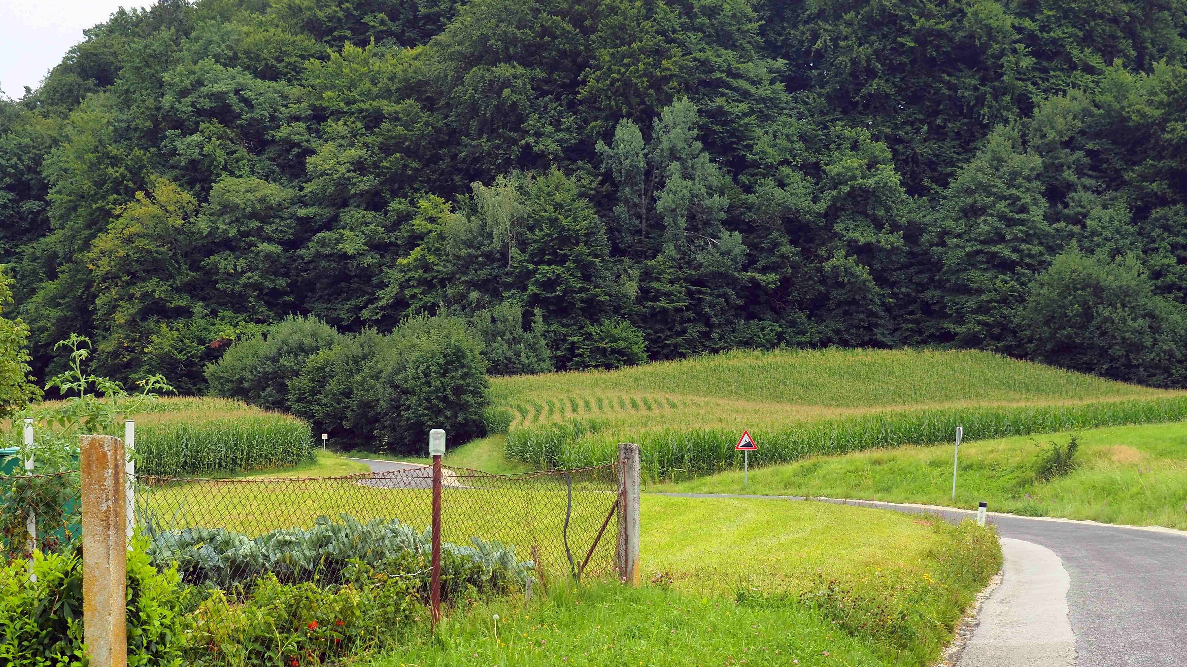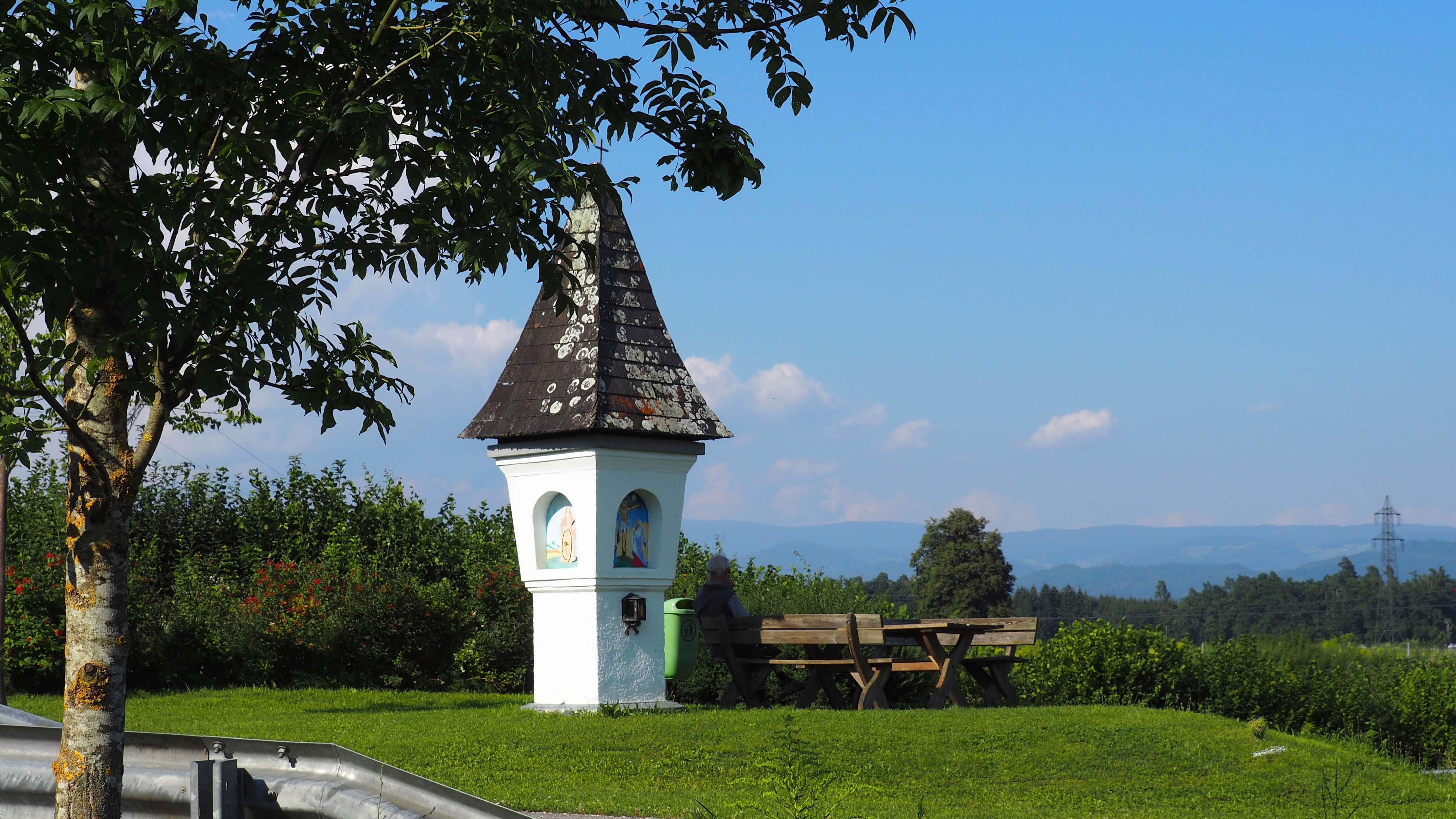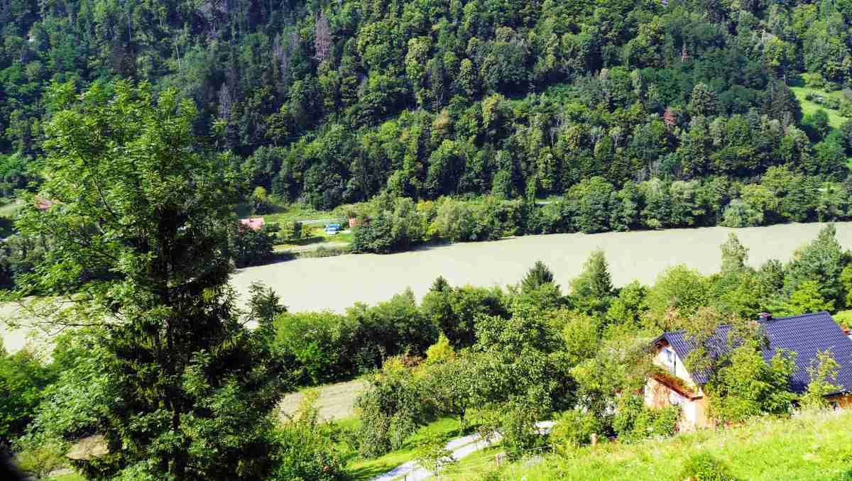 Tag 6 (Etappe 4). Morgens ausgiebiges Schwimmen im Ossiacher See, kurz nach Sonnenaufgang. Die Hitze nahm zu, es war aber nicht so schlimm wie laut Nachrichten gerade in Frankreich und Deutschland. Wie auch immer, die 30 ° C hier fühlten sich für mich wie 35°C an. Die Hitze machte mich schneller müde als ich es mir lieb war. Nach einem doppelten Espresso in Klagenfurt fühlte ich mich auf den letzten 25 km wieder etwas fitter. Mein auf einer Bank liegen gelassenes Handy lag, oh Wunder, immer noch da … 15 Minuten Schreck waren vorbei. (Richtig verloren habe ich es dann erstmalig nach meiner Rückkehr in Brandenburg, zum Glück kein teures Smartphon). Der Weg führte ein gutes Stück schnurgerade an einer Bahnstrecke entlang, bis es später kurz und steil bergan ging. Ich lernte durch eine Informationstafel, dass dieses Gebiet nur dank einer gewonnenen Volksabstimmung 1919 nicht Slowenien zugeschlagen wurde. Dann hielt ich bei einem plötzlich am Wegesrand auftauchenden Bed & Breakfast an und bekam ein freies Zimmer, änderte also spontan meinen Plan, diese Nacht irgendwo zu campen. Denn 35 €, die es kosten würde, waren heute für mich okay. Mit Frühstück! Ein altes Ehepaar, weit über 80 vermietete einen Teil des Hauses. Später grummelte die alte Dame, dass 35 € viel zu wenig wären… naja, da hat sie leider Pech gehabt, ich hätte ja auch weiterfahren können.